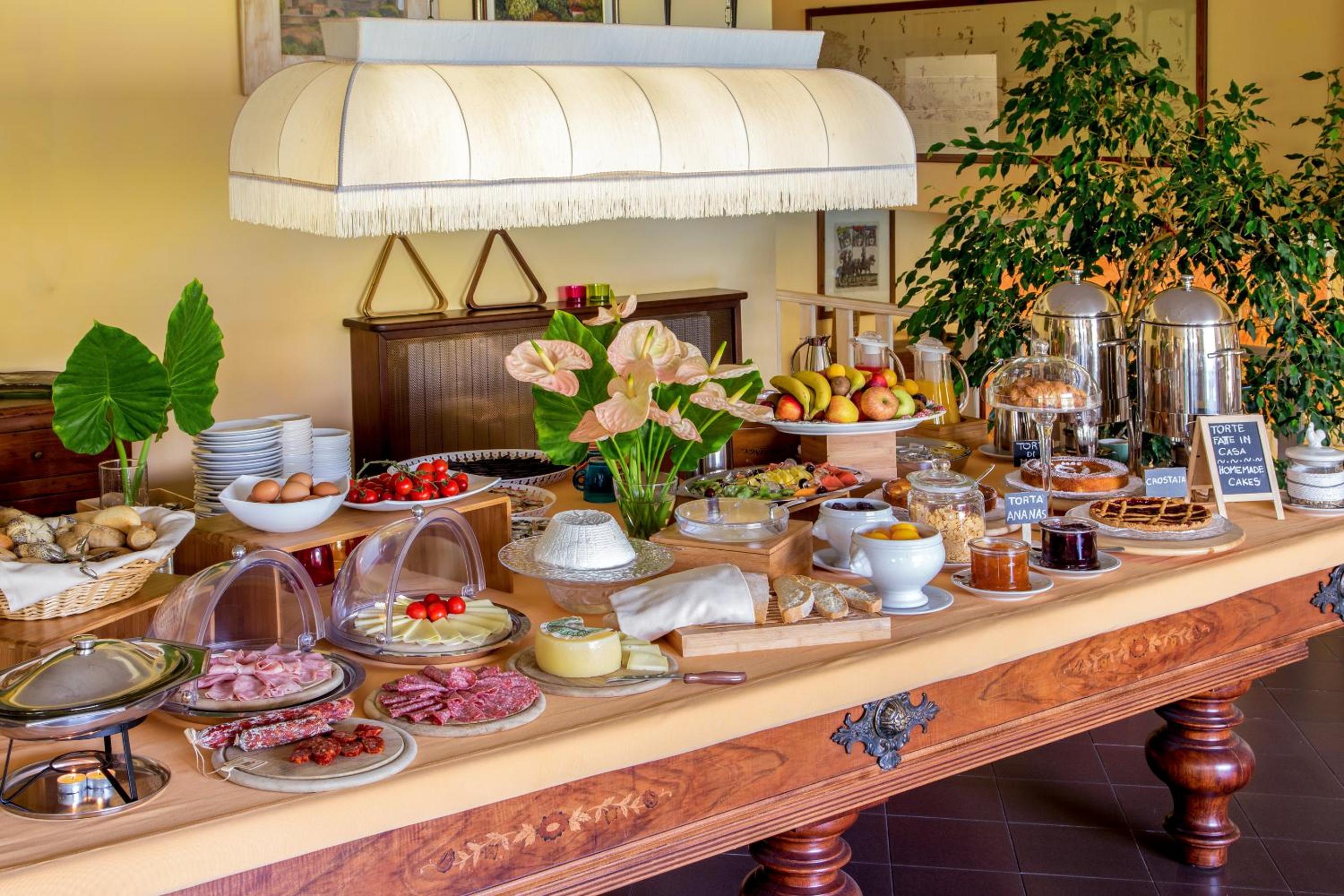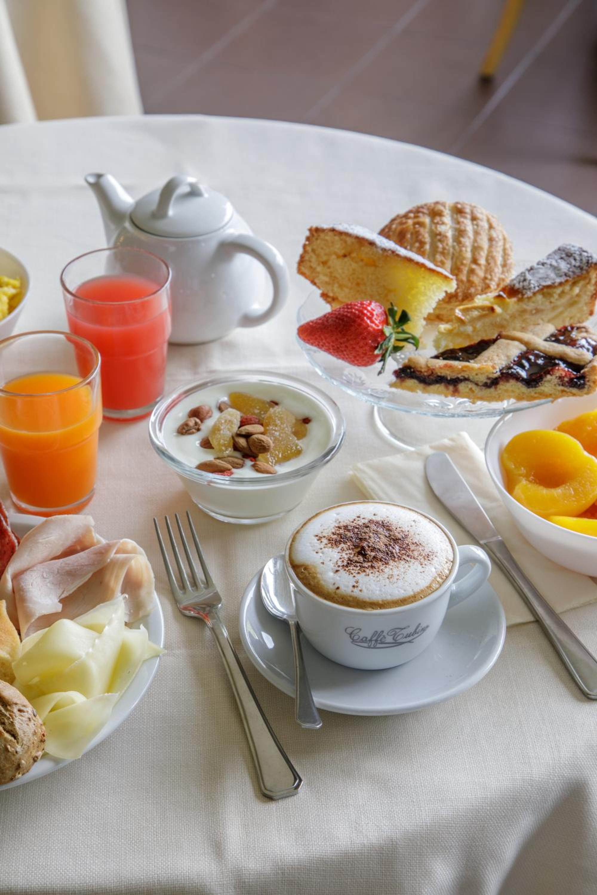 Indulge in a scrumptious morning feast with a rich buffet including freshly baked cakes, fruits, cold cuts, and cheeses, ensuring a delightful start to your day.