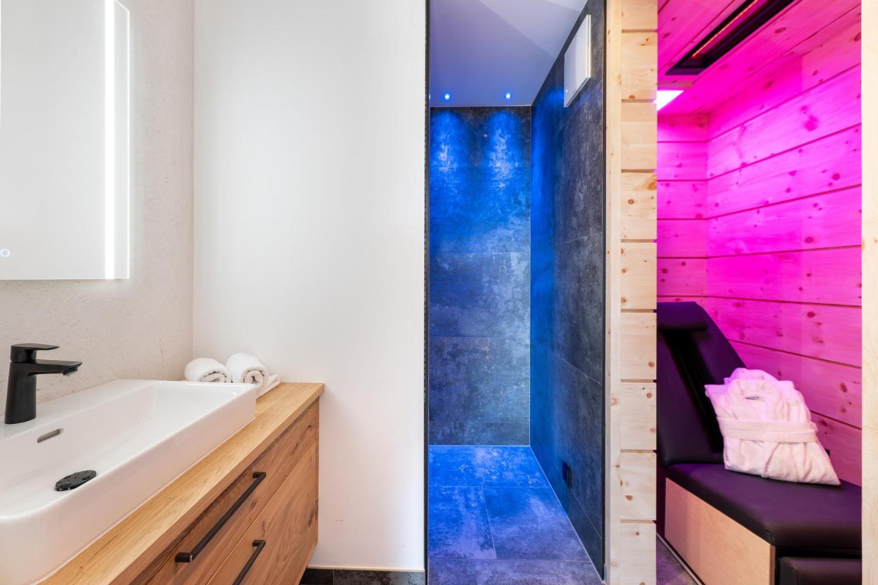 Indulge in relaxation at the AlpenSchlössl's spa area with both an indoor and outdoor pool, sauna, steam bath, and available massage treatments. Unwind and rejuvenate in style.