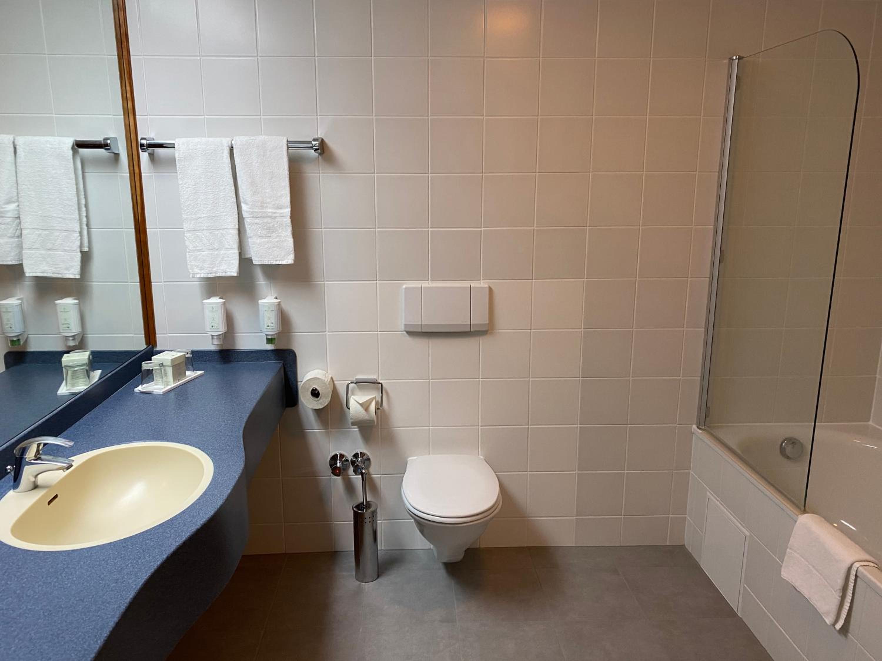 Schmutzige Handtücher an 2 Tagen. Desolater Waschtisch, Duschkopf massiv verkalkt. Solettibrösel auf den Sesseln im Zimmer.