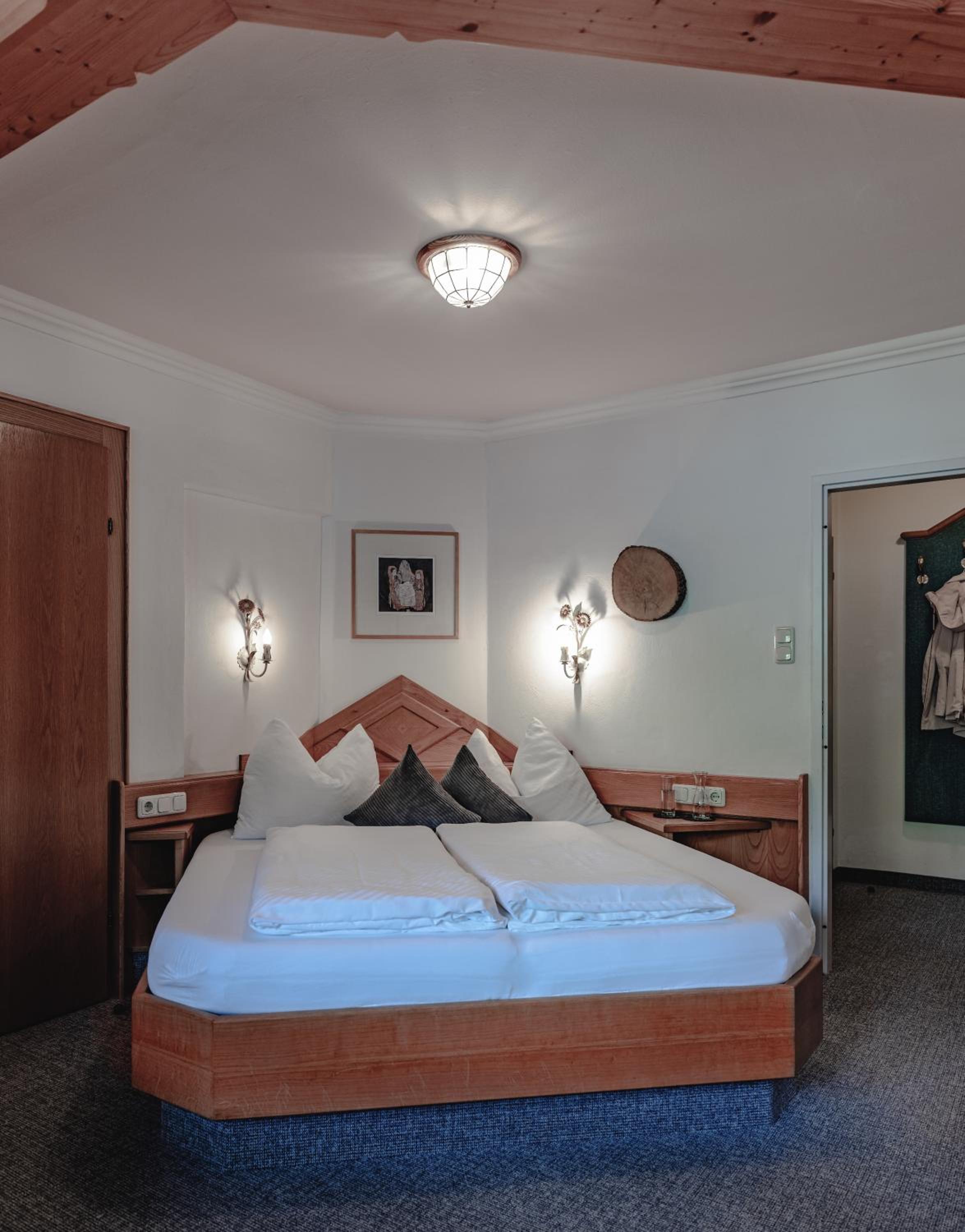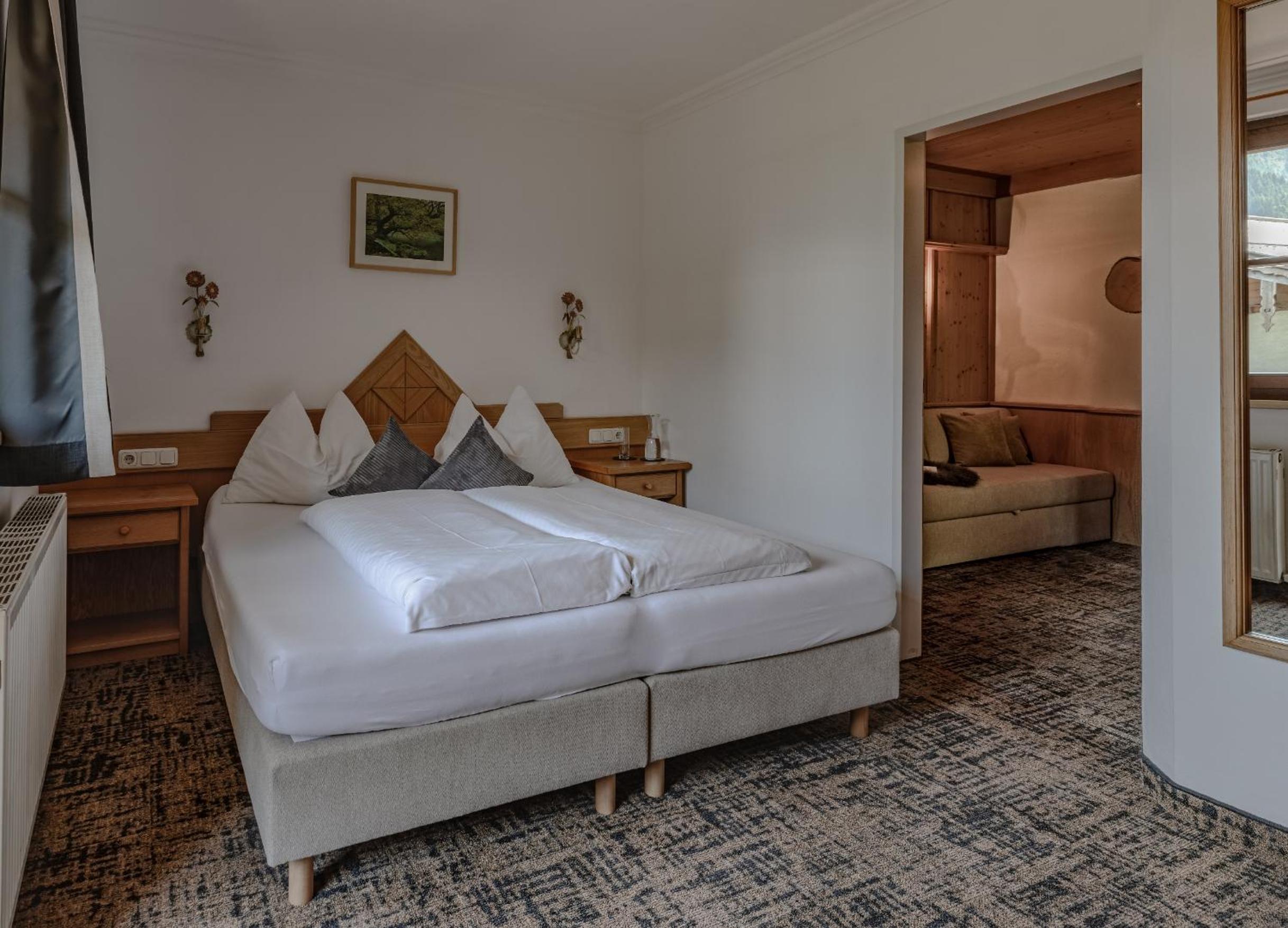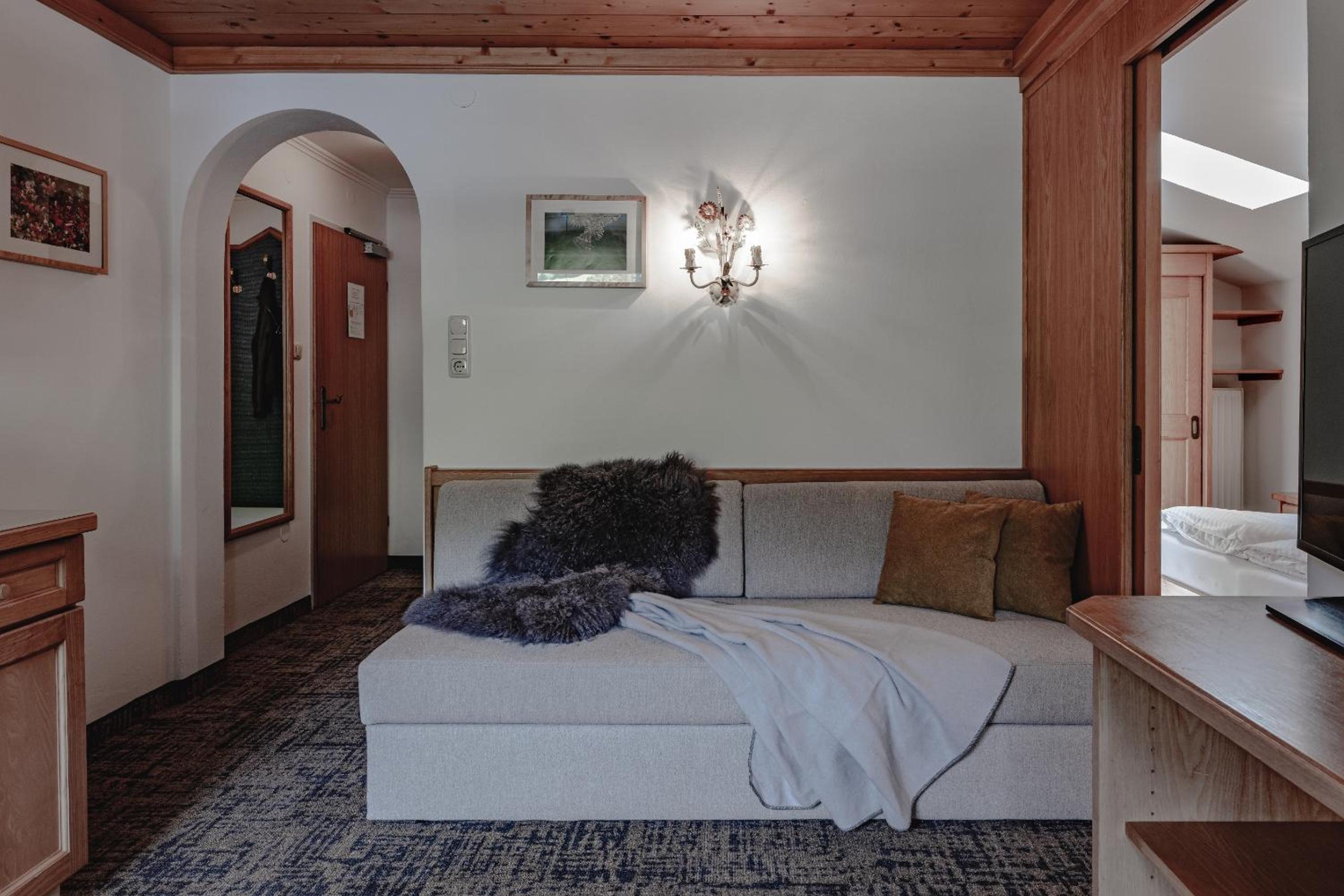 Cozy Alpine Accommodations: Retreat to rooms adorned in classic Alpine decor, featuring hand-carved wooden furniture and modern amenities. Most rooms boast balconies with stunning views.