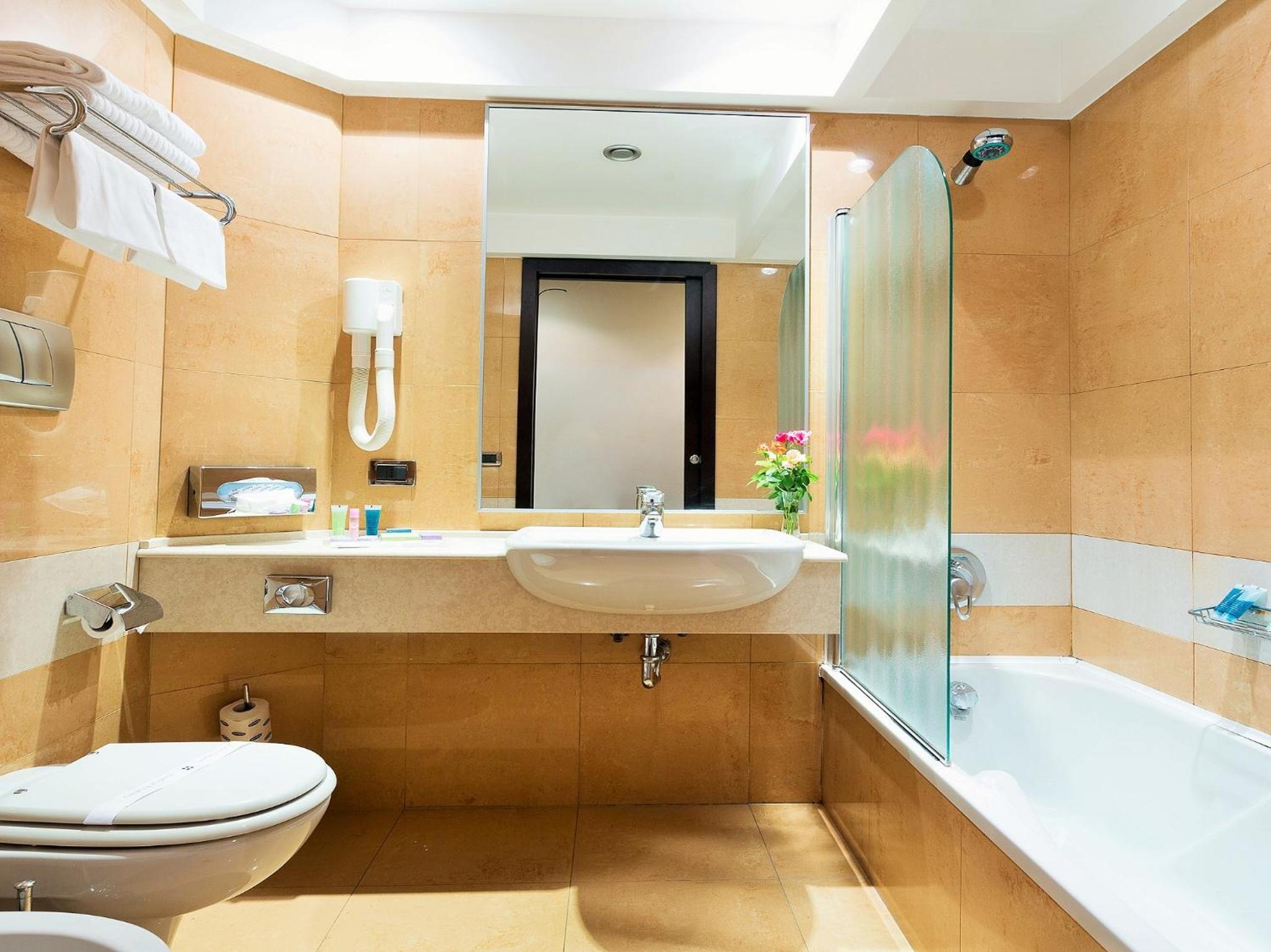 Indulge in the elegance of our rooms at Hotel IMPERATORI, equipped with free Wi-Fi, air conditioning, and satellite TV. Relax in the marble bathroom with a luxurious bath or shower.