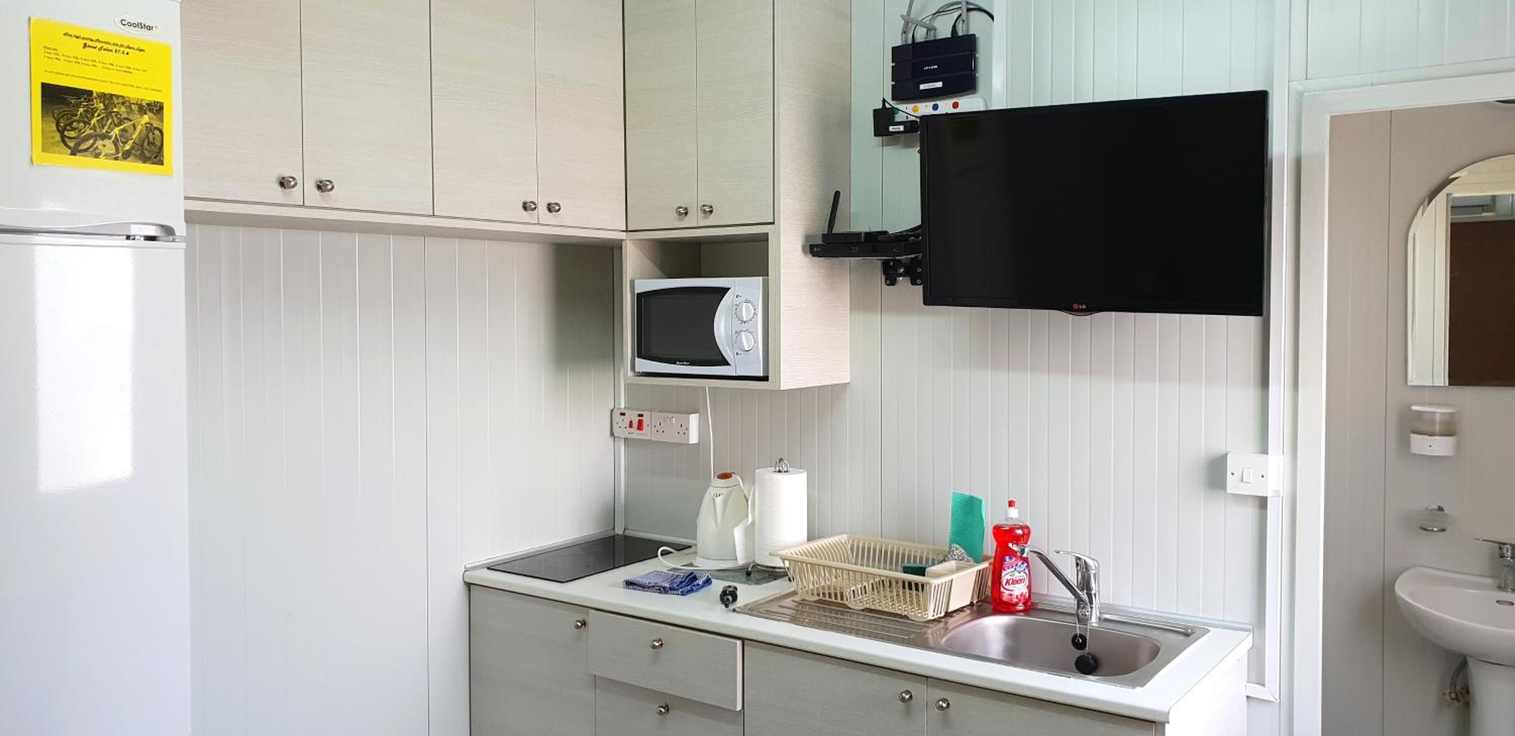 Everything there you could possibly need for self catering,generous freebies left including two bottles of wine. Extra sheets and towels ,heaps of cleaning stuff. All free movies etc on TV.