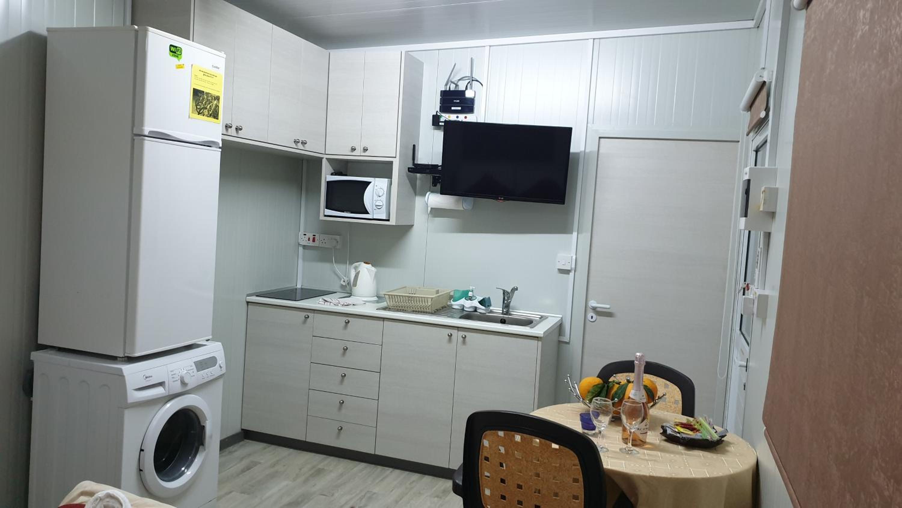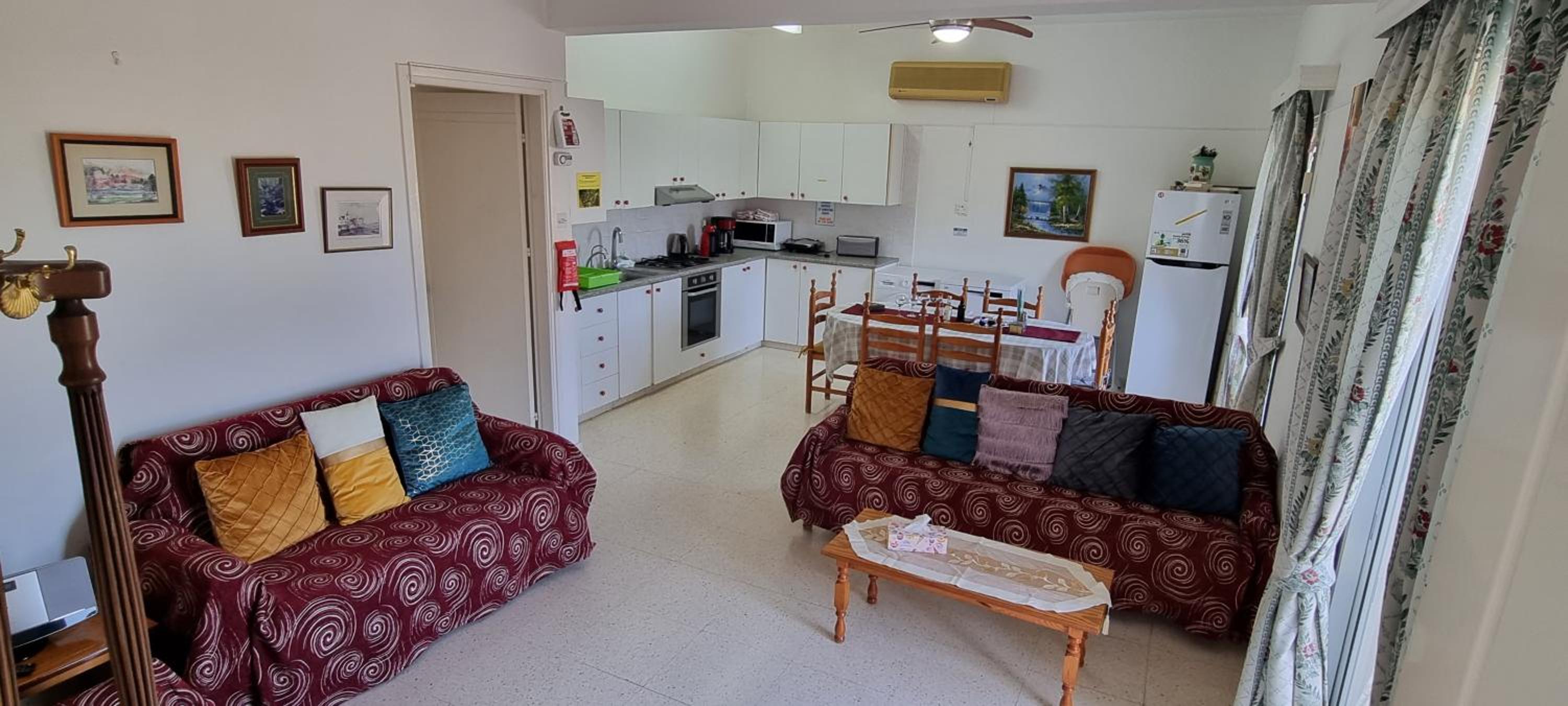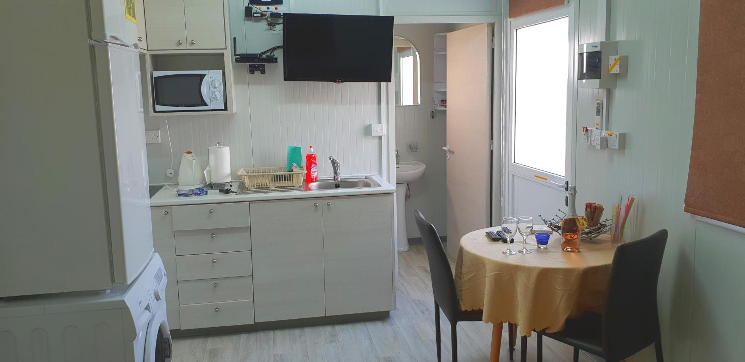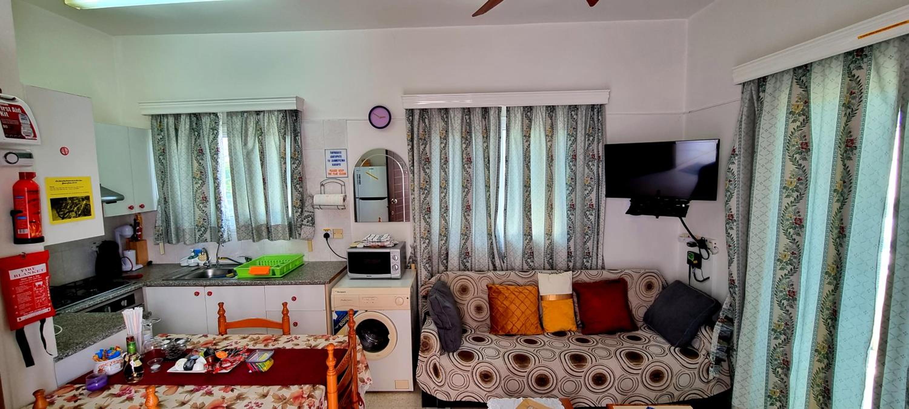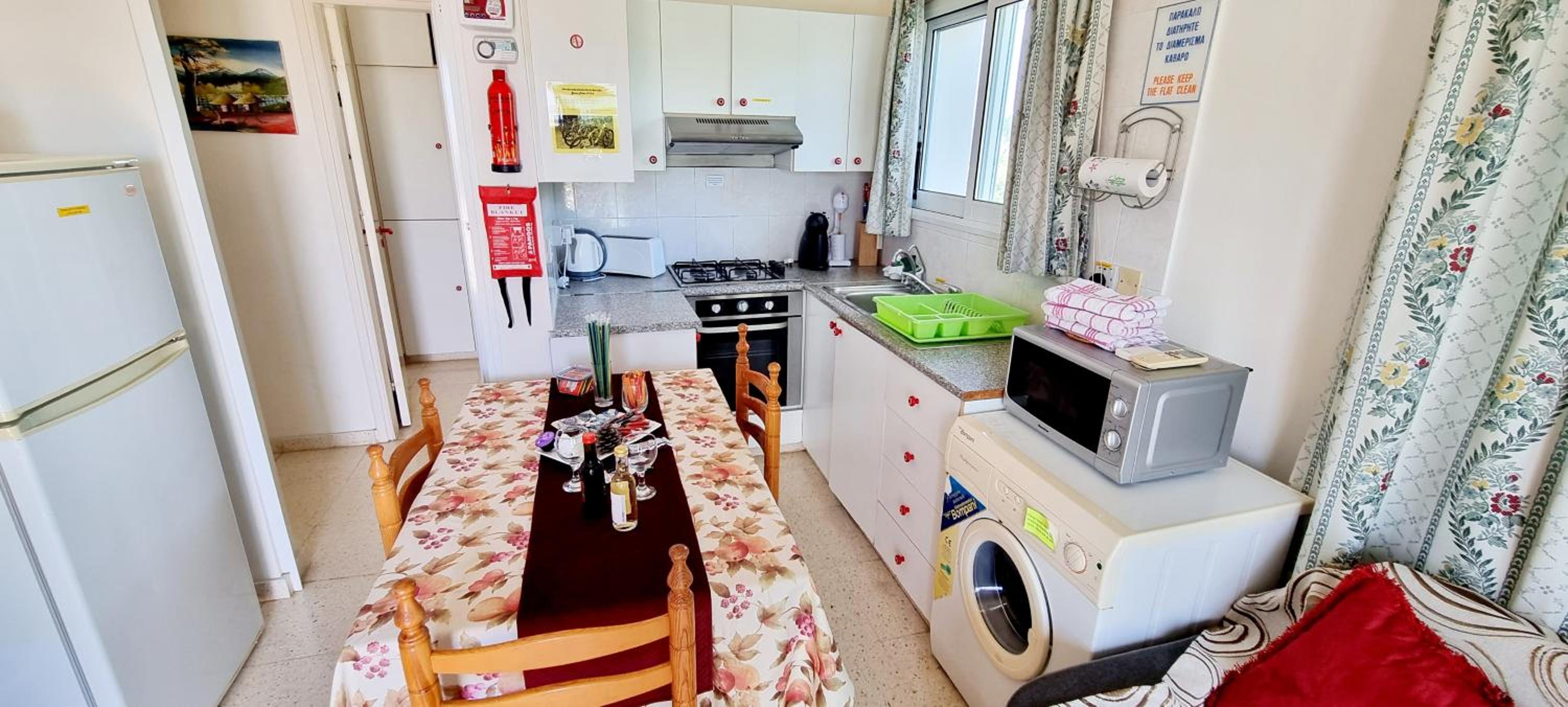 Everything you need for self catering and some. Complentary coffee,wine and all the cleaning products you would ever need. Really handy to have a washing machine,tv all channels all free. Air con which I only used on last morning as it was raining and chilly. Will always come to stay here