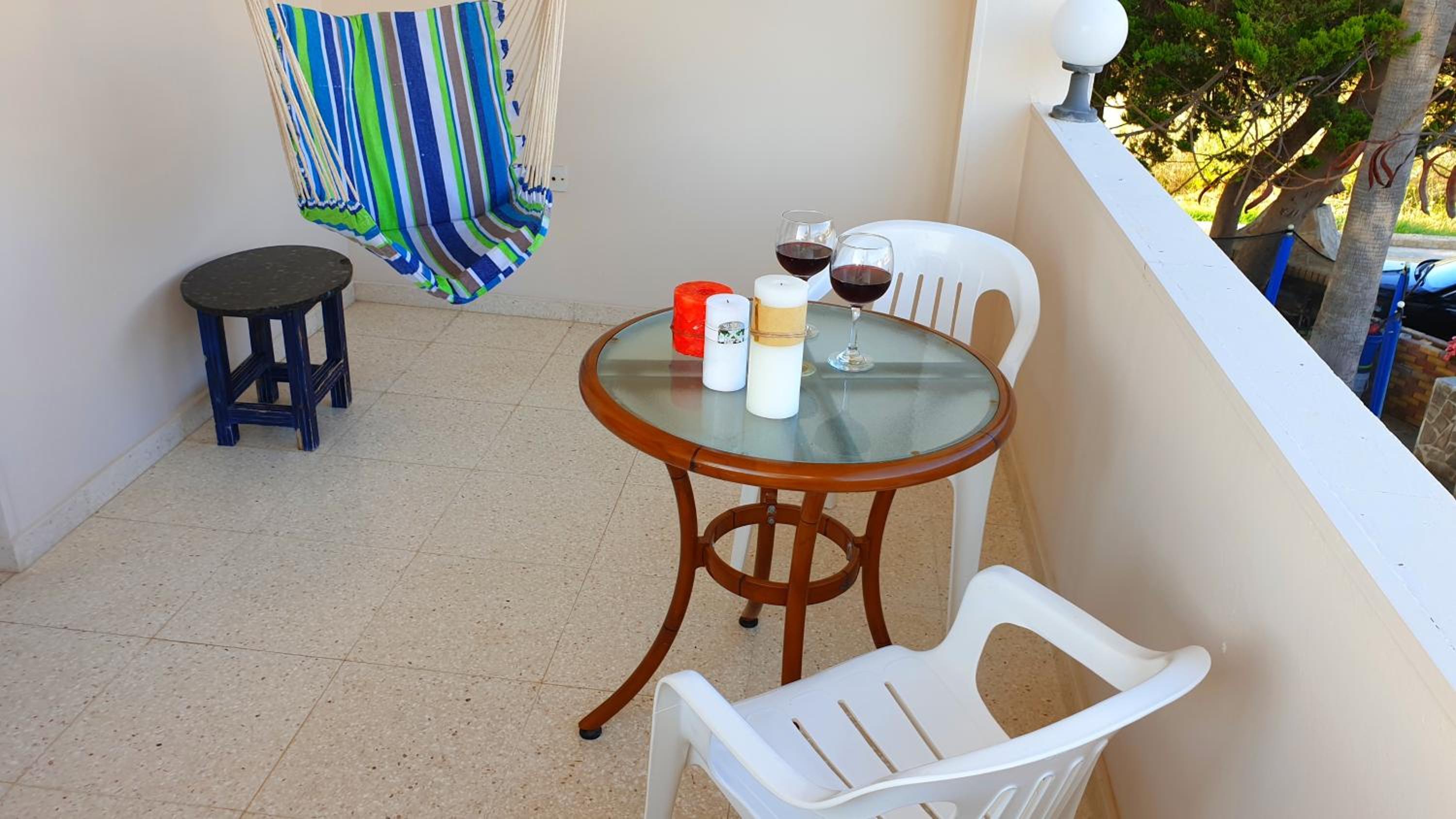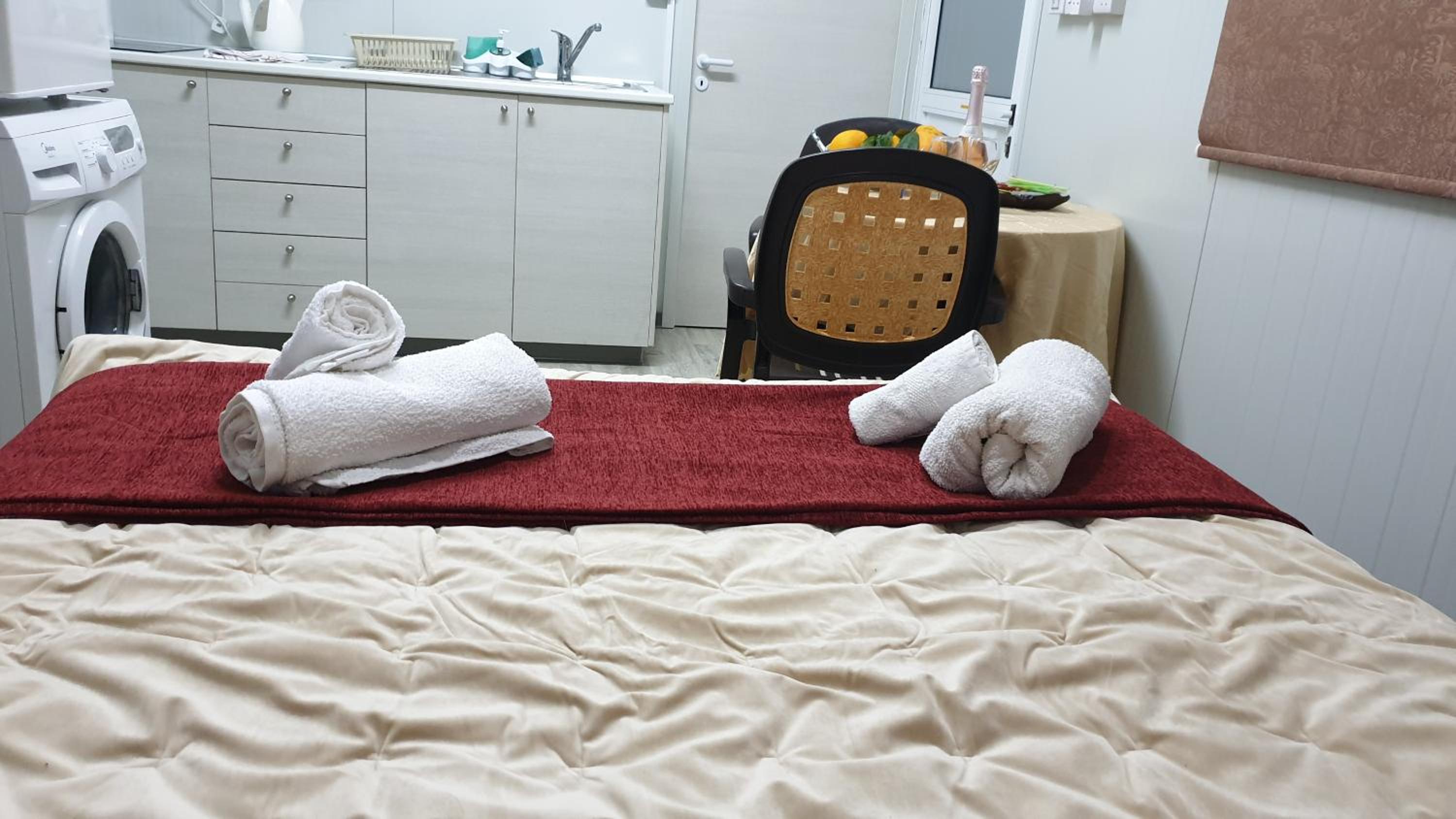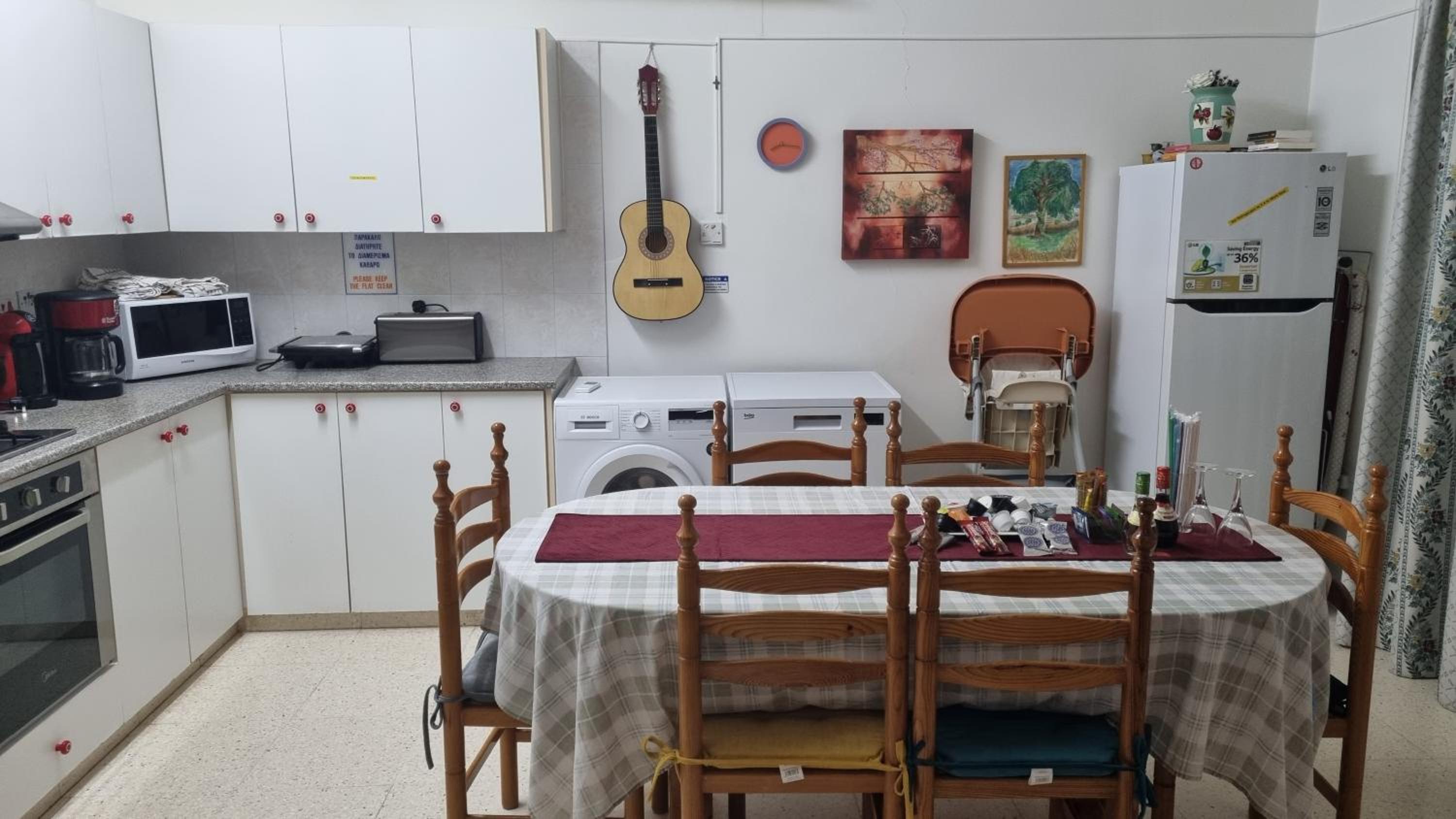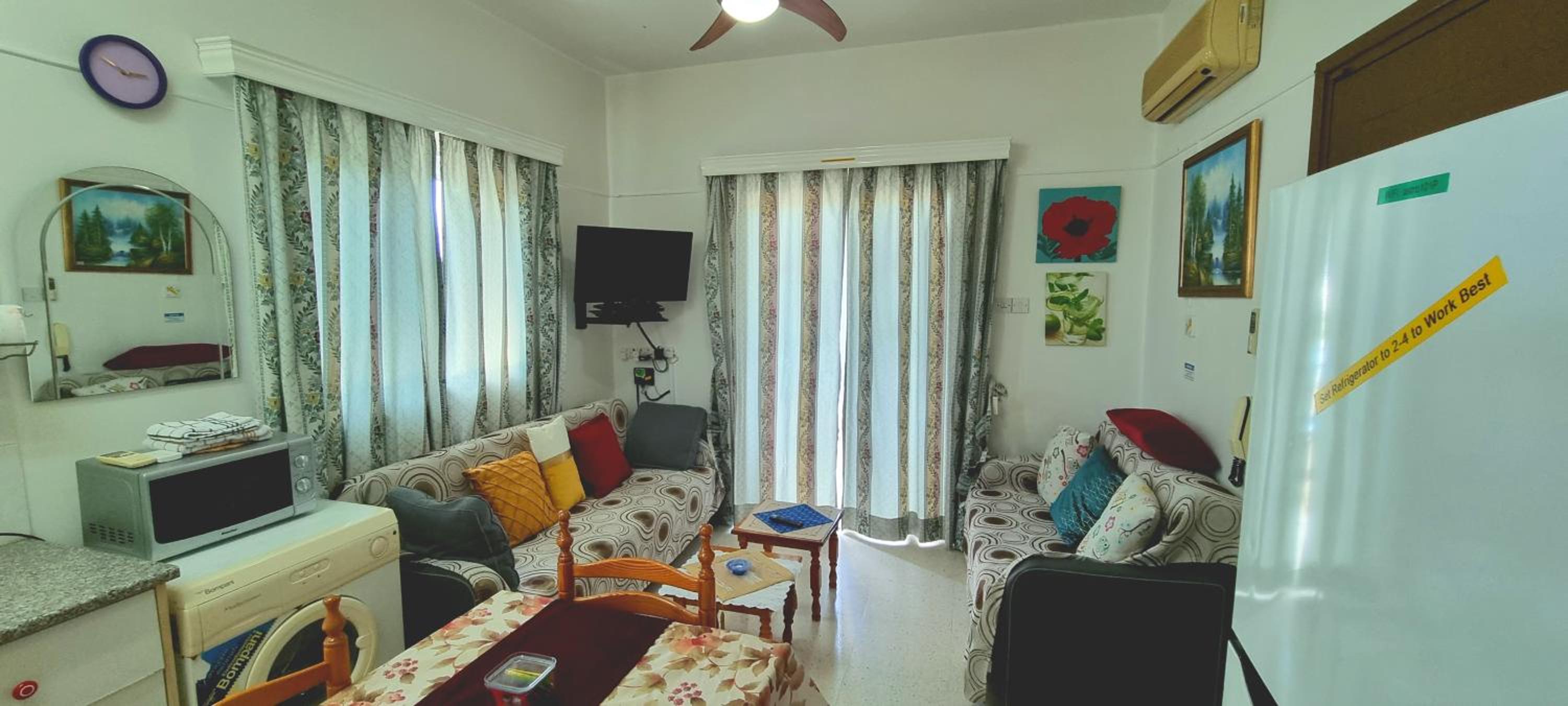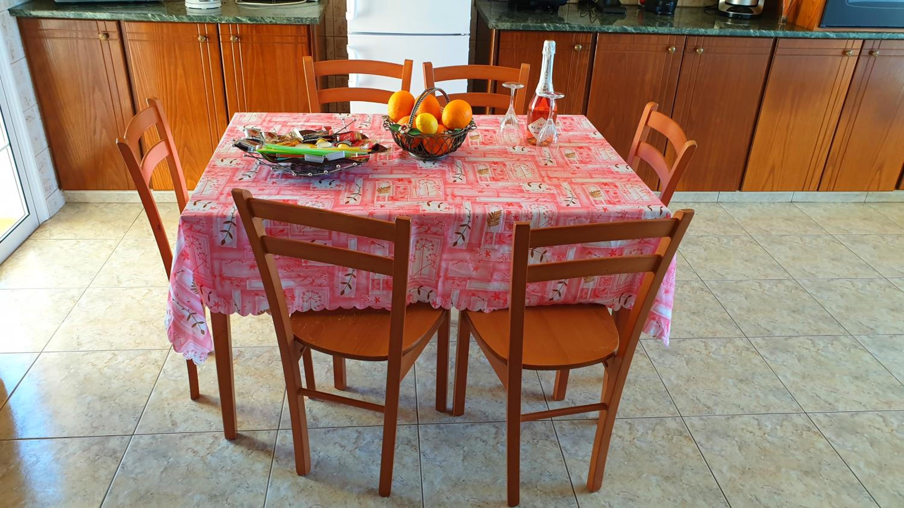 Everything you need for self catering and some. Complentary coffee,wine and all the cleaning products you would ever need. Really handy to have a washing machine,tv all channels all free. Air con which I only used on last morning as it was raining and chilly. Will always come to stay here