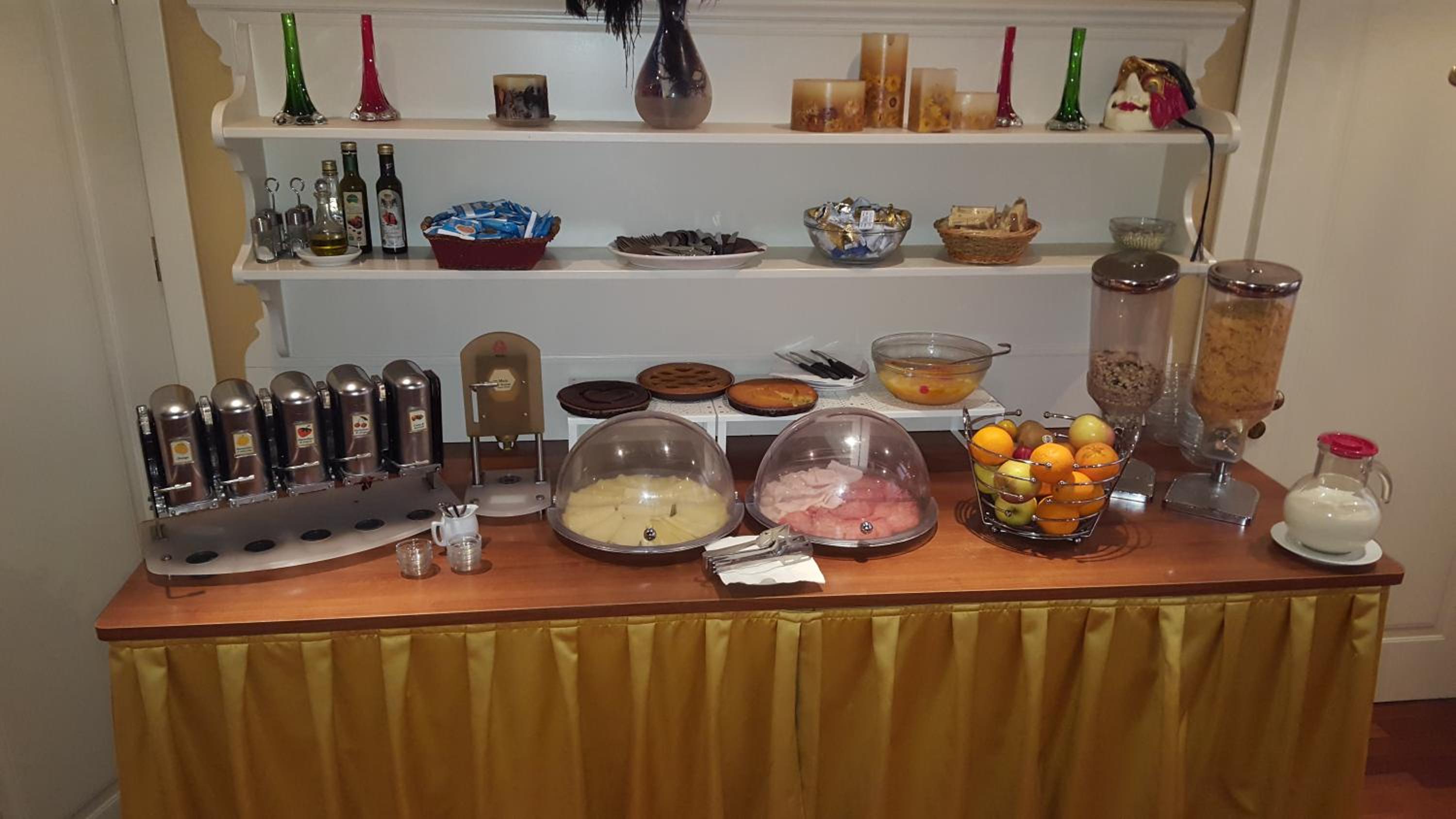 Colazione a buffet, caffè e cappuccini, brioche, uova, macedonia fresca..