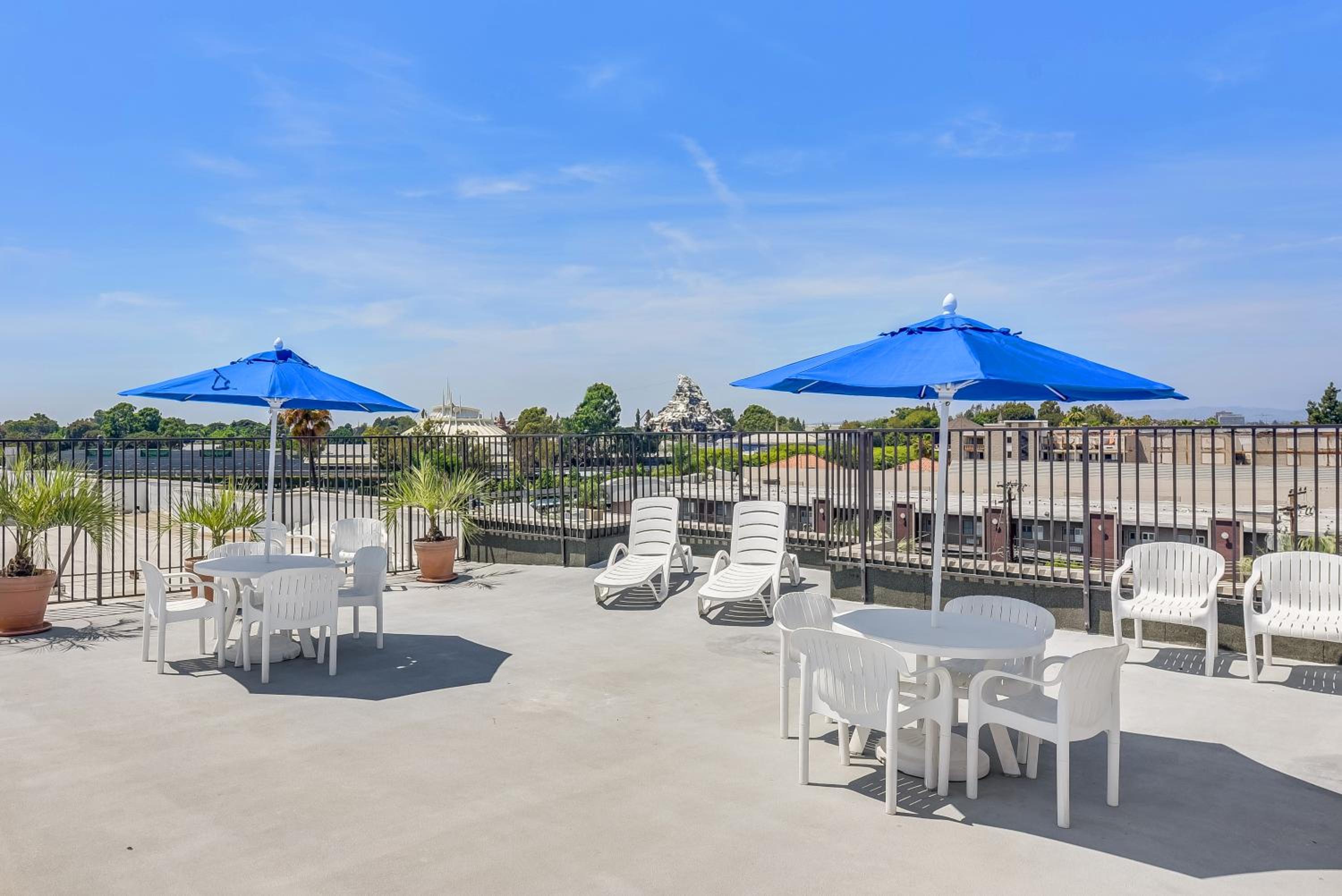 Relaxation and Entertainment: Indoor pool, hot tub, free continental breakfast, rooftop viewing deck for Disneyland firework shows.