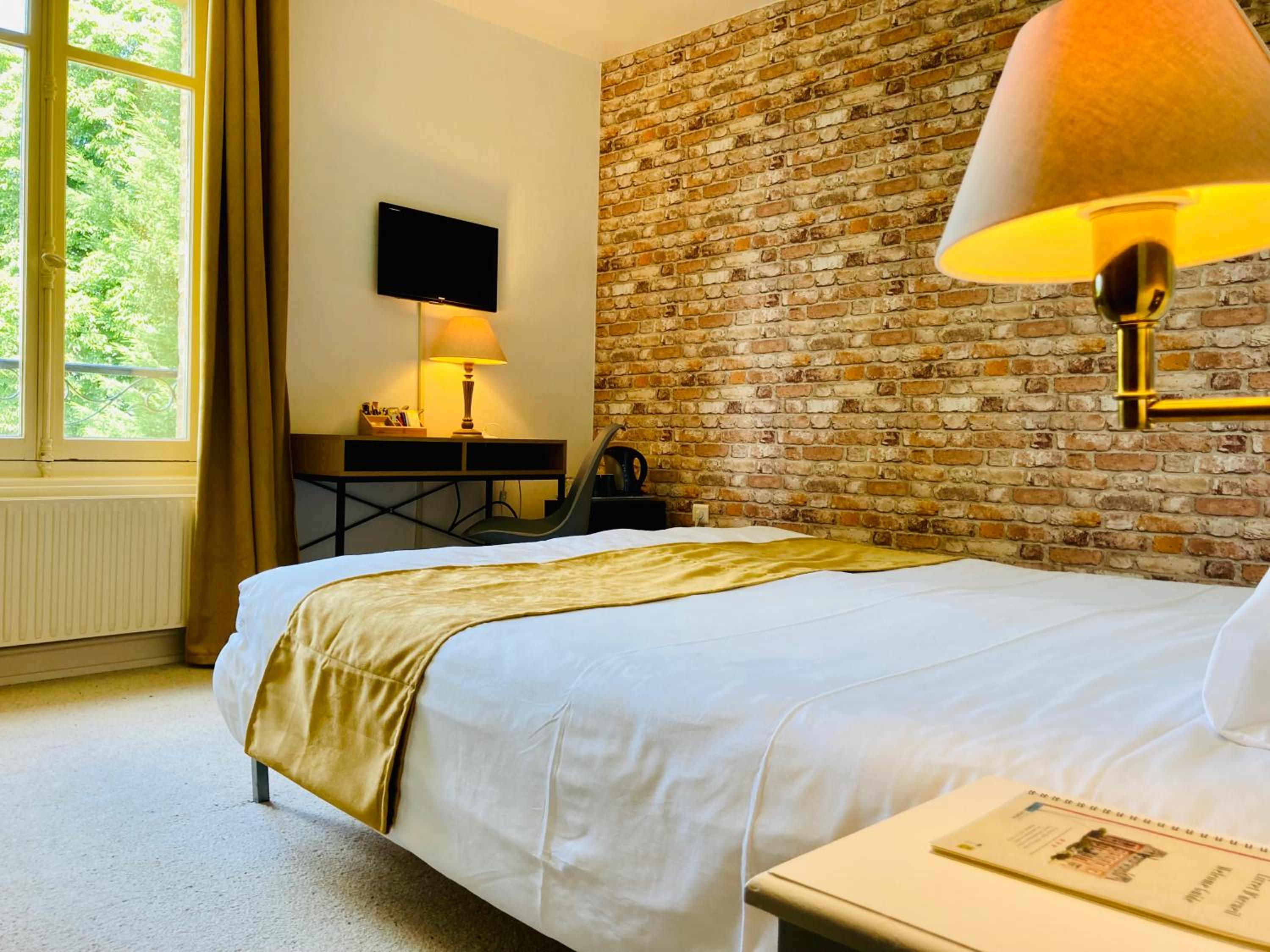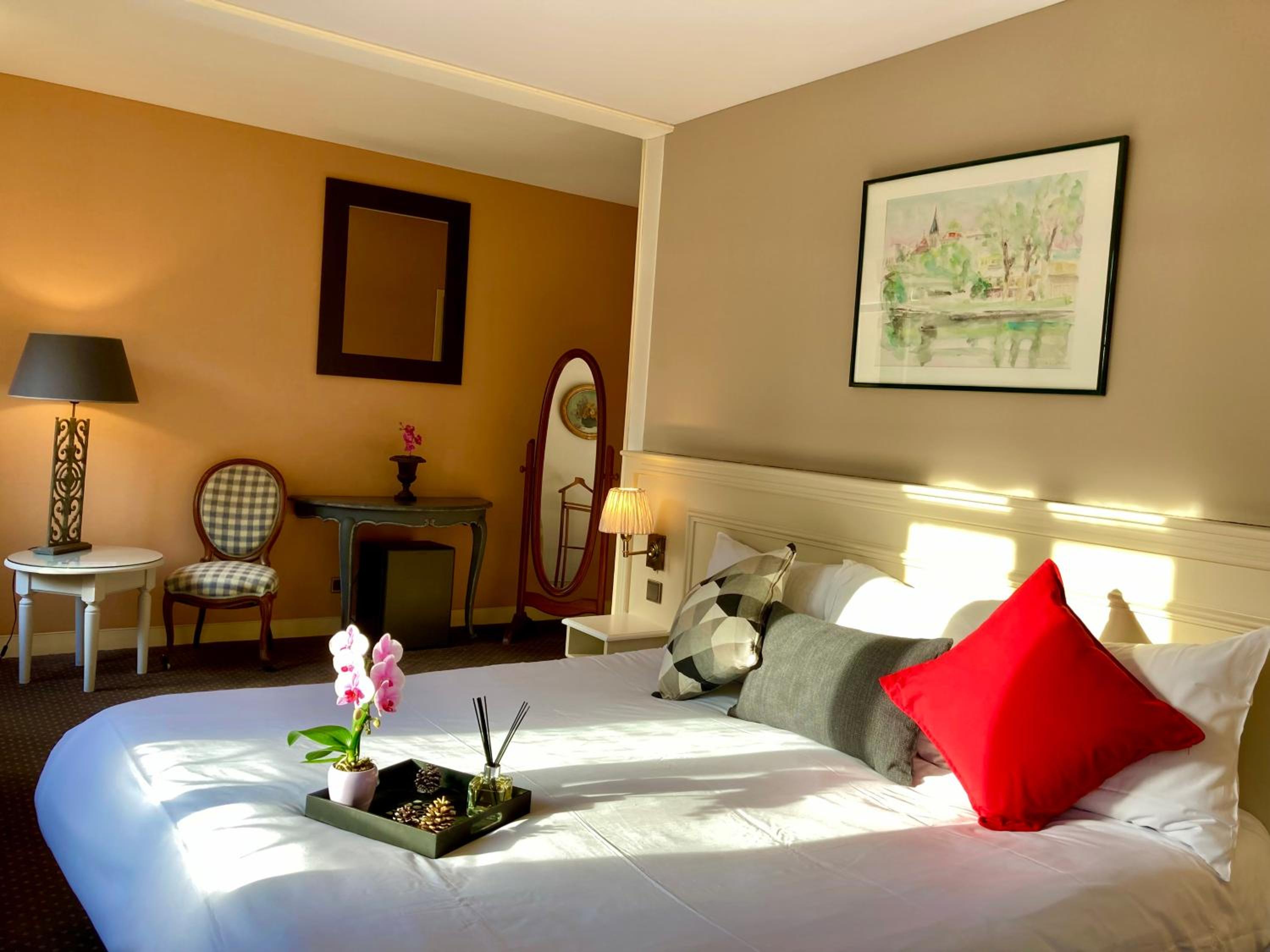 Enchanting Rooms with Scenic Views: The rooms at Chateau Corneille offer picturesque views of the garden and countryside, providing a tranquil escape for guests. Each room is elegantly furnished with modern amenities including an en suite bathroom and a flat-screen TV.