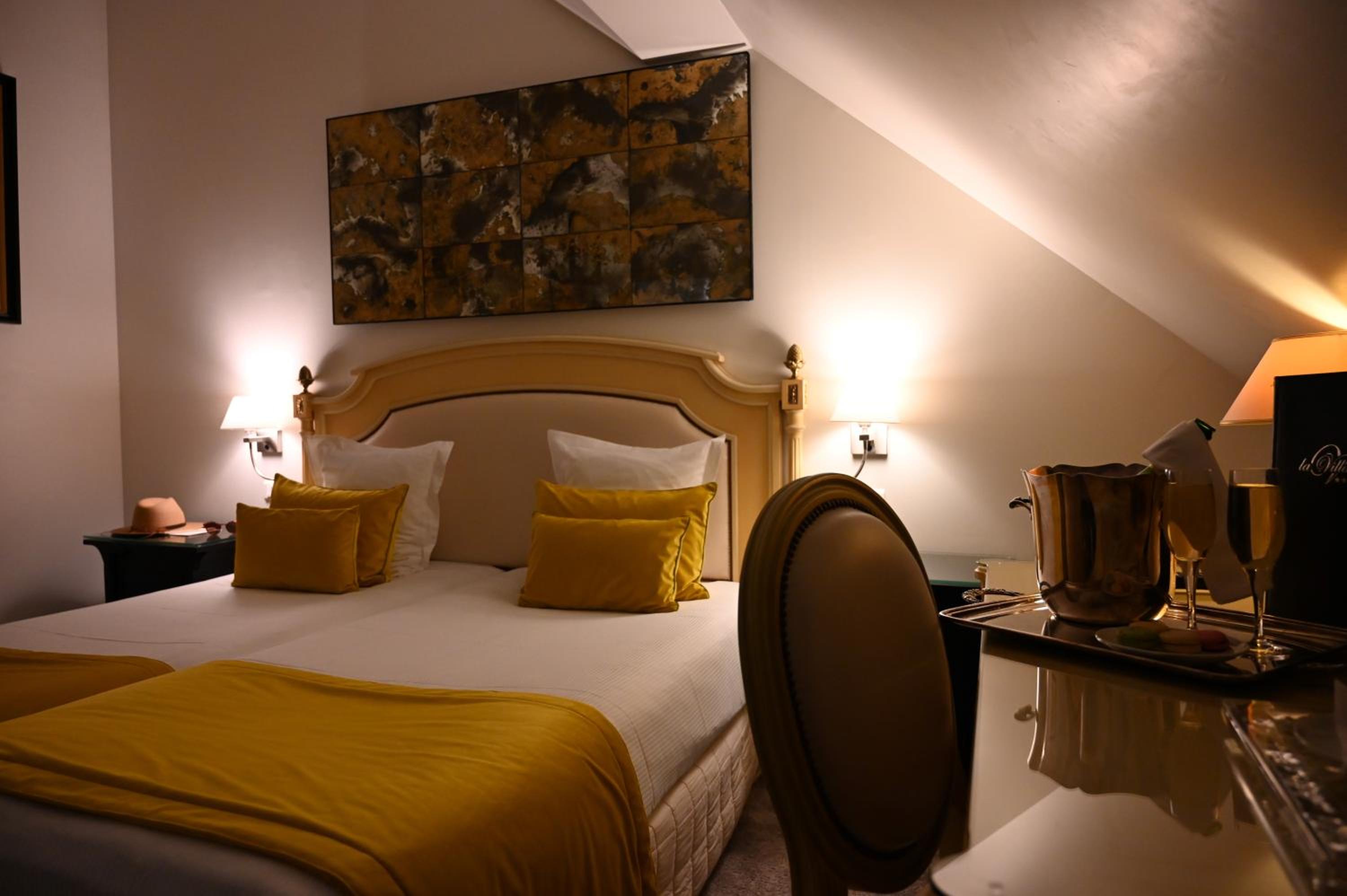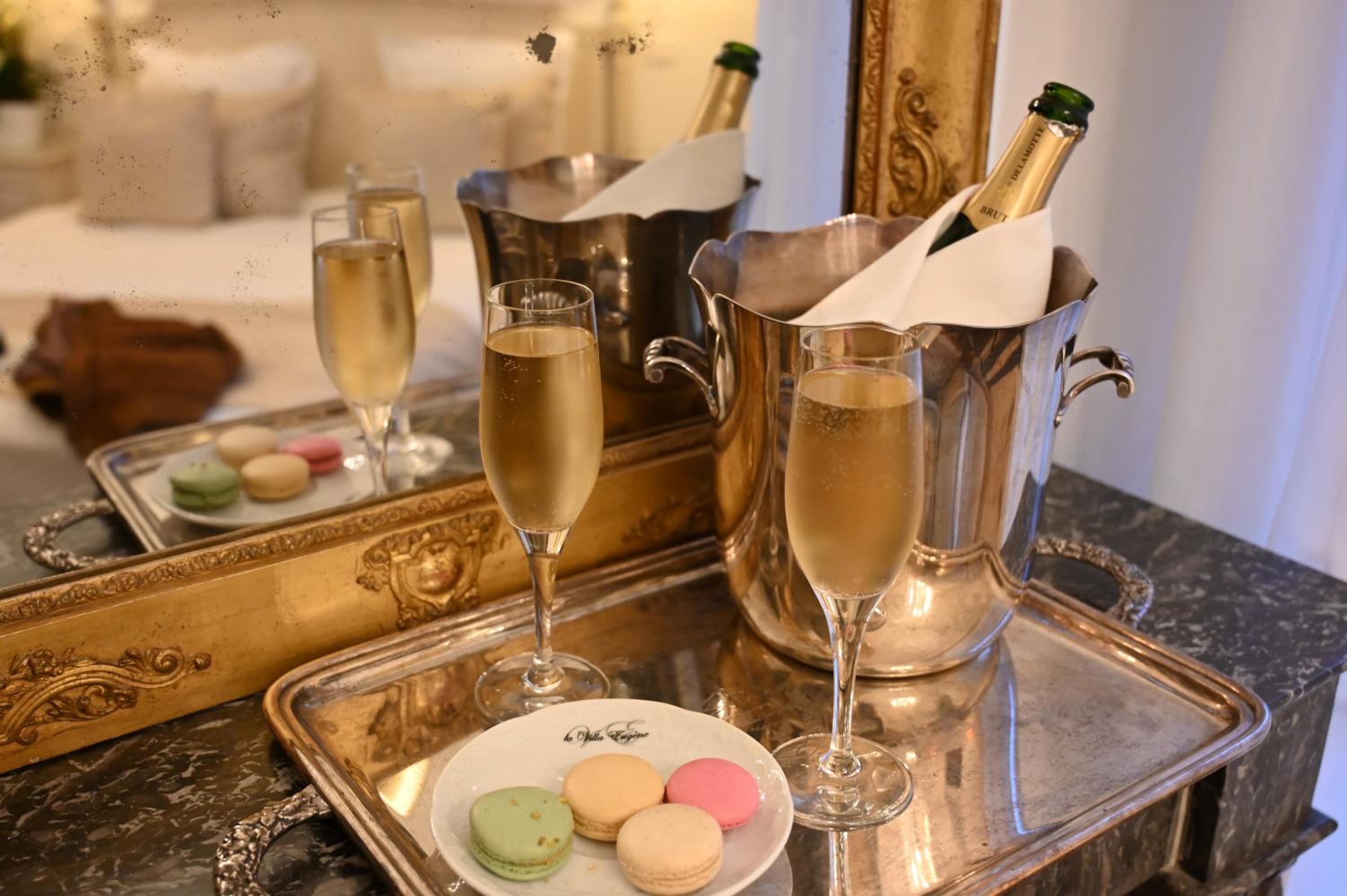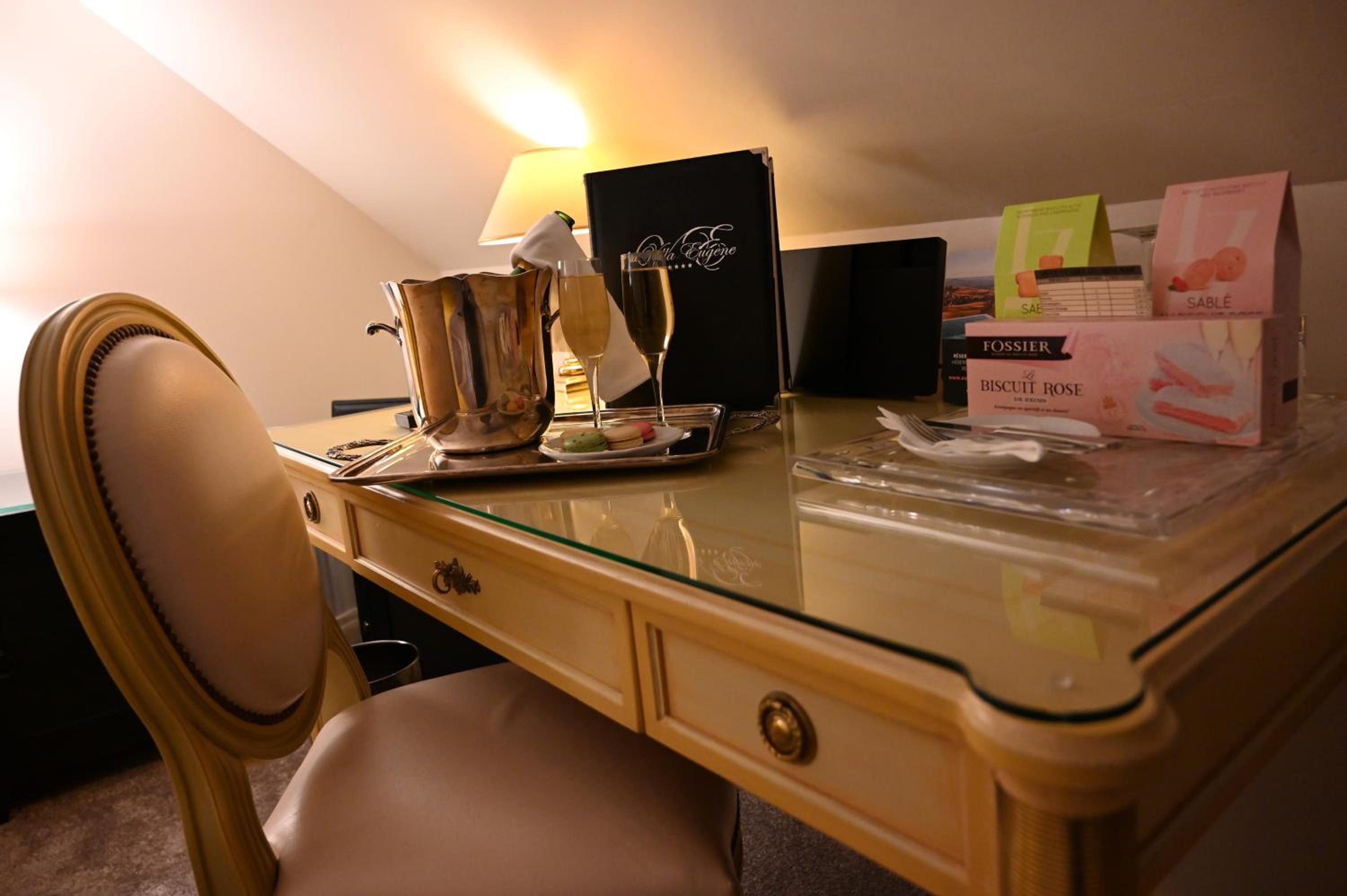 We celebrated a milestone birthday at the La Villa Eugene the last weekend of September with two other couples. Our room was absolutely beautiful, with high ceilings, feautiful furniture, and amazing touches (like a old LV travel trunk as the bedroom bench and a fabulous bath tube). The service was attentive and definitely five stars. The champagne houses were a short walk down the Ave de Champagne.