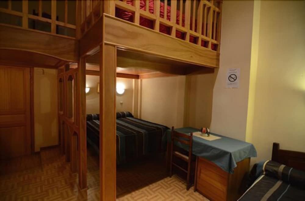 We booked the 5-person room for out family of five. The best aspect of this hotel is the 2-level spacious room with 4 beds (one double bed and one single bed on the main level, and two single beds in the loft). Getting to the room requires climbing 3 flights of narrow stairs with no elevator. There's a shower and toilet en-suite: you enter through the shower room, and then the toilet is above in the loft. The room also has two tables with chairs (one on the main level and one in the loft) and some closet space in the main level, but otherwise it's fairly basic. There's no air conditioning, and just one big window; to get a breeze we had to keep the bathroom windows and doors open. The room was clean but somewhat decrepit (peeling paint, cracked floor tiles); the bedding was OK but not too comfortable.