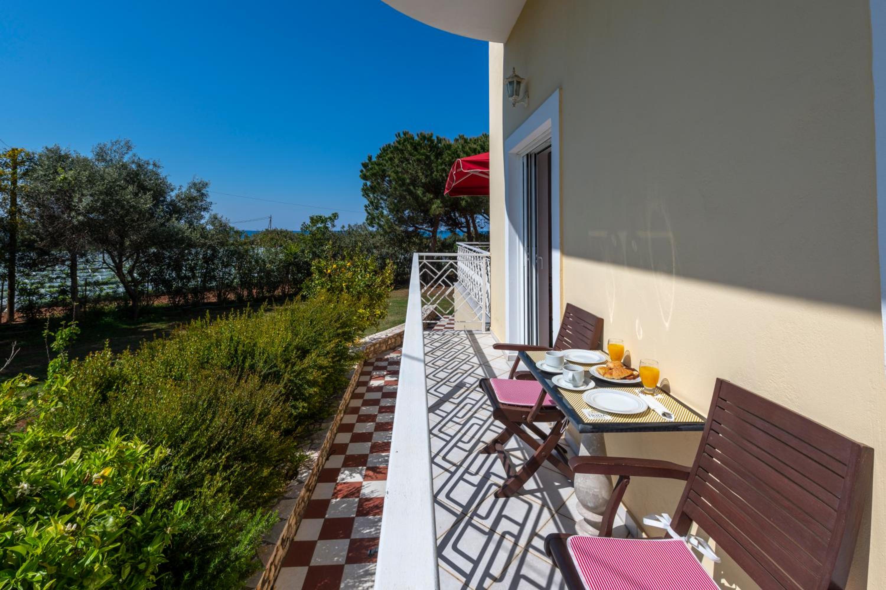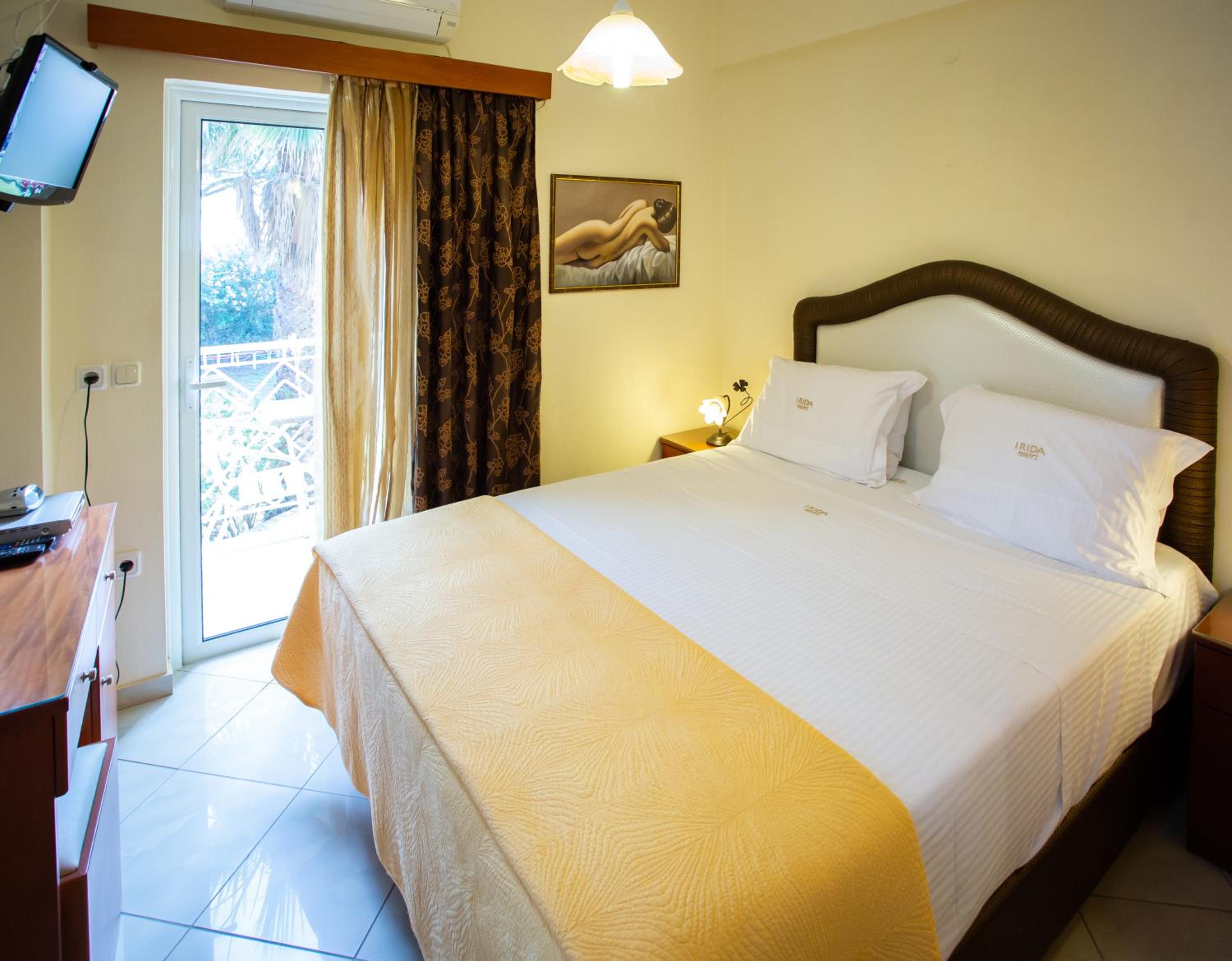 Enjoy stunning views of the Ionian Sea and nearby mountains from the large balconies of our fully equipped apartments. Relax in comfort with amenities like LCD TVs, mosquito nets, and kitchen facilities.