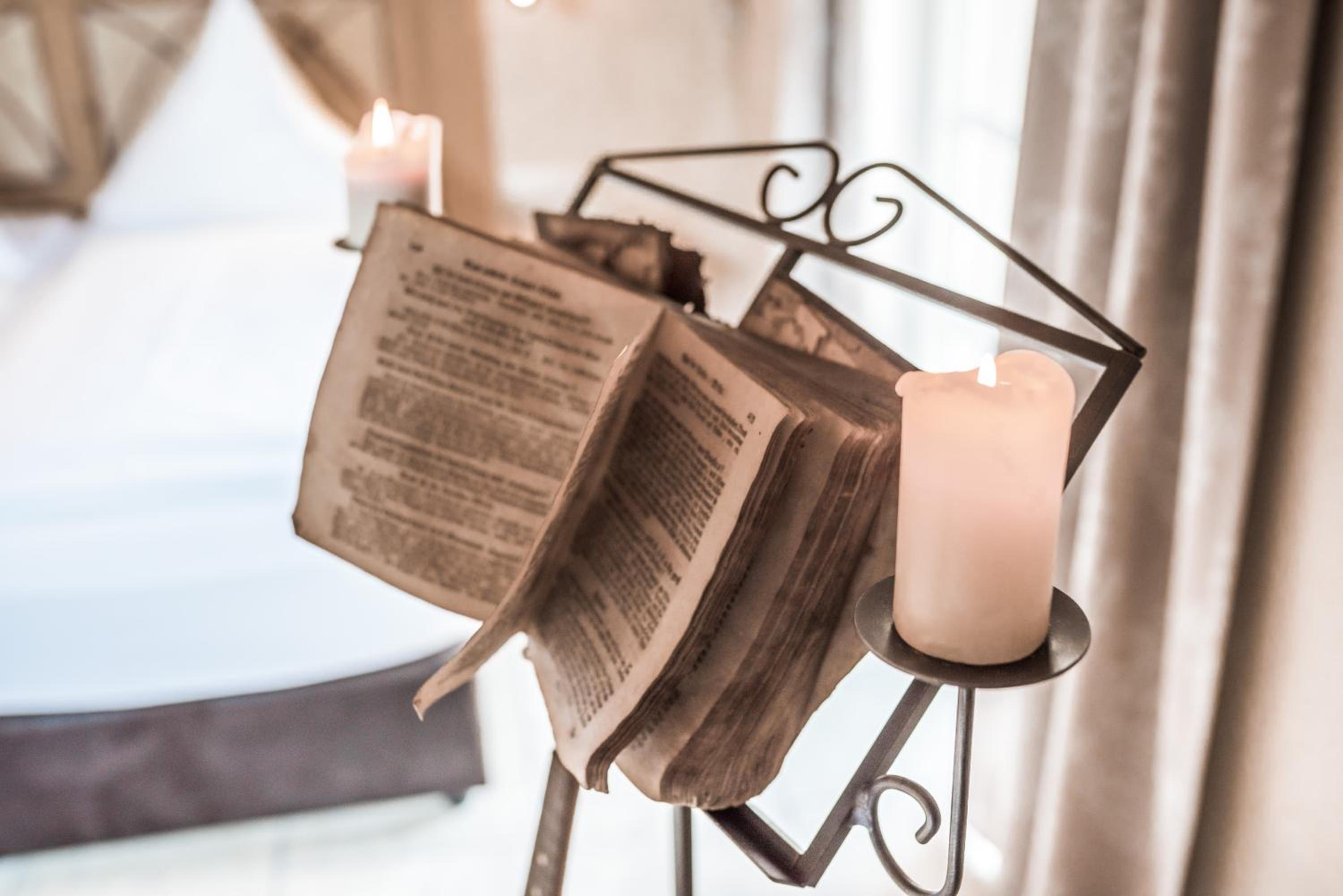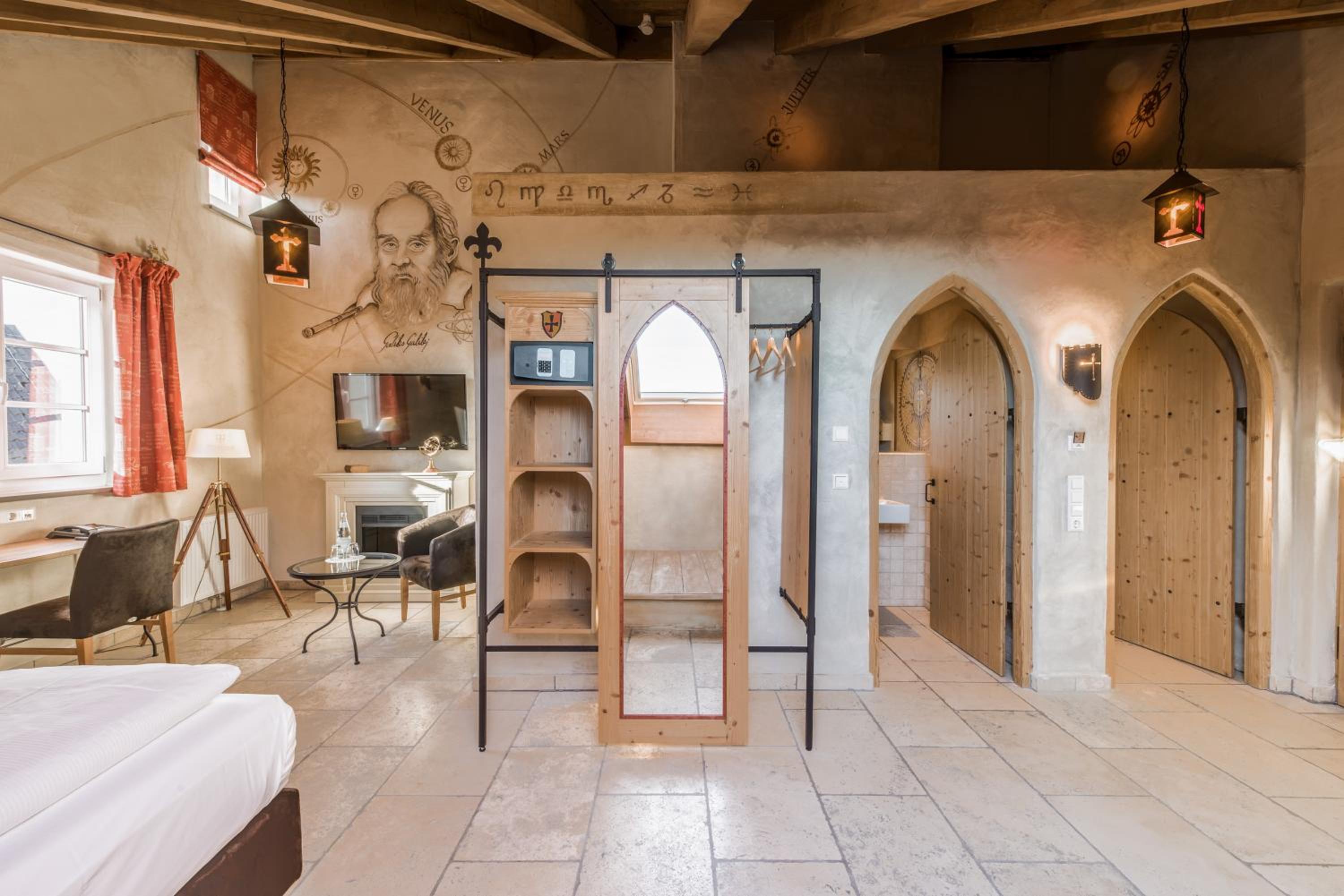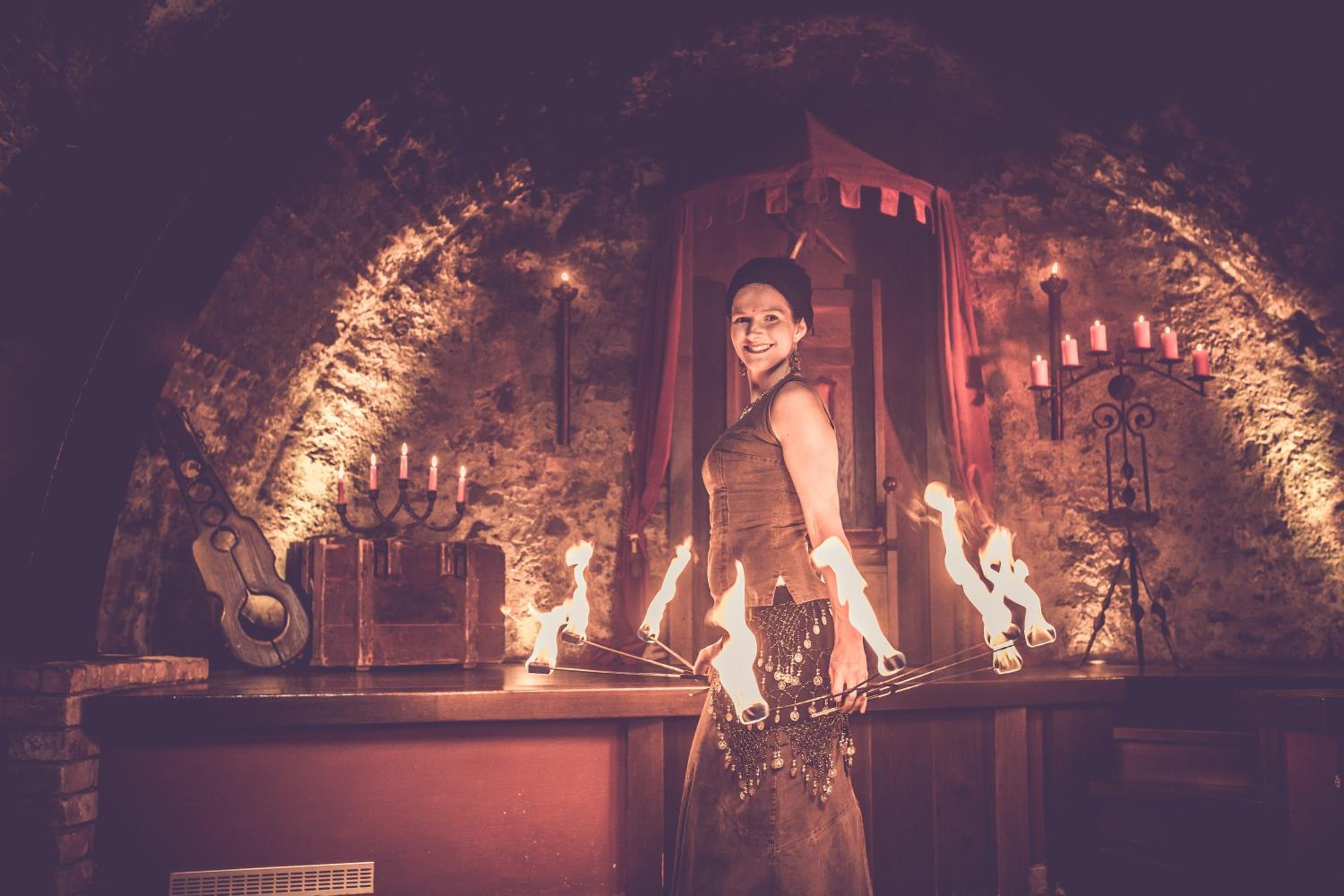 Stimmungsvolle Beleuchtung und mittelalterliche Deko Elemente im Zimmer.