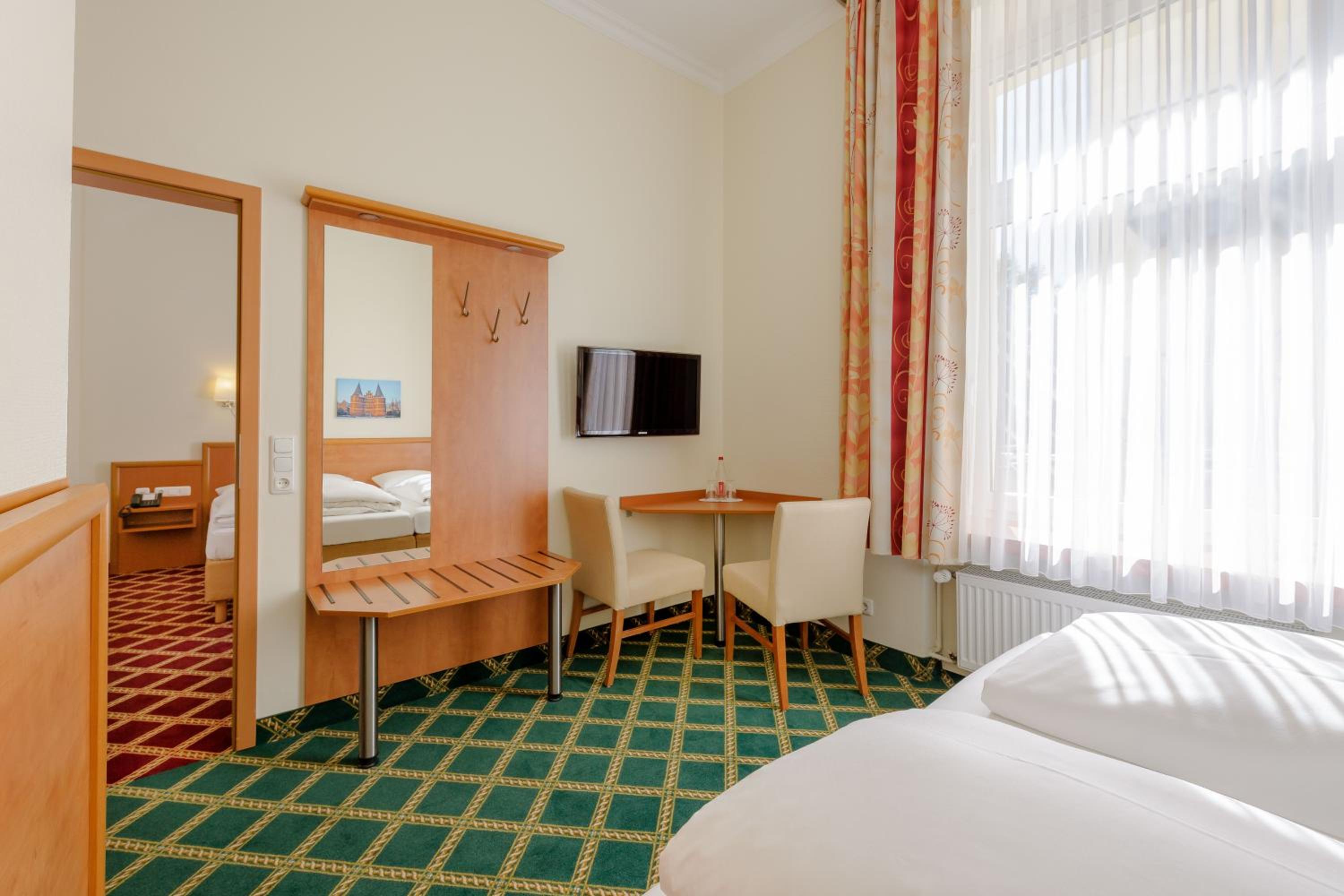 Świetna lokalizacja, niemalże tuż obok historycznego centrum Lubeki, do którego można dotrzeć spod drzwi hotelowych dosłownie w pięć minut i to nieśpiesznym spacerem. Duży plus dla obiektu za pokój w wyższym standardzie niż pierwotnie zarezerwowany. A sam pokój naprawdę fajny, umiejscowiony na poddaszu hotelu z przeogromną łazienką. A co jeszcze istotniejsze, szczególnie dla takiej osoby jak ja, która uwielbia bawić się fotografią, z okna tejże łazienki roztaczał się przepiękny panoramiczny widok na starówkę Lubeki, i to taki widok, który dosłownie obejmował jak na dłoni wszystkie najważniejsze zabytki miasta. Wieczorami siedziałem po kilka godzin grudniową porą w otwartym łazienkowym oknie z rozstawionym na statywie sprzętem, a zdjęcia które wówczas robiłem wychodziły cudownie. Faktem jest także, że tego rodzaju perspektywa, którą ja miałem, osiągalna jest wyłącznie zimową porą, tj. wówczas gdy na drzewach nie ma liści, bo w pozostałym okresie roku owe liście bez wątpienia zasłonią znaczną część widoku i niemożliwym, a co najmniej zdecydowanie utrudnionym, byłaby tego rodzaju zabawa fotografią. Ponadto, doceniam także łóżko w pokoju, które samo w sobie było duże, zaś znajdujący się na nim materac był naprawdę wygodny. Dla zmotoryzowanych turystów plusem będzie także darmowy przyhotelowy parking znajdujący się przed frontem obiektu, który jednakowoż ograniczony jest do kilku miejsc postojowych. Dla tych zaś, którzy nie zmieszczą się na nim jest jeszcze i drugi parking w formie garażu, tyle, że dodatkowo płatny. Bardzo pozytywnie oceniam także proces zameldowania w obiekcie, gdzie pomimo przybycia kilka godzin przed czasem, jak również i tego, że nasz pokój nie był jeszcze przygotowany, nie było najmniejszego problemu z zameldowaniem, jak również pozostawieniem samochodu na parkingu hotelowym. Jeżeli zaś chodzi o śniadania serwowane w obiekcie, to oceniam je jako dosyć typowe śniadania hotelowe w stylu kontynentalnym.