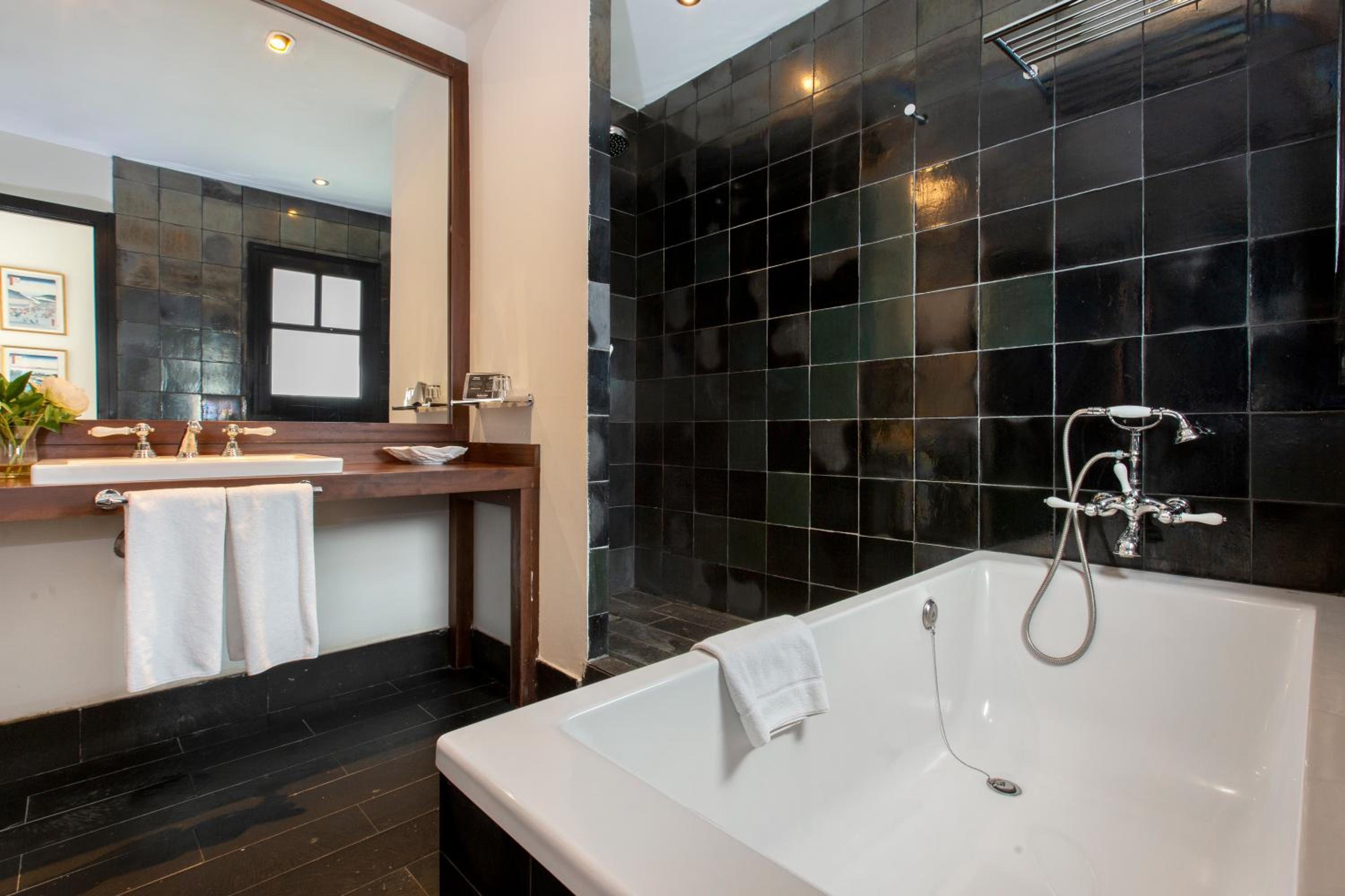 The Market Hotel offers chic rooms with rain showers and free Wi-Fi, providing a comfortable and modern stay for guests. The rooms feature dark wood beams, white walls, and large windows, with some offering a balcony or terrace for a relaxing outdoor space.