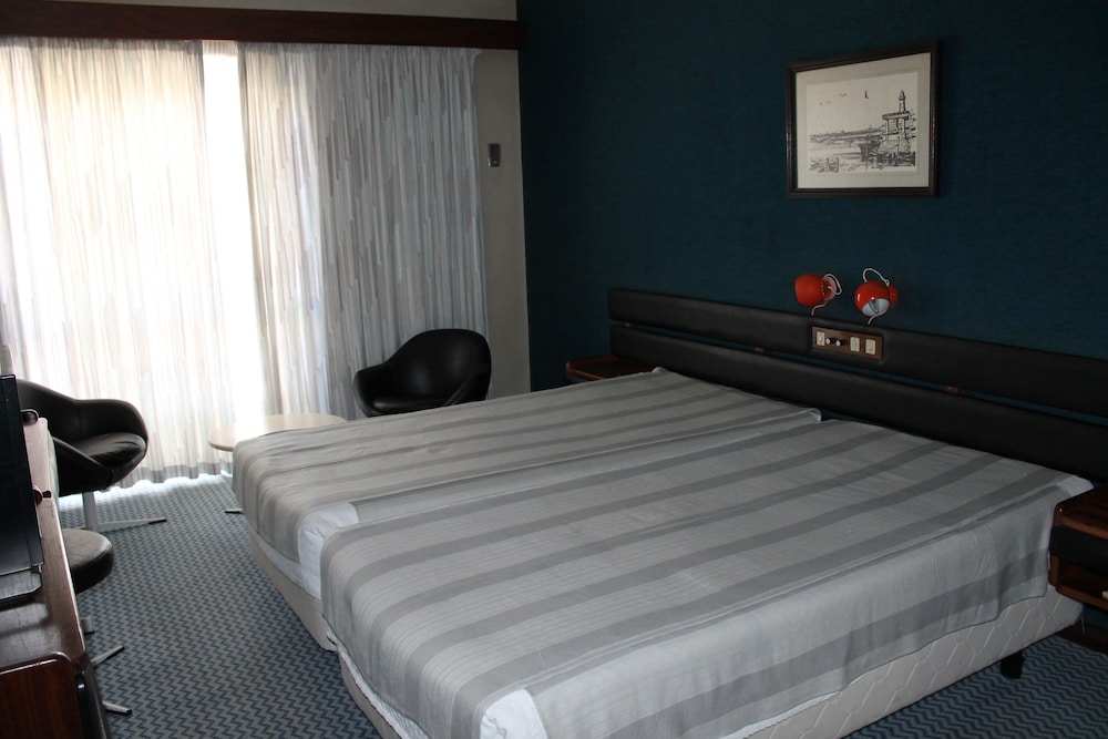 Y segundo,este hotel miente al ofertar cosas que no tiene, y Expedia se lo permite. El hotel es viejísimo, el parking gratuito se limita a 13-14 coches,en la calle,y si quieres aparcar búscate la vida. Y en agosto en un sitio de playa a ver cómo lo haces. La piscina no pertenece al hotel,es pública,y hay que cruzar la calle para ir. Sin tumbonas para todos y cerrando a las 19h,ahora en agosto. La habitación no estaba limpia para la hora del check-in,y tuvimos que esperar bastante. Vasos rotos en el comedor, todo muy viejo y completamente dejado. Paredes de papel y una puerta de la habitación que se atascaba y no abría. No llega ni a pensión. Y pagamos 90€ por la habitación. Un auténtico robo por tener al lado una playa en la que siempre hace viento.