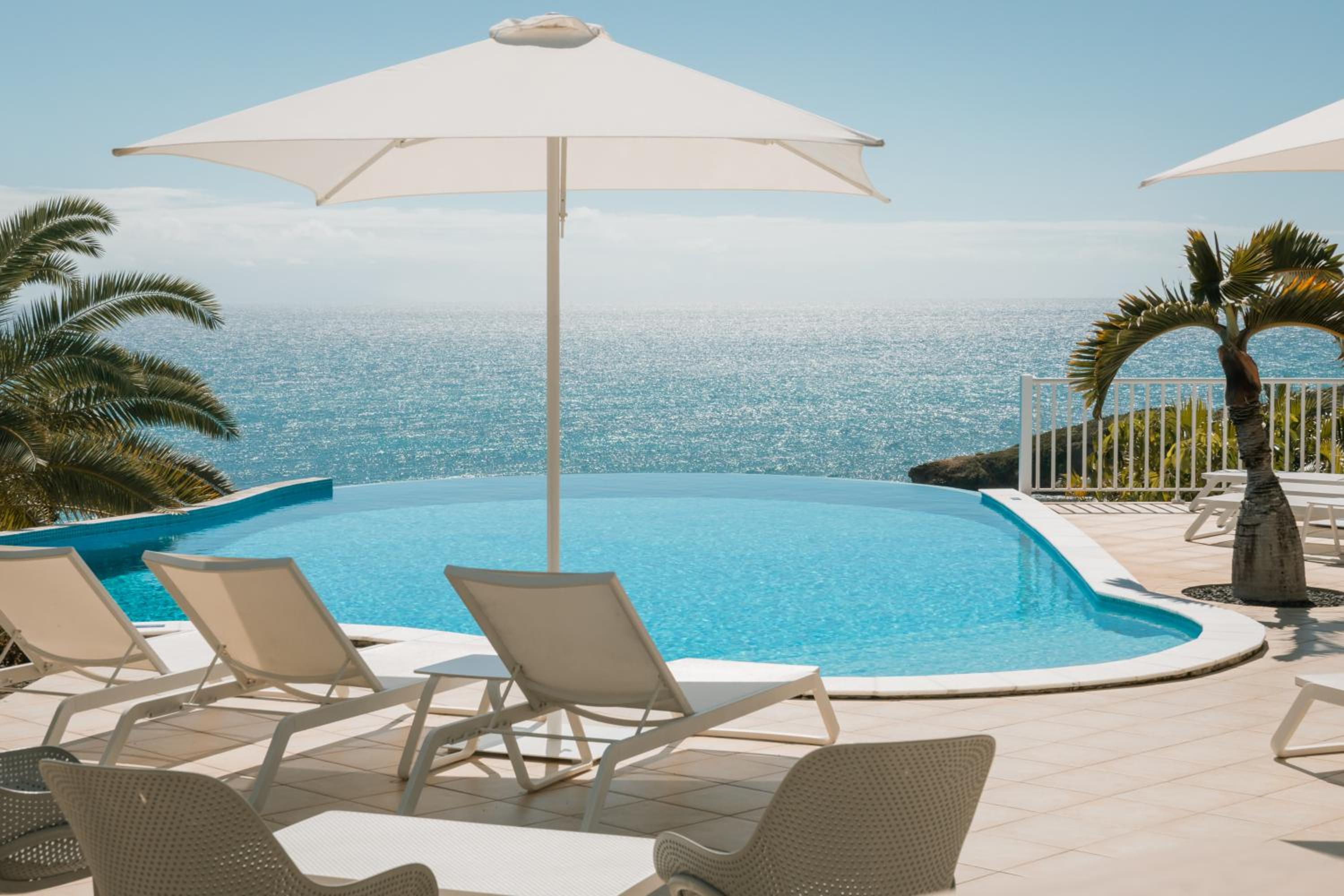 Piscine à débordement avec vue sur l’océan. Site très propre orné de plantes et fleurs.