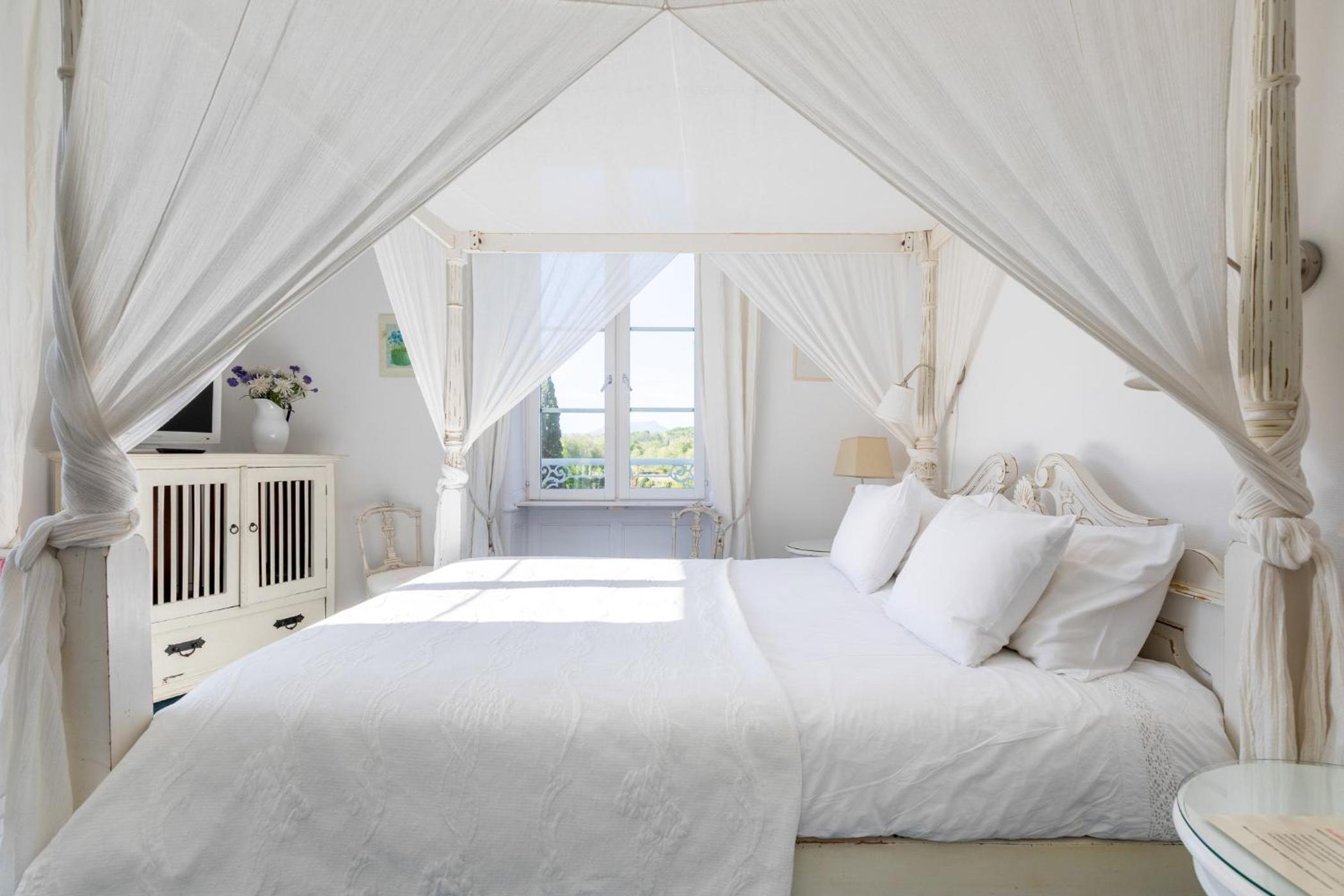 Domaine de Bassilour offers a unique stay in a beautifully restored 18th-century manor house surrounded by a picturesque garden. Guests can choose between rooms in the manor house or a converted 16th-century farmhouse, each with its own individual theme and modern amenities like flat-screen TVs and en suite bathrooms.