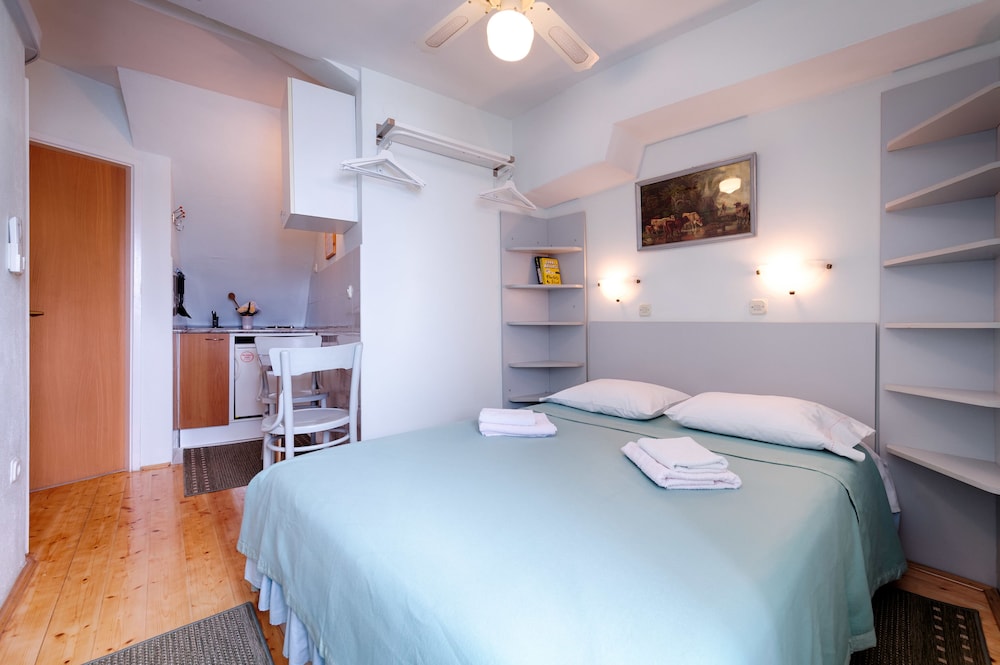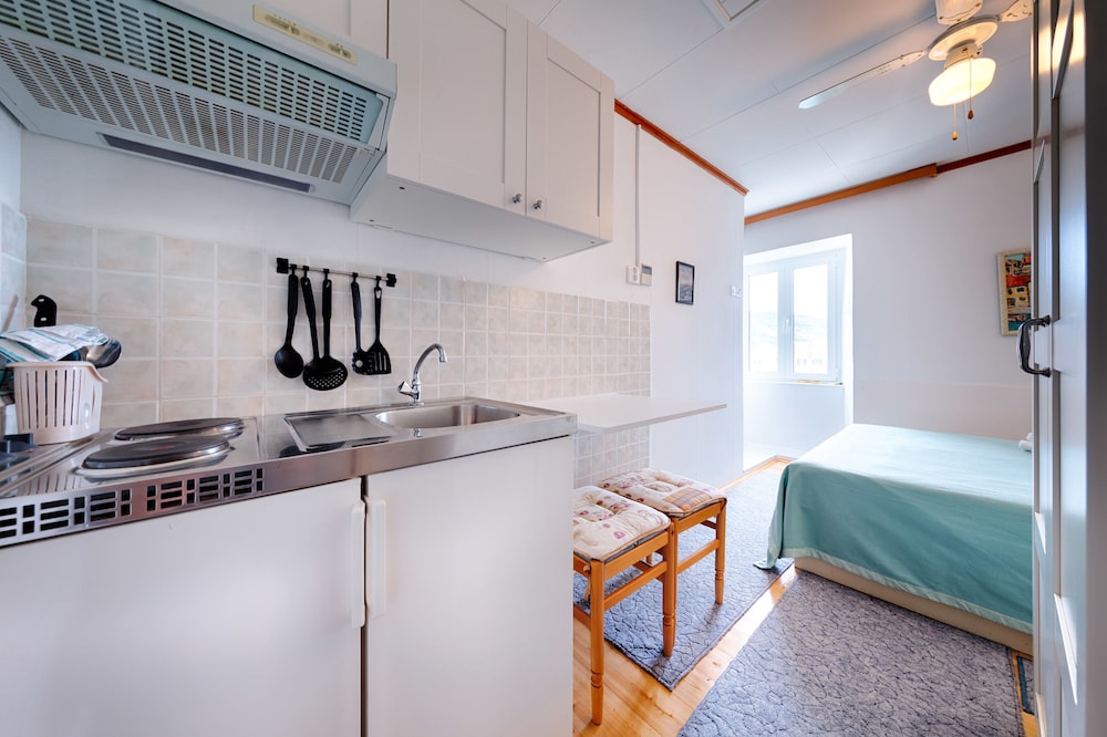 Fantastic location that was easy to find, off the bus, walk 25m to waterfront and then approx 125m to the left along the waterfront past the multitude of bars & restaurants 'strip' and you hit it on the corner. information centre next door. The best little beach is just 35m away. The room awesome view to beach and path below of people strolling by. (which can be a little noisy at night depending what tourists were on the island). lovely balcony available to watch of comings and goings of sailing port. Little washing line under your window. Room spotless clean and bed comfy. Room 1 had double and sofa bed, kitchenette and fridge but there is a social room and kitchen available.