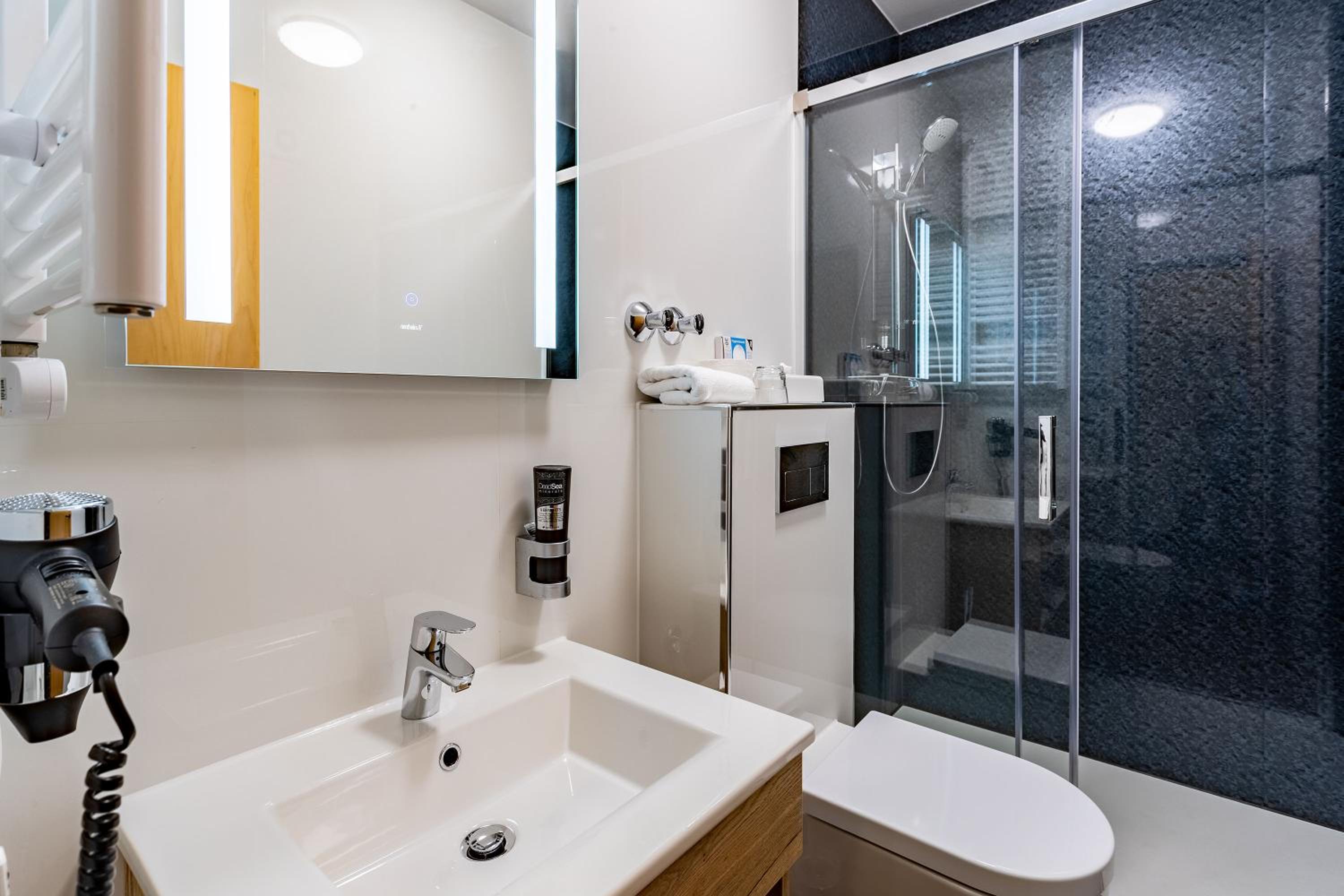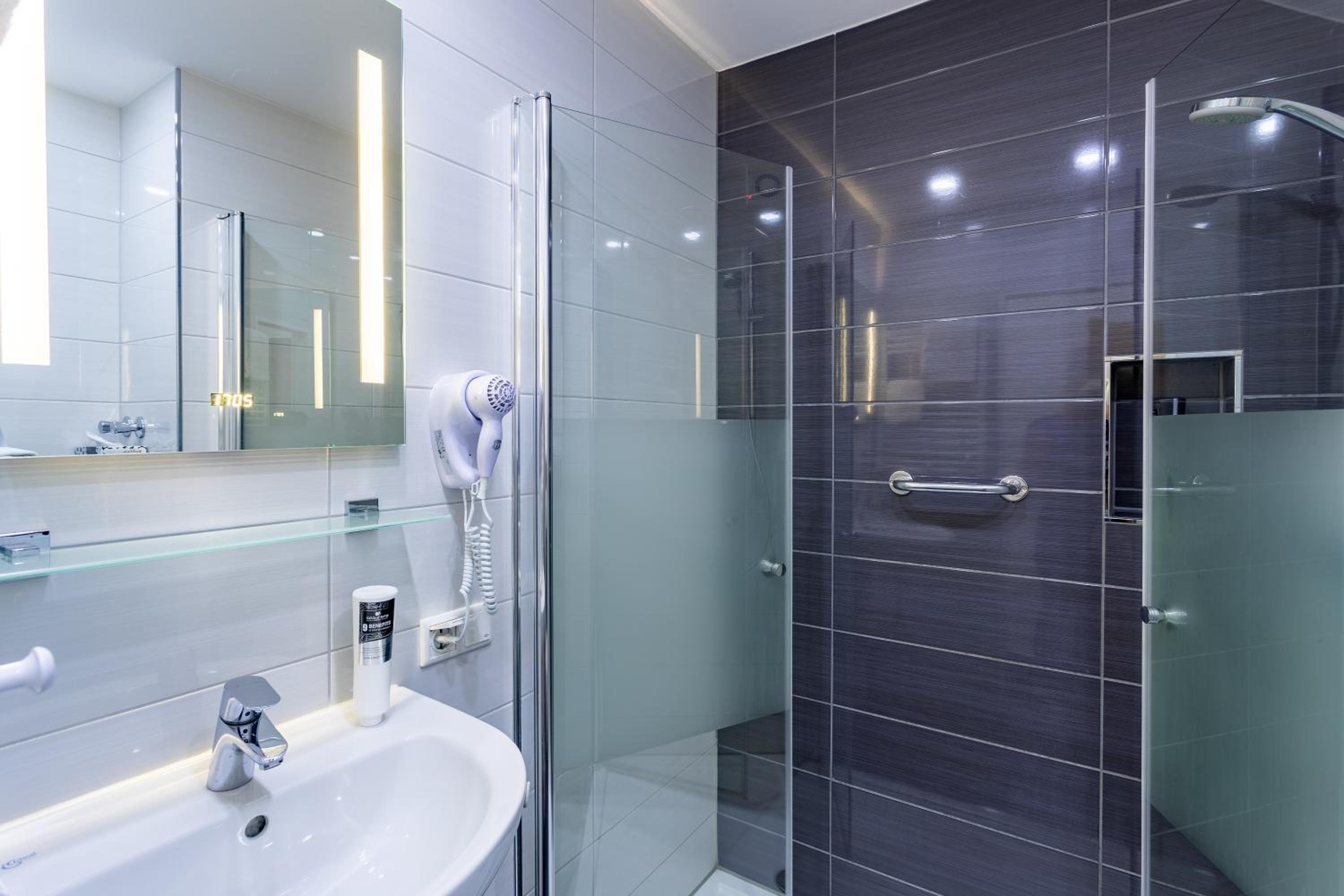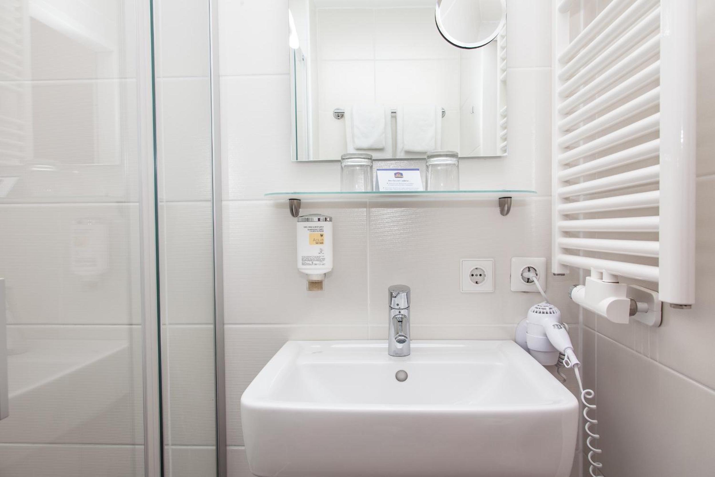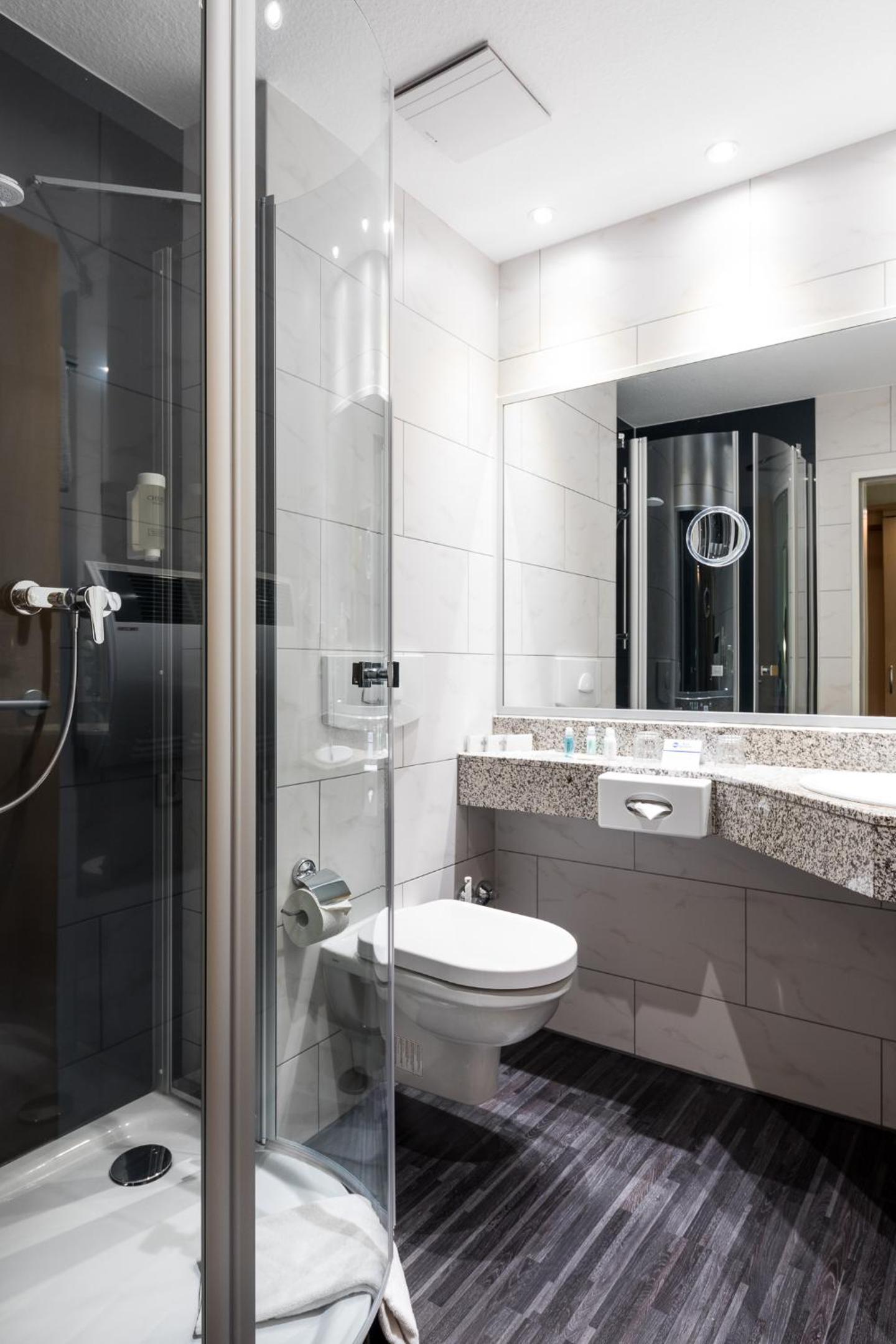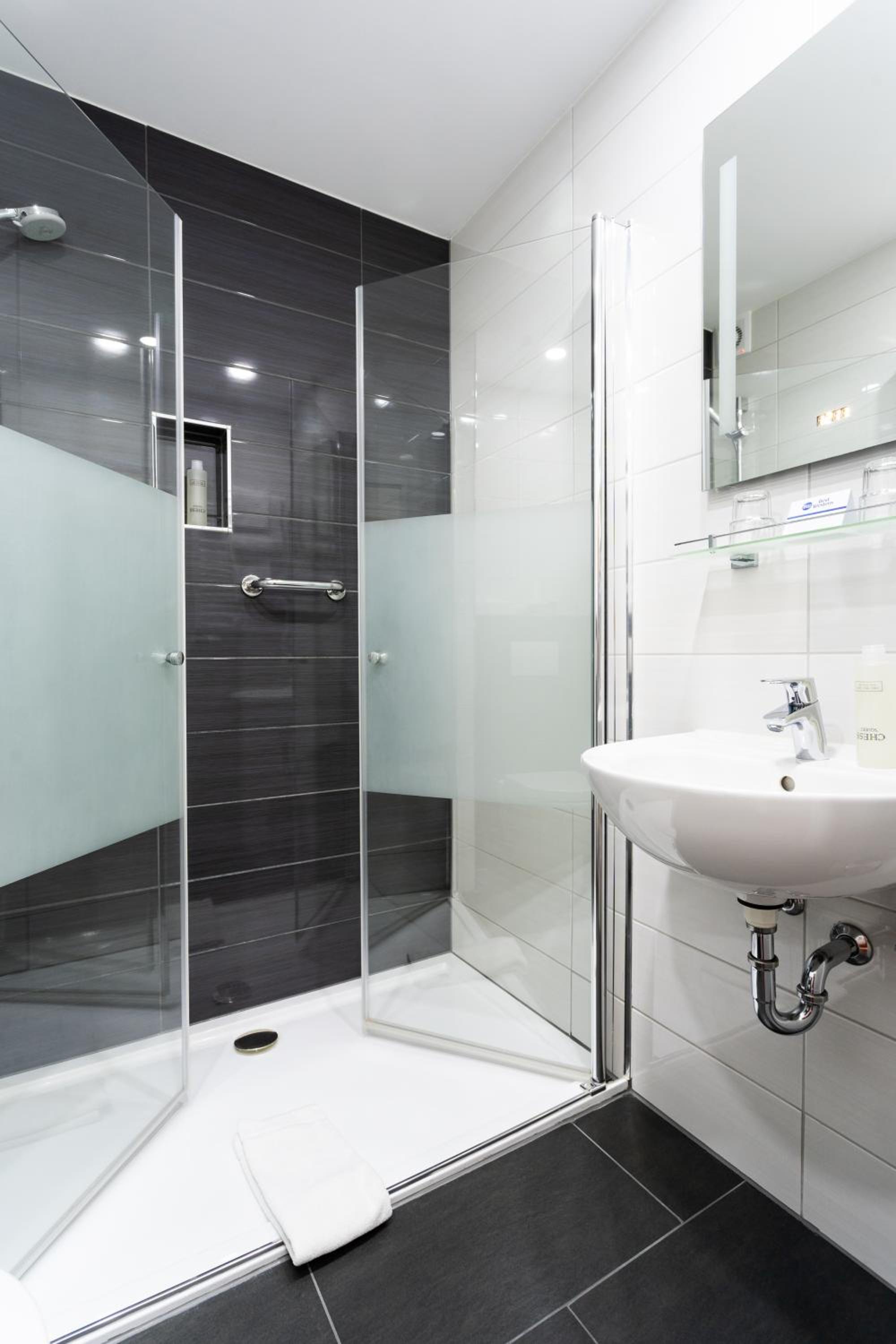 Zimmer mit Badewanne in einer Schräge. Duschen für Kinder bis 5 Jahre eventuell möglich. Für Erwachsene unmöglich. Habe in Schwimmbadbereich geduscht. Auf Anfrage für Alternativzimmer wurde nicht angeboten. Auch die Rechnung in Bezug auf Frühstückkosten (MWST) unbefriedigend. Schwimmbad und der ganze Bereich in die Jahre gekommen und nicht sehr gepflegt.