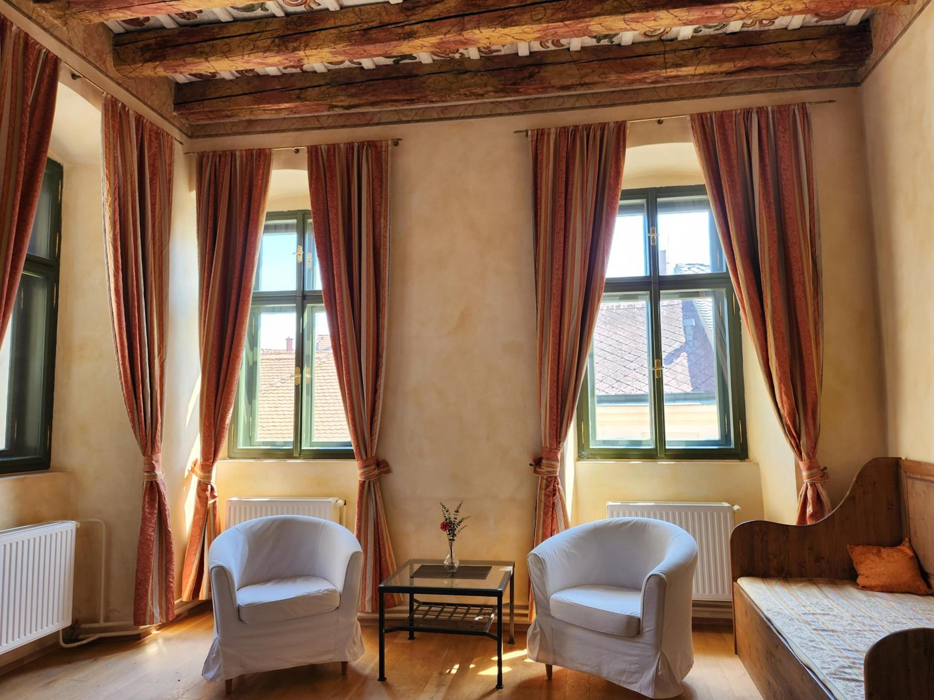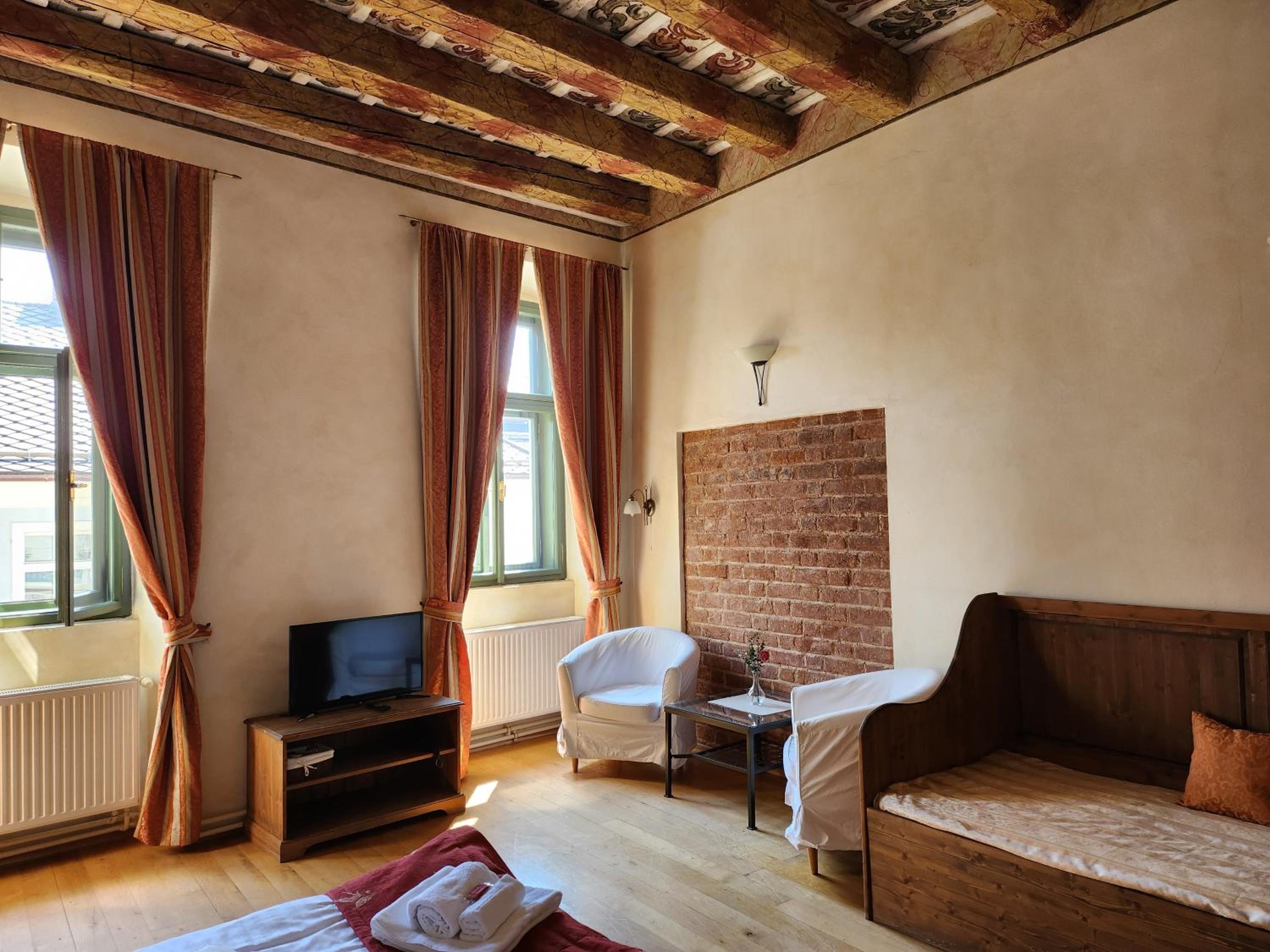 Wspaniała atmosfera średniowiecznej kamienicy. Interesujący widok na wieże kościołów.