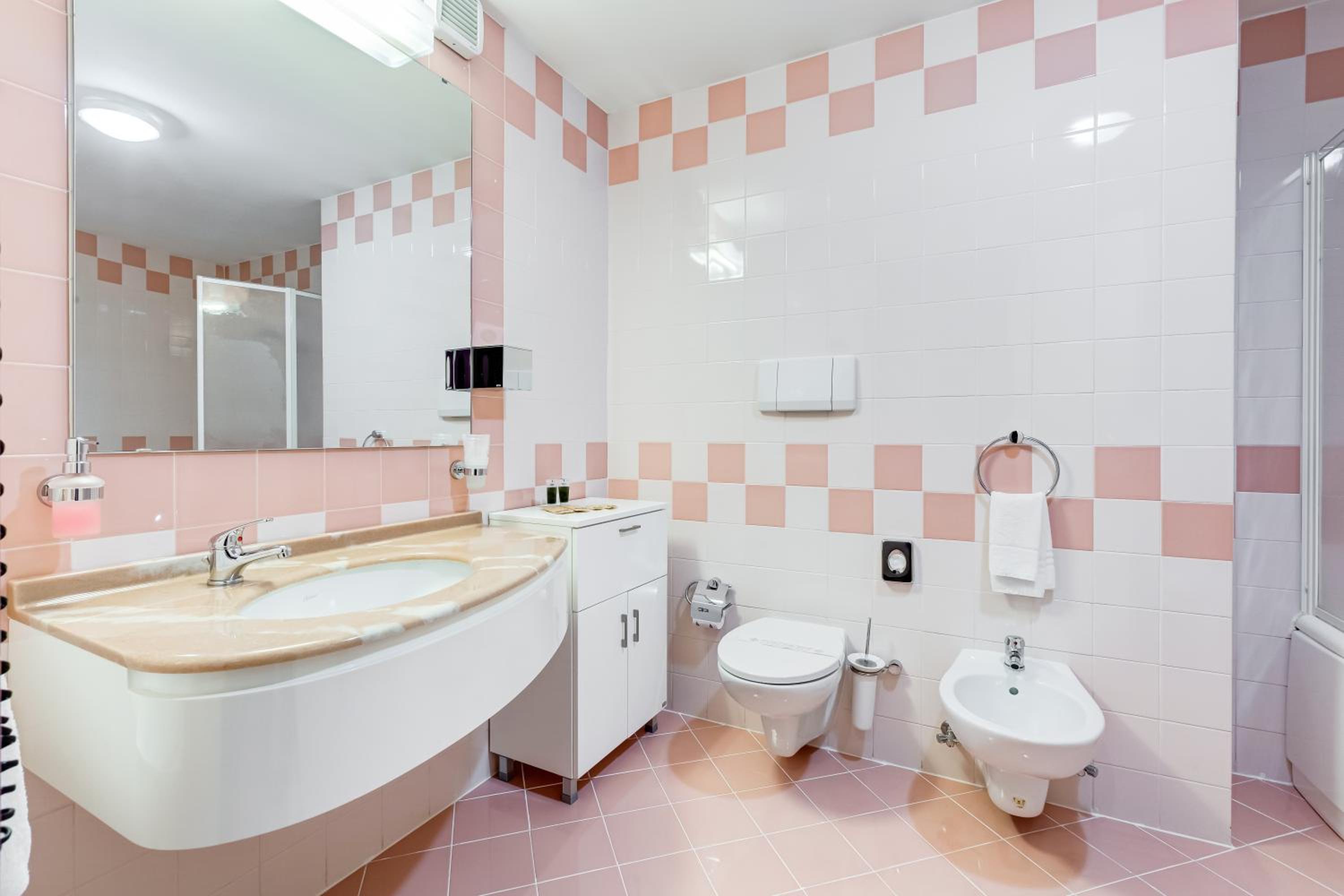 Our room had a dirty old unnecessary rug in it and the bathroom was awkward with random cheap furniture. A capsule shower was in the corner with lots of room for a better amenity. The door scraped on the tile floor and the tile workmanship overall was not well done.
