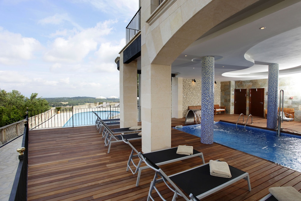The hotel building is beautiful; great character. We had a balcony facing a beautiful view of the countryside and mountains. Some rooms at the back would not have a good view, but they seemed unoccupied while we were there, possibly because the hotel was only half full. If planning to go in high season ask which rooms are available. The leisure facilities were good; two lovely pools, the indoor one being well heated. Good steam room. Food in the restaurant at dinner was good, but we noticed one or two things were not cleared away by following breakfast= time, eg. ice buckets, and floor had not been swept. Breakfast options were not explained to us so not clear what the continental breakfast choices were( which was included in our room rate) The terrace at lunch time was a pleasant pkace to eat and served a bar menu until 4.00pm but closed then until 7.00 pm.