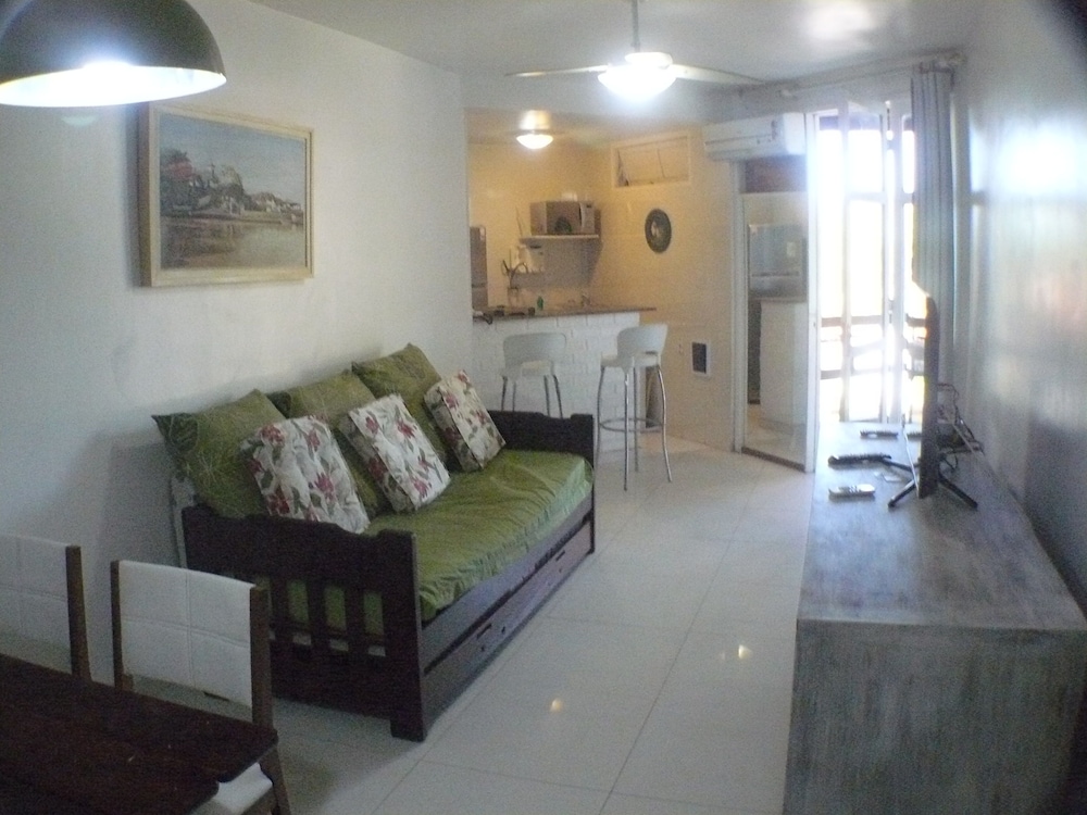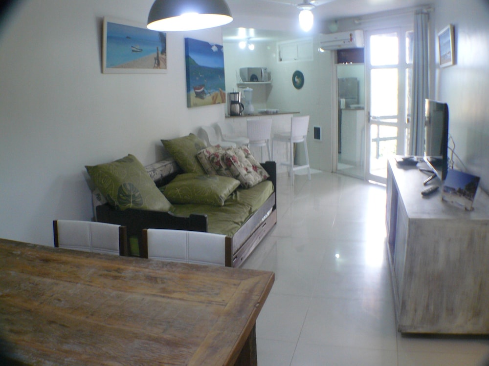 Buzios Internacional Apart hotel is located 100m from the pier of Canto beach,thus close to the worldwide known " Rua das Pedras" and Bardot seashore walkway. It has many trees inside the condominium with parking places. It has a very agreeable swimming pool , sauna and games room.The 49m2 luxury aparment is very comfortable with a bedroom with queensize bed; air conditioning in the bedroom and in the lving room.The kitchen is very helpful with its refrigerator, stove with oven, drinkable water, coffeemaker and so on. The balcony with a hammock is very pleasant too.
