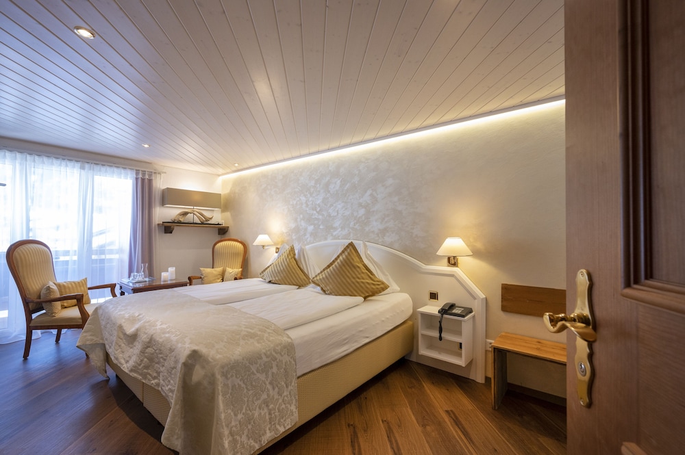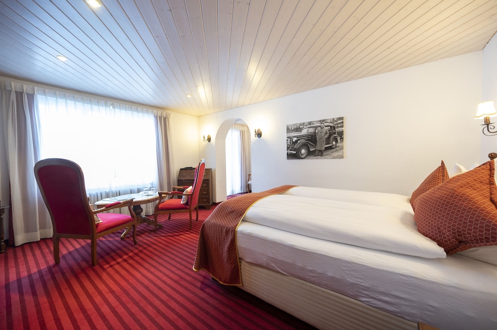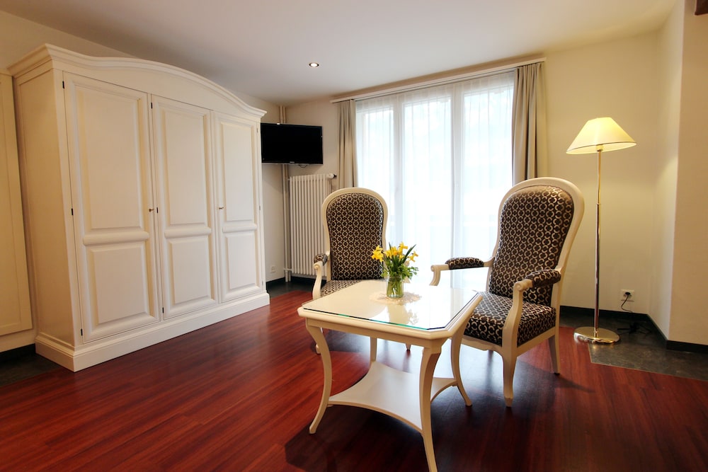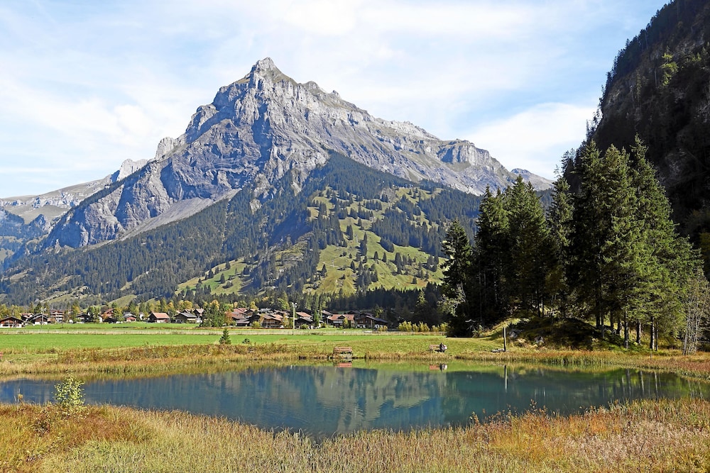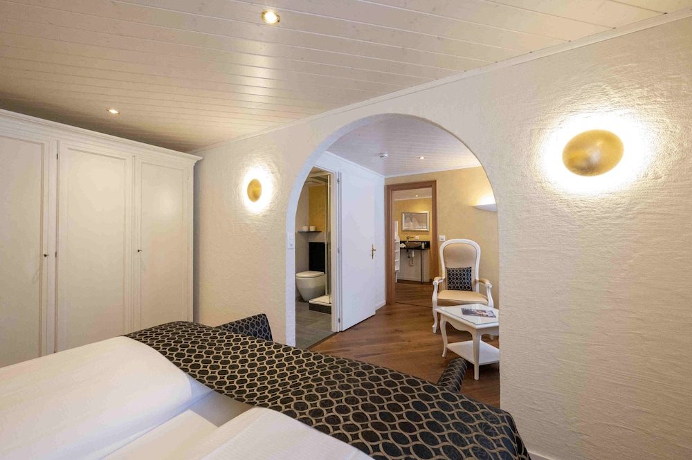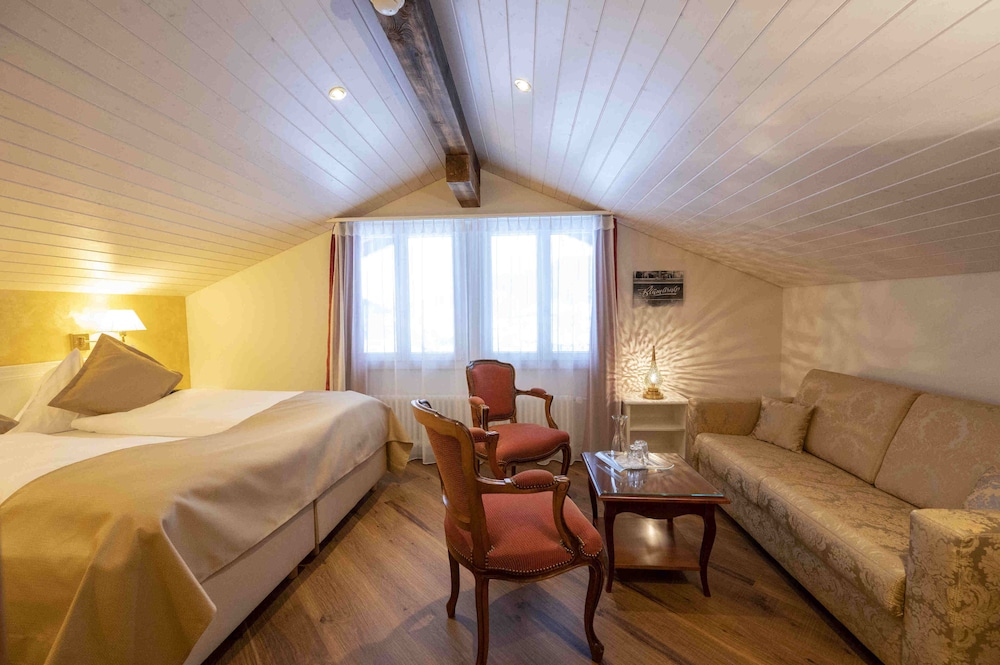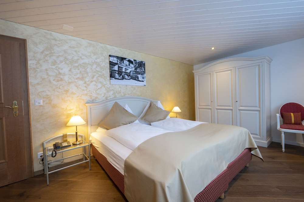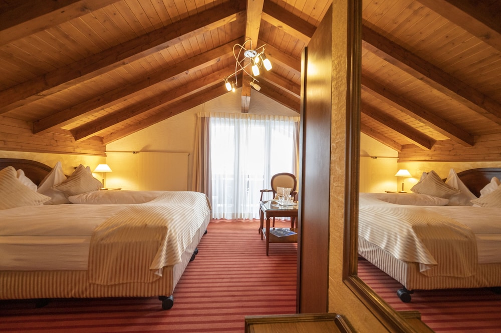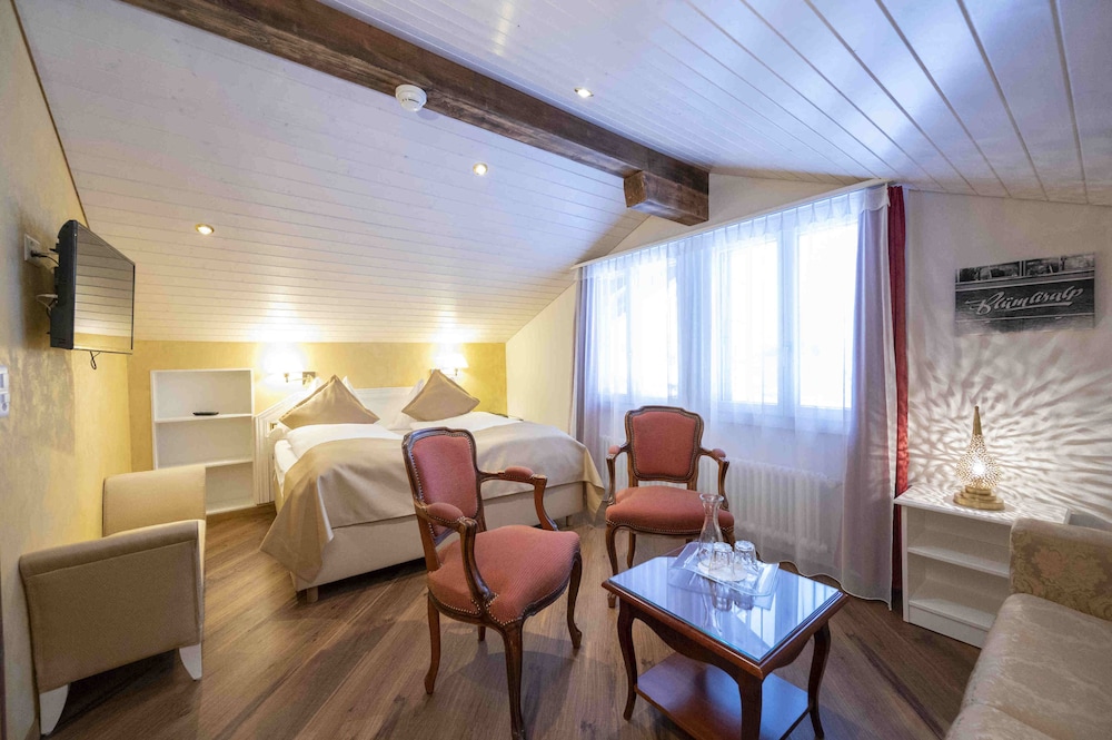 This hotel is a little further away from the train station than the other options, but it's still walkable. Like all the chalet style hotels in Kandersteg, Seiler's Vintage Hotel offers a Swiss environment and feel. (The walk to the gondola up to the lake is about 20 minutes.) The rooms in the front of the hotel offer beautiful views. Rooms in the back do not have balconies. The included breakfast is average (with no hot options). We had dinner at the hotel one night - very expensive. I recommend walking down the main street and checking our other hotels and restaurants for dinner. The rooms were comfortable. I would stay here again.