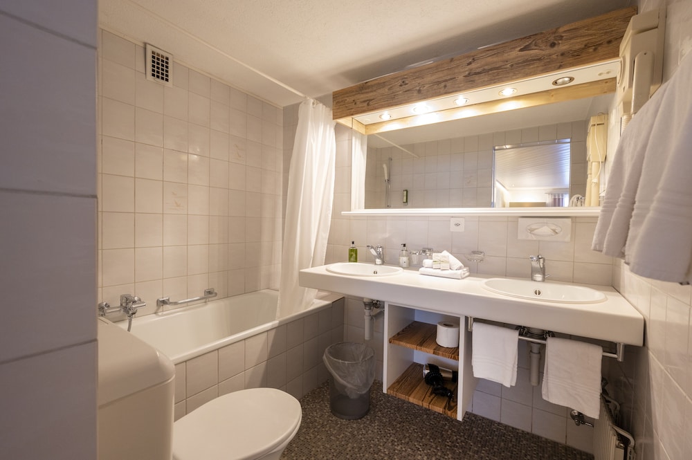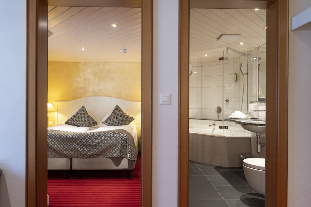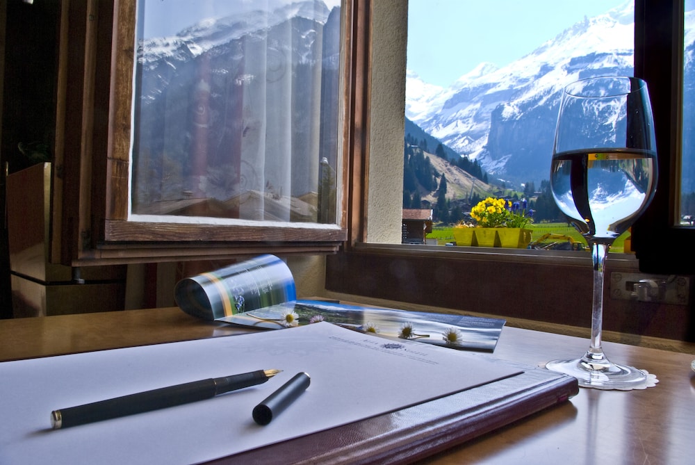 What a lovely hotel in a beautiful location. Staff were all friendly and worked really hard to serve the guests. We booked on a half board basis with picnic lunch through a walking holiday company and the food was excellent. Traditional Swiss breakfast of cold meats and cheese, various breads, rolls and croissants with jams, honey & Nutella, as well as boiled eggs and cereals, yoghurts and fruit. The evening meals were superb, very tasty and well presented. Drinks were quite expensive at the bar, particularly the wine. The guest lounge was well equipped with a free pool table and games. There is a small pool and sauna downstairs but we didn’t get time to use them. Rooms were very clean and comfortable with magnificent views of the mountains. A hairdryer was provided and a coffee machine, but no milk. Would have preferred a kettle and choice of tea or coffee etc. Hotel is in great location to access the train station, bus stops and gondolas and cable cars up to the three different mountains. Highly recommend a stay here. Imagine it would be really cosy in the winter.