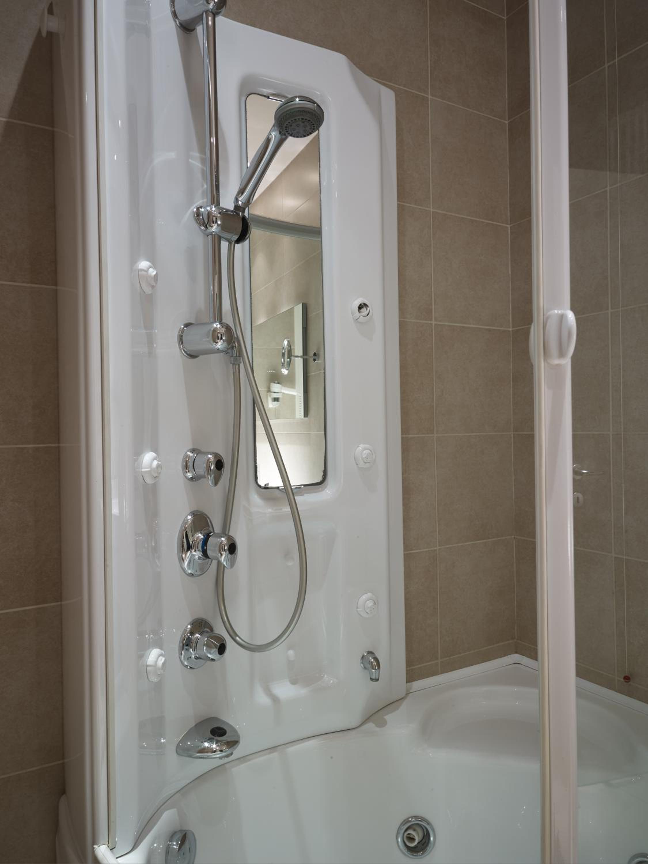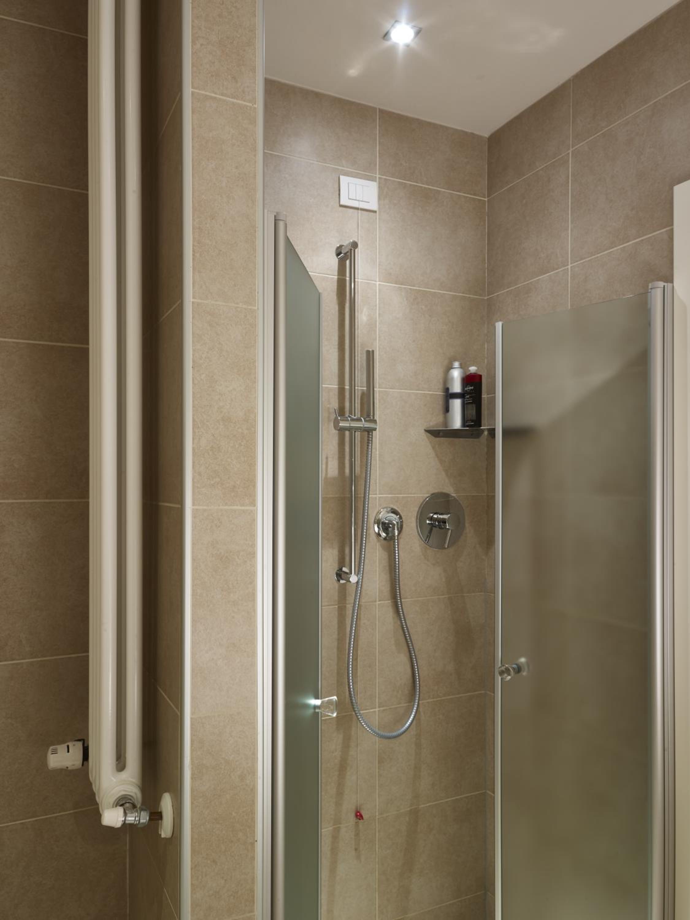 Kleine Dusche, Zimmer im Erdgeschoss laufen immer Leute vorbei. Keine Privatsfähre.