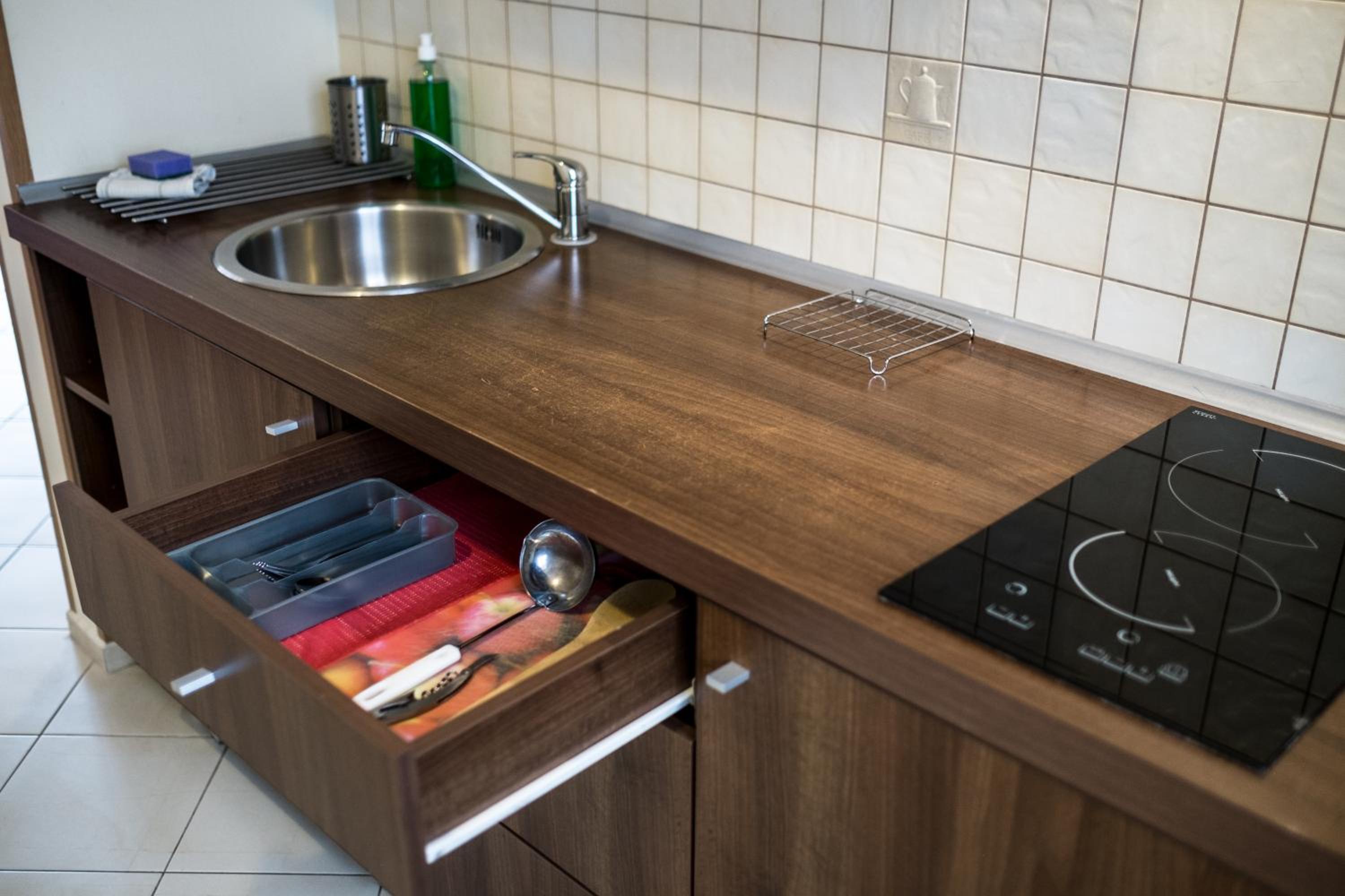 Kevés szekrény és pakolási lehetőség, a fürdőszoba nagyon kis méretű.