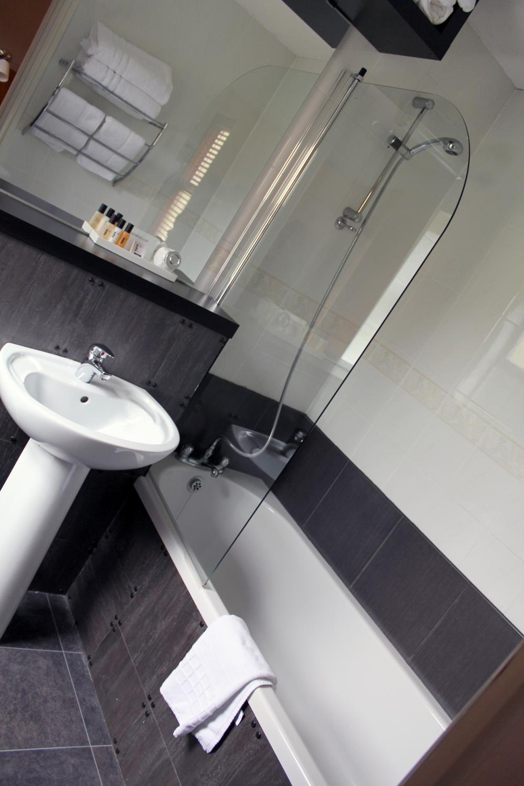 In shower/bath. Additional breakfast charge and spa charge.