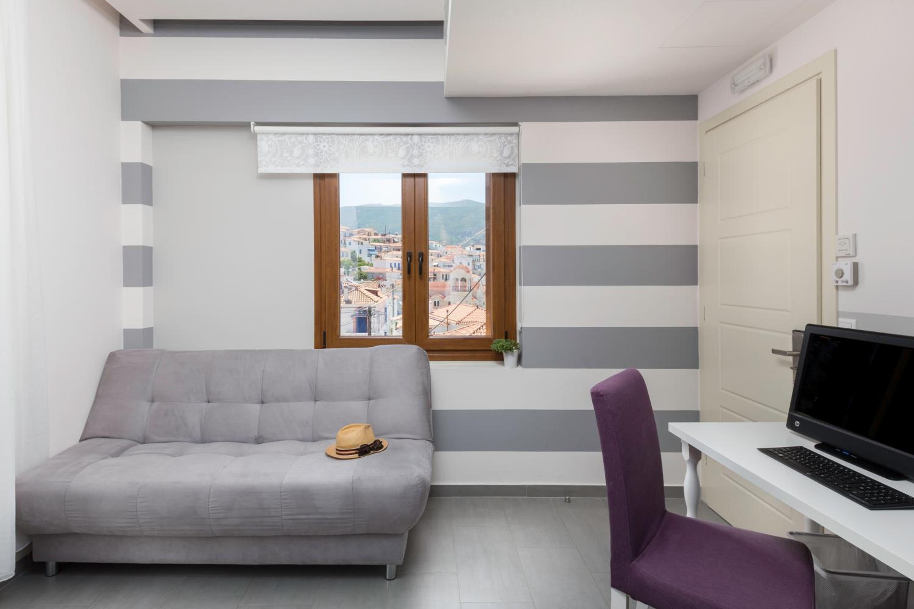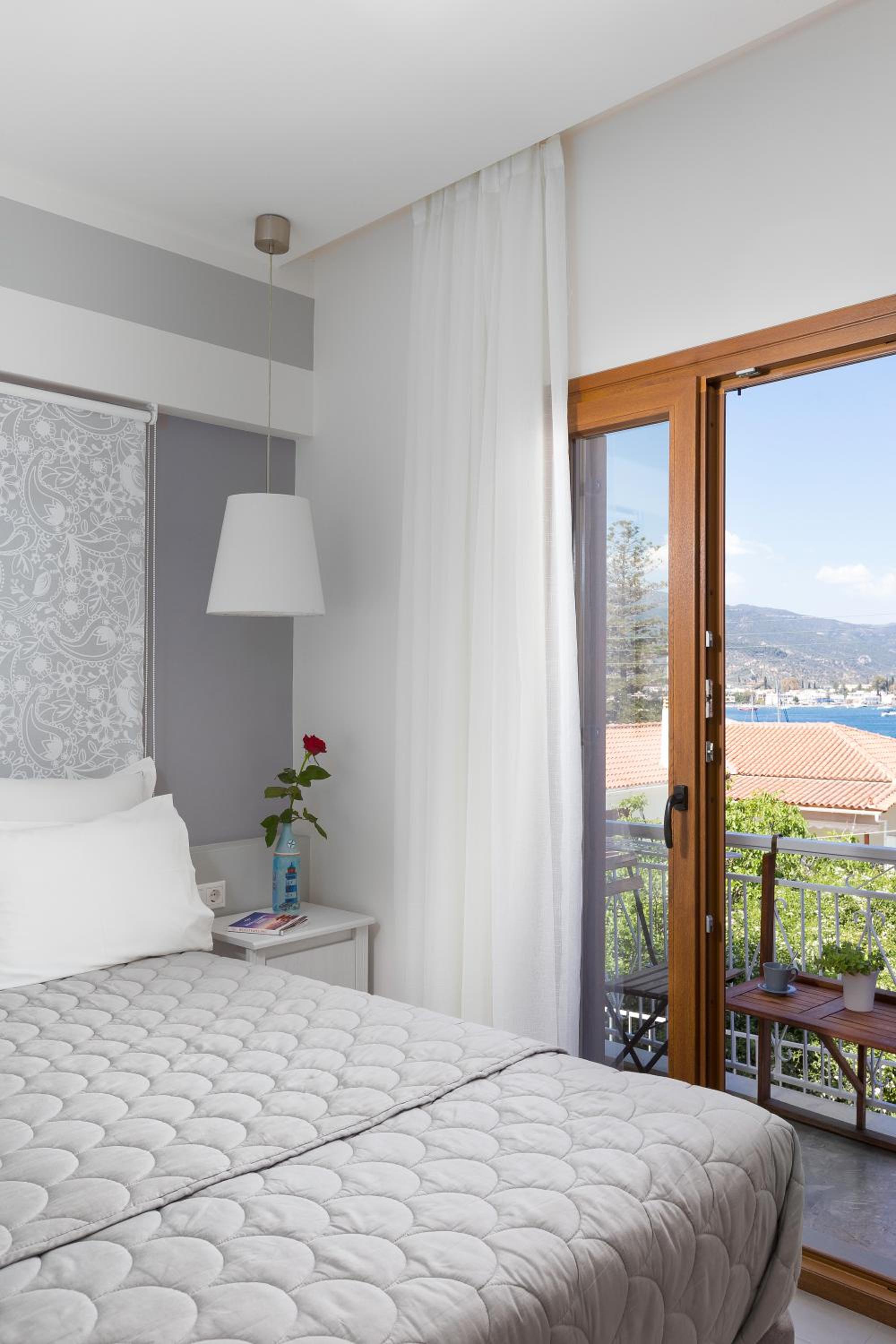 Experience the beauty of Poros from the comfort of your sea-view balcony at Dimitra Hotel. The modern, air-conditioned rooms are elegantly decorated in blue and white tones, offering a relaxing atmosphere for your stay. Enjoy the convenience of amenities such as a flat-screen TV, computer, minibar, and hydromassage showers in the bathrooms.