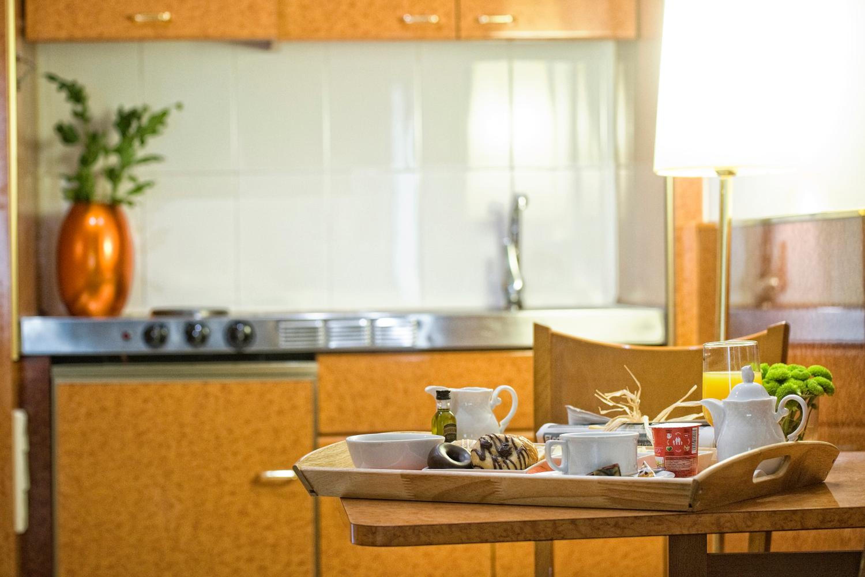 Zajtrk prinesejo v sobo po naročilu prejšnjega dne, ker nimajo restavracijskega dela. V apartmaju ni skodele za kosmiče ali kompote. Oprema za kuhinjo je osnovna. Vsi pripomočki za čiščenje v kuhinji so dani.Vse je zelo čisto in odlično deluje.Odlična lokacija za transporte, ker je postaja metroja oddaljena samo 100 metrov.