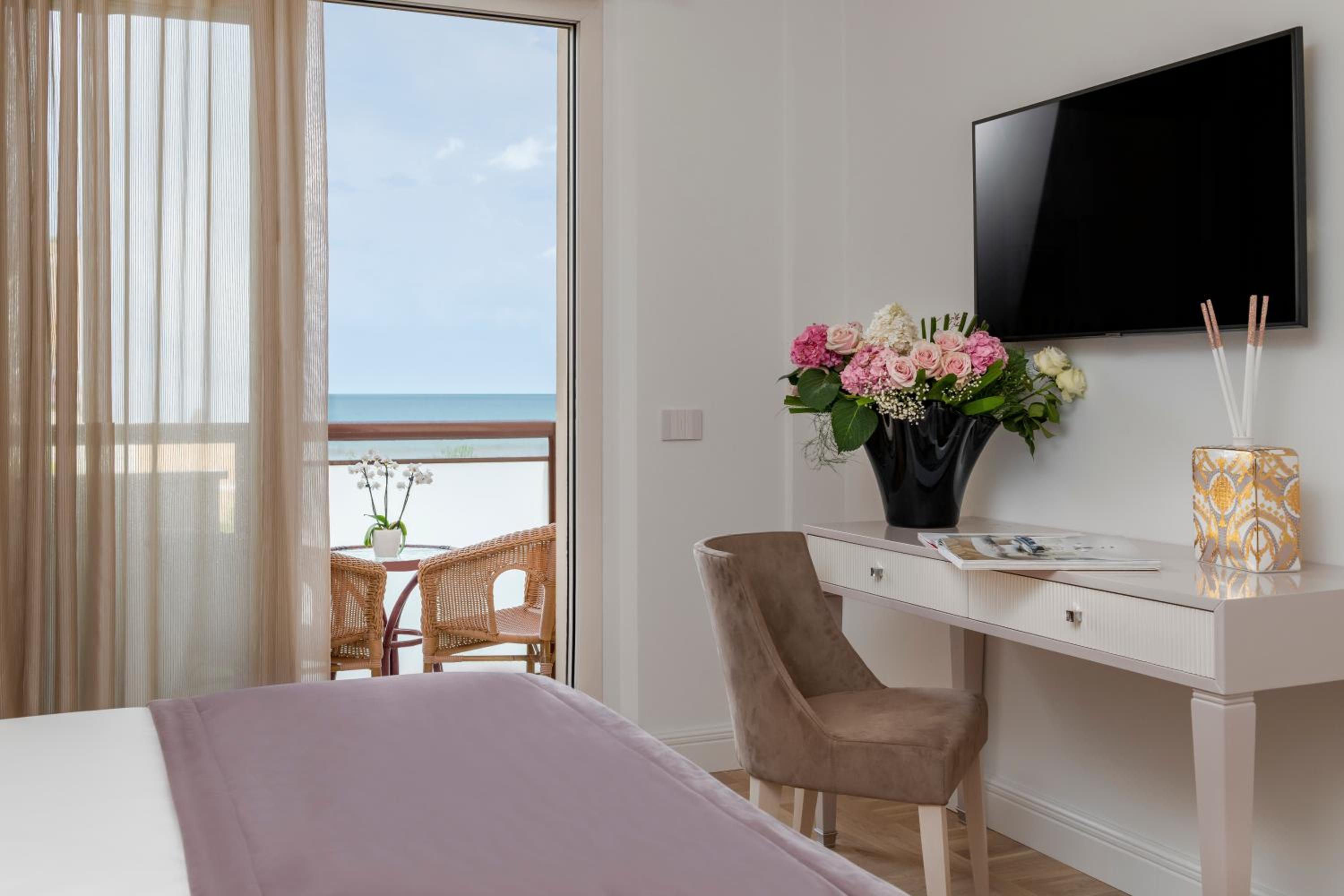 The Grand Hotel Gallia in Milano Marittima offers elegantly decorated rooms with high-ceilings, large windows, and private balconies. Each room is equipped with modern amenities such as air-conditioning and free WI-FI, ensuring a comfortable stay.