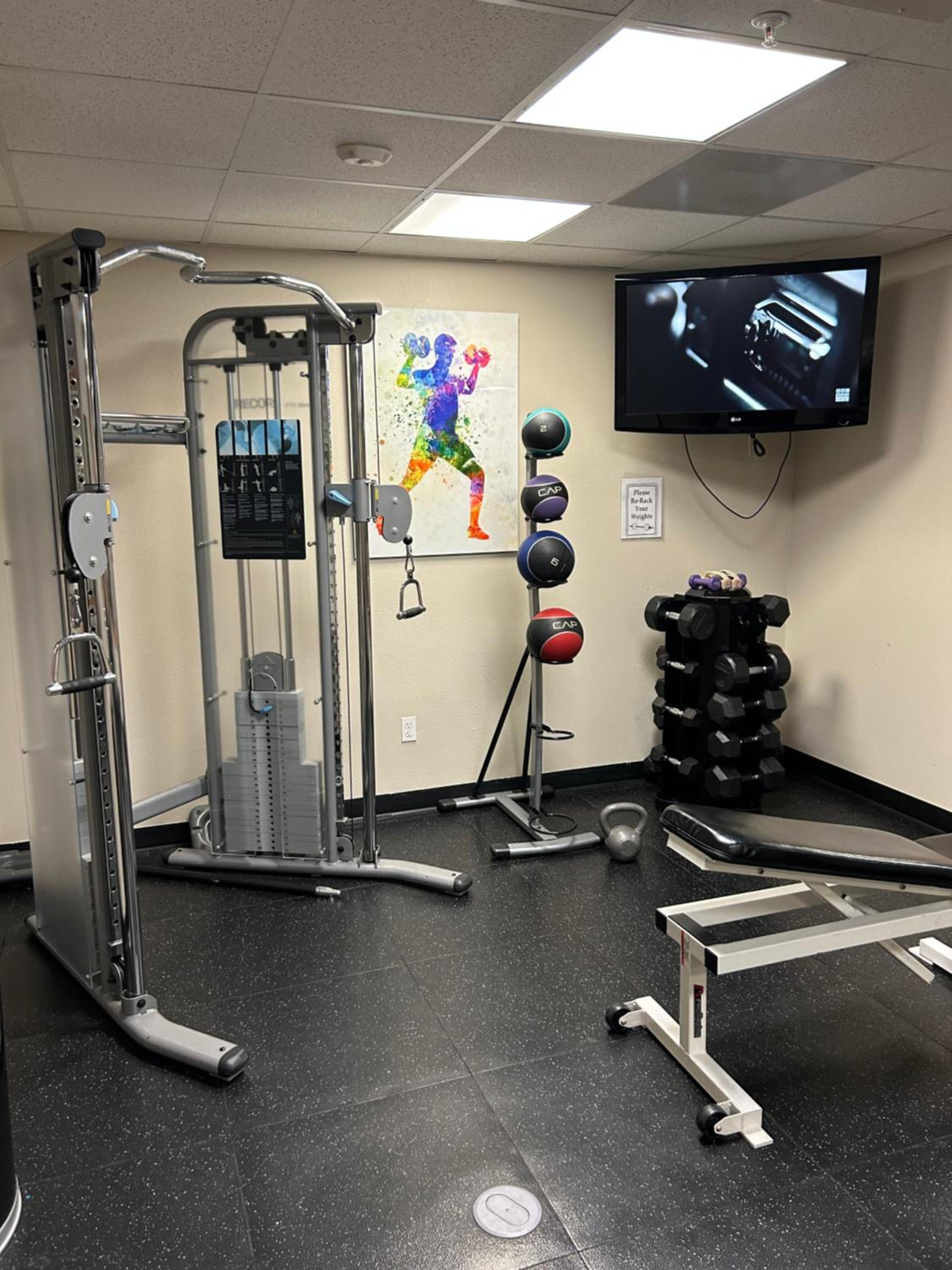 Front desk was personable and friendly.Exercise room had weights!