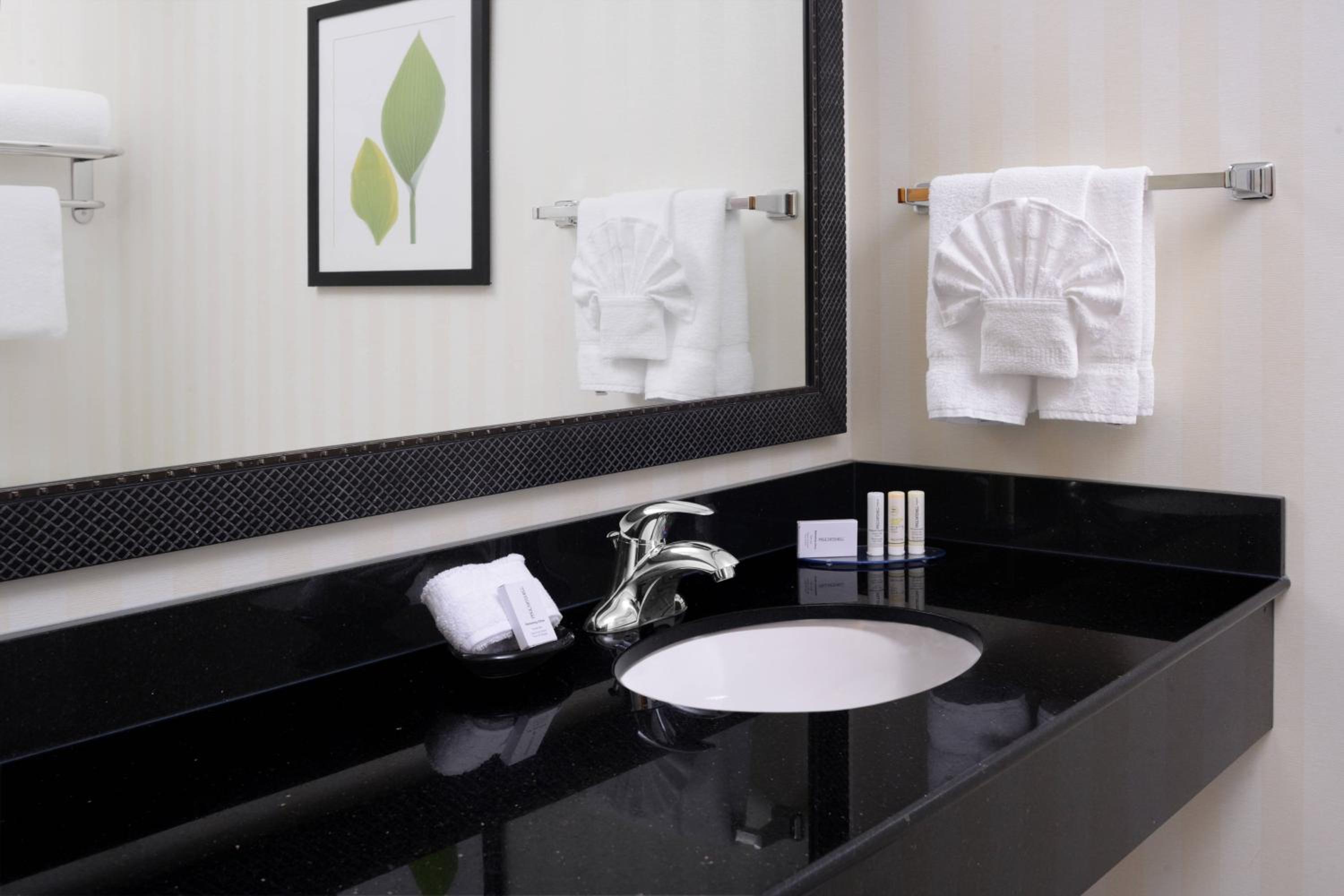 This property seems very old and tired. Breakfast selections not very good or well stocked at 8am. Requested a feather free room and told it was but wasn’t even though checked and later someone brought non feather pillows. Room smelled mildewy. The night table between beds had no lamp and very scuffed/scratched up. Definitely a lack of lighting in the room. Bathroom had one switch which turned on both light and fan. Fan so loud it was quite excessive and annoying but you couldn’t have just light on. The one lamp on a wall had a lampshade full of tears in it. One of the bottles on wall in shower was empty. One of the worst Fairfield Inns we have ever stayed at.