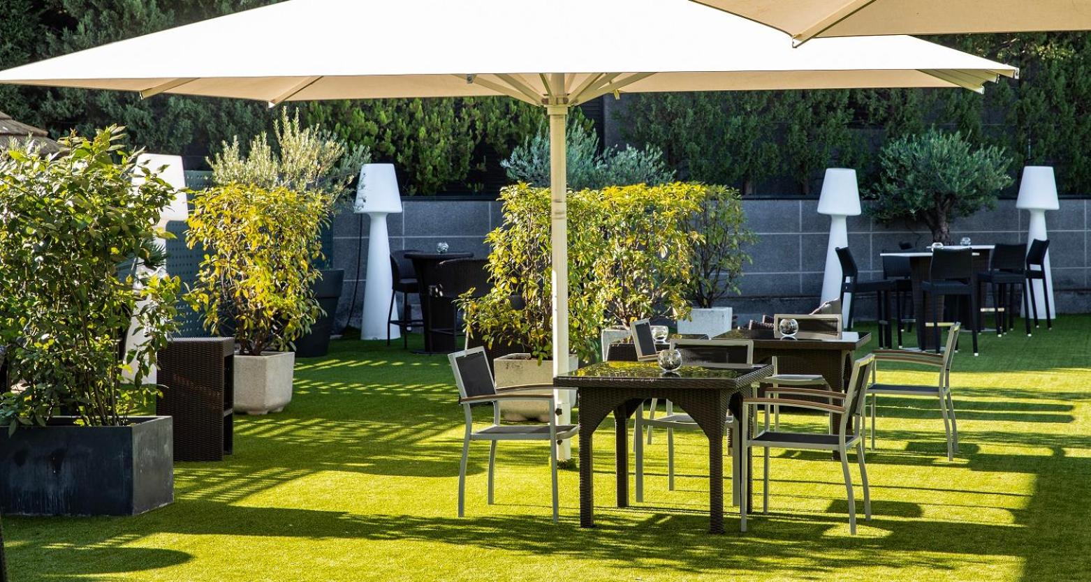 Indulge in delicious modern Mediterranean cuisine at the hotel's restaurant, or relax at the café-bar. The dining area's unique glass roof and palm trees create a charming ambiance for your meals. During the summer, guests can enjoy the hotel's pool and sun terrace, perfect for unwinding after a day of exploring Madrid.