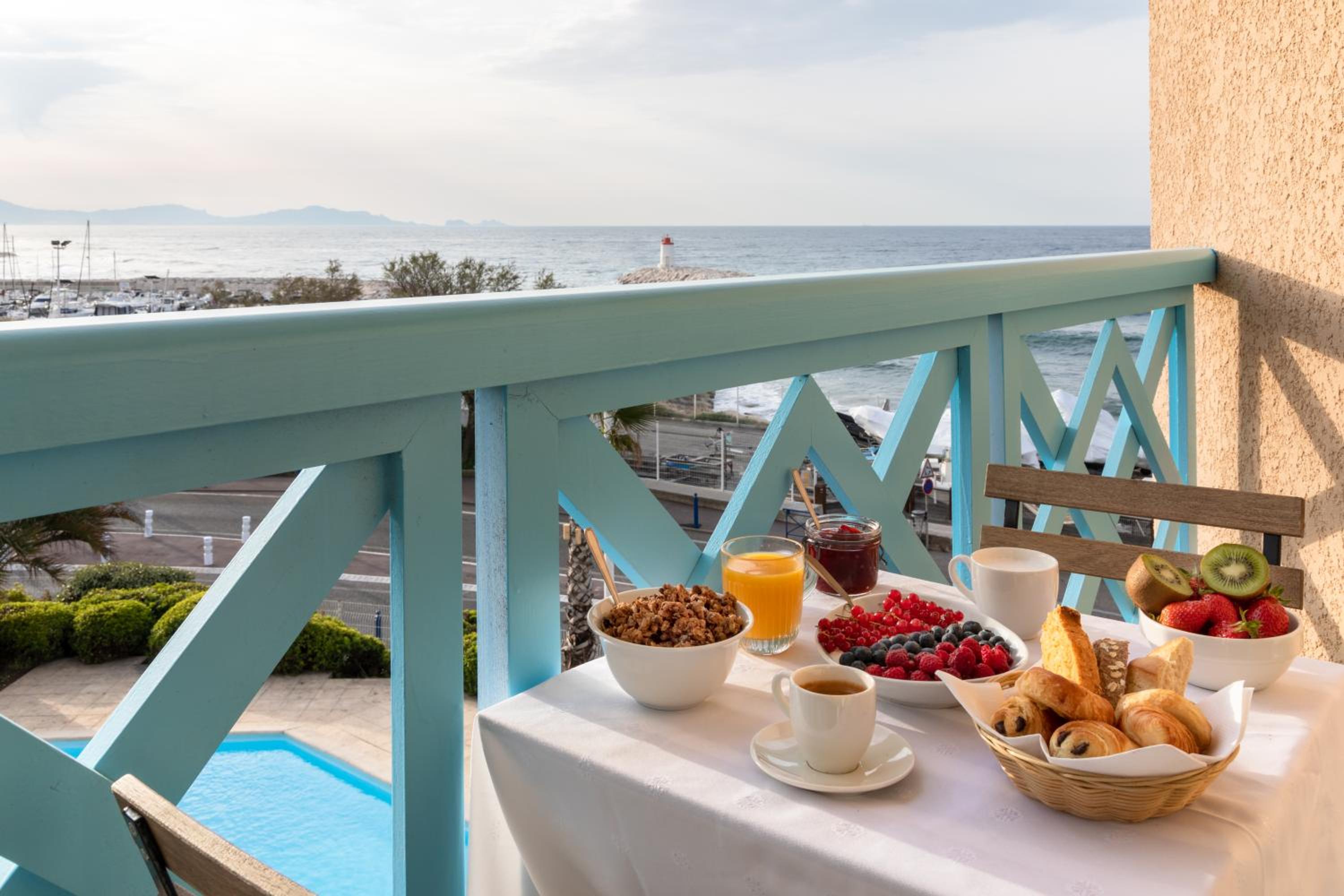 La situation de l'hôtel est top. La décoration est très belle. Les chambres sont superbes, nous avons passé une excellente nuit. Petit-déjeuner avec vue sur la piscine et la mer, un instant magique. Le parking gratuit très appréciable.