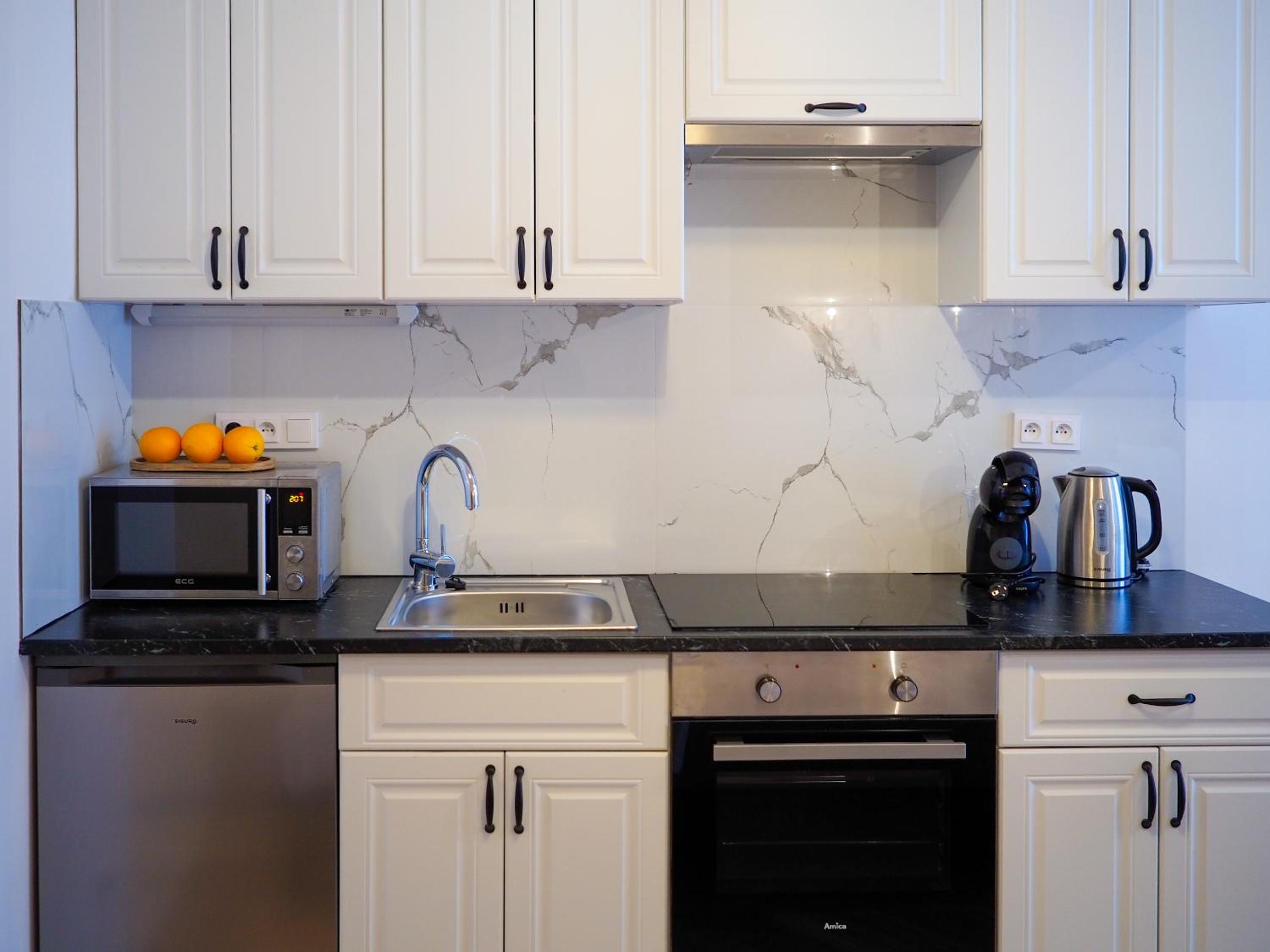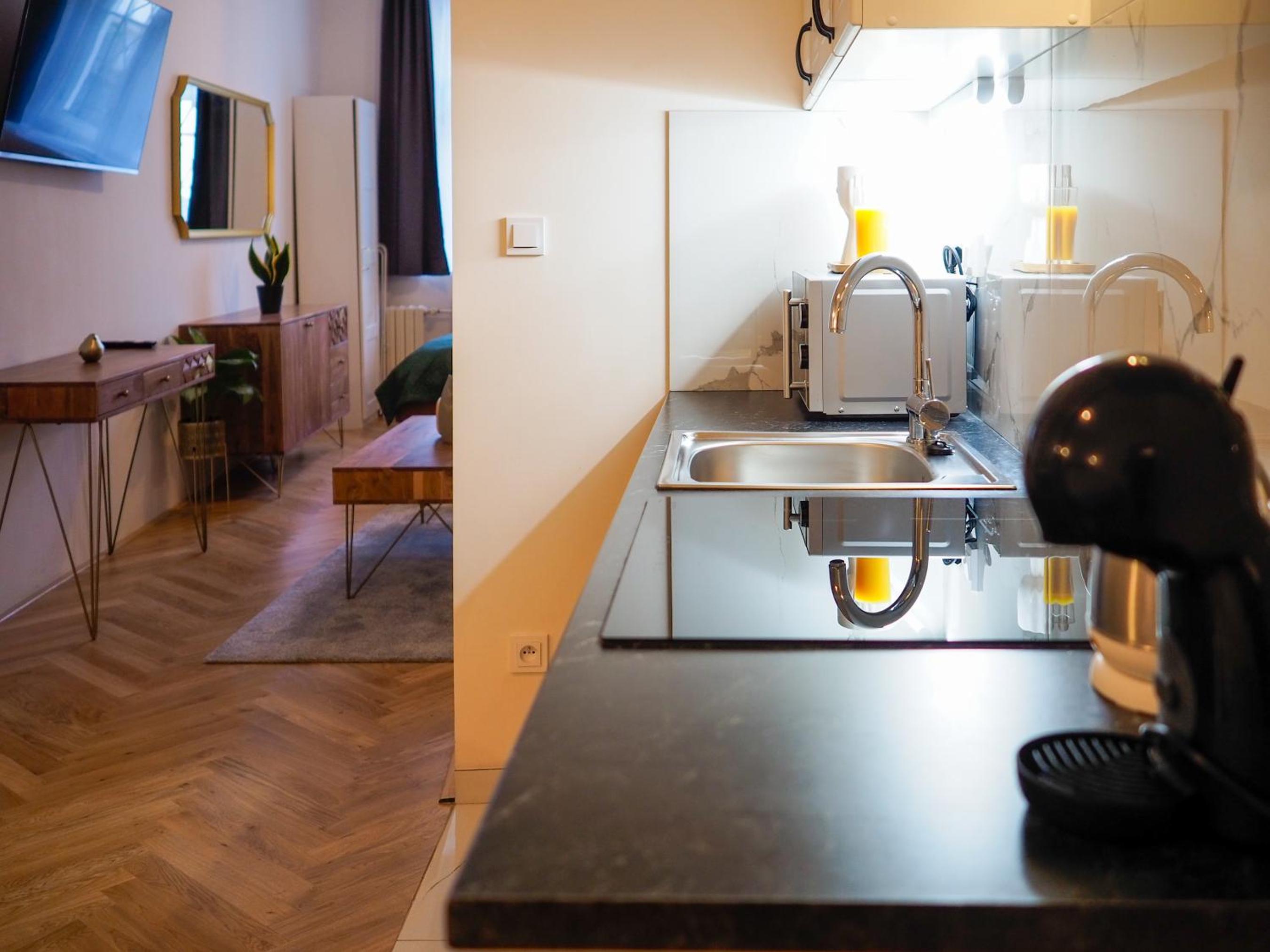 I will read booking’s description better next time. It was not an apartment but a regular hotel room, so no kitchen. Hotel room where no staff is available, no option to leave luggage at place, they do propose that service in a hotel nearby, but that costs 5eur per bag.