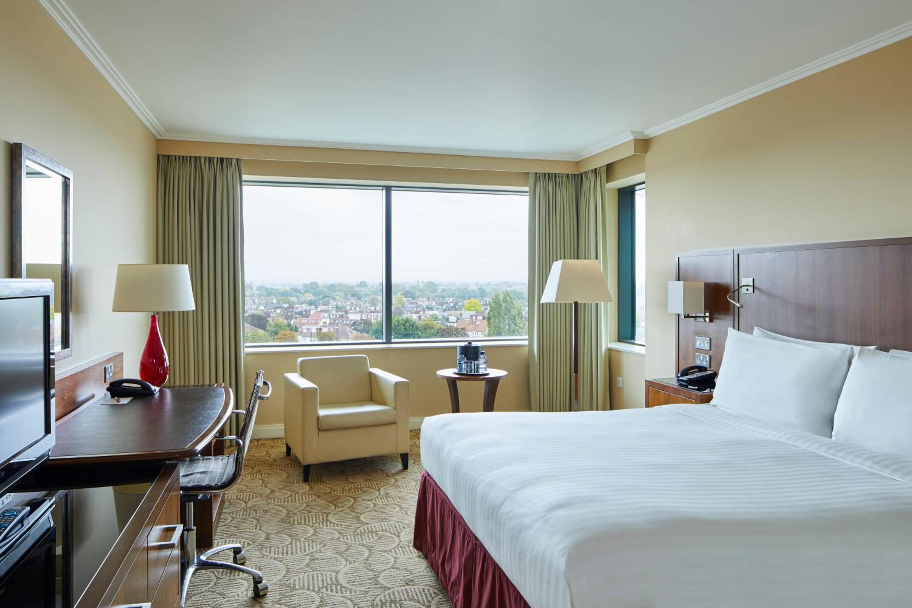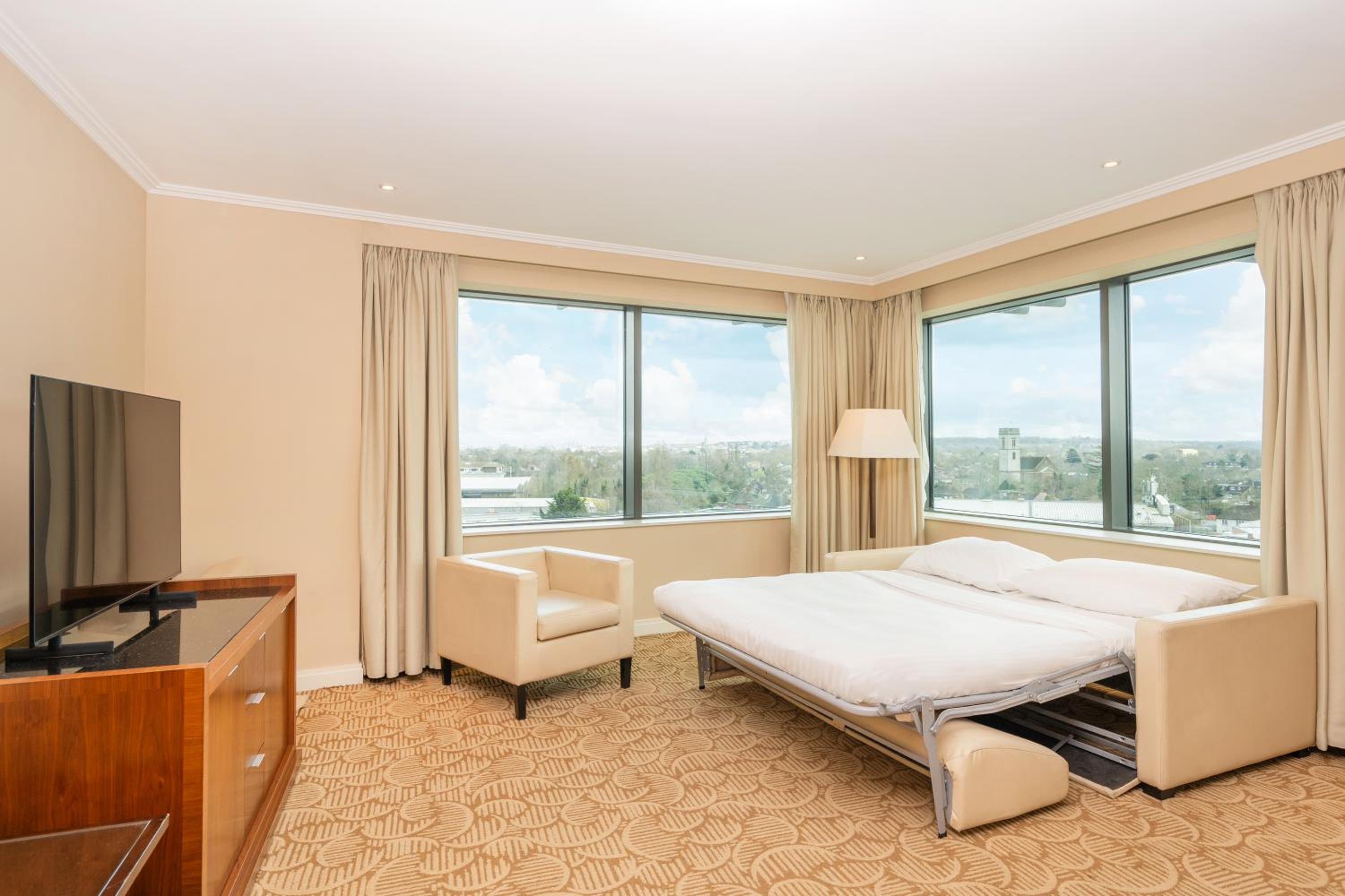 Indulge in comfort with our large en suite rooms featuring Marriott Revive bedding and 32-inch LCD flat-screen TVs with free satellite channels. Enjoy your favorite shows on Sky One and Sky Sports 1, 2, and 3.