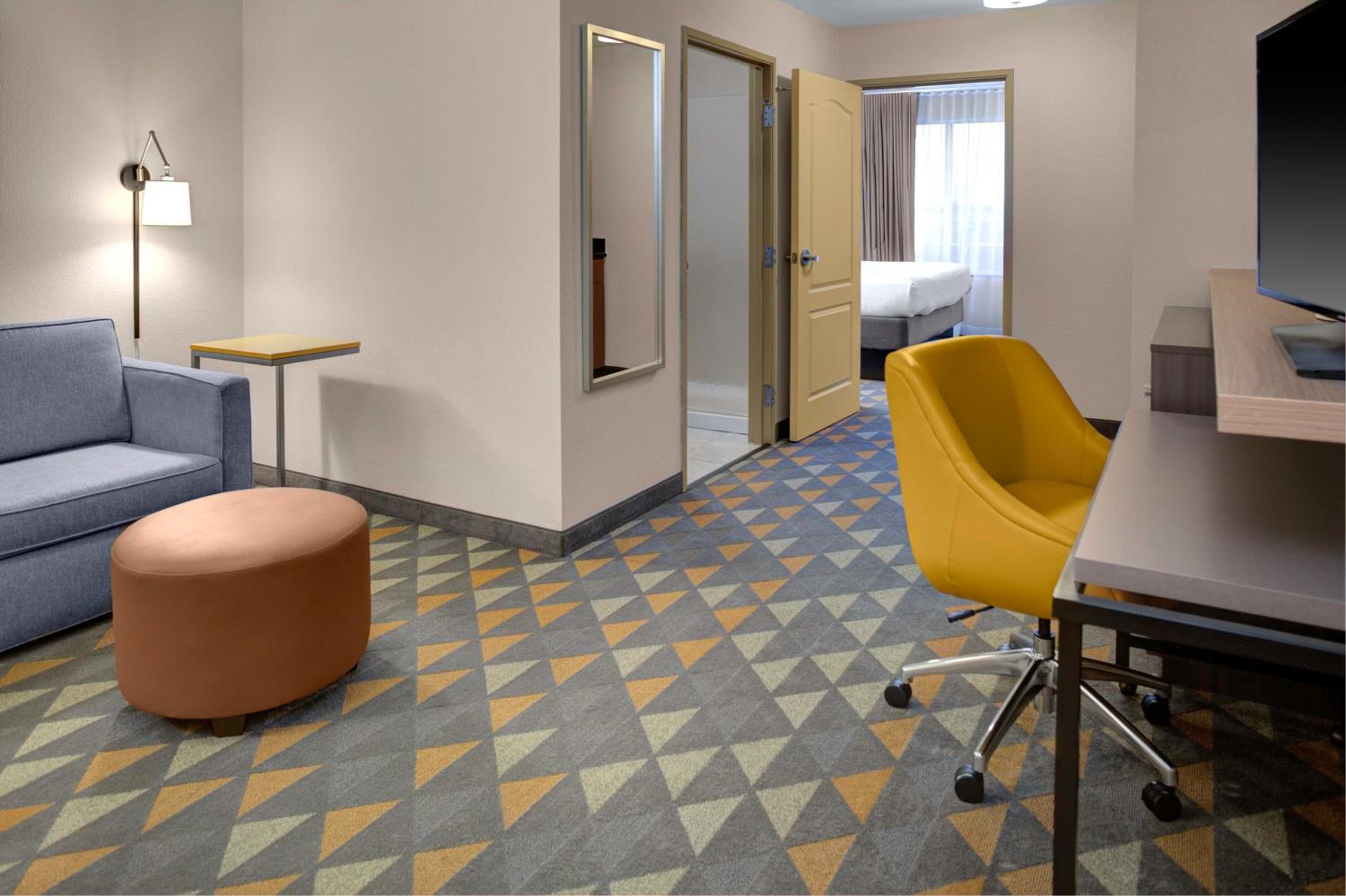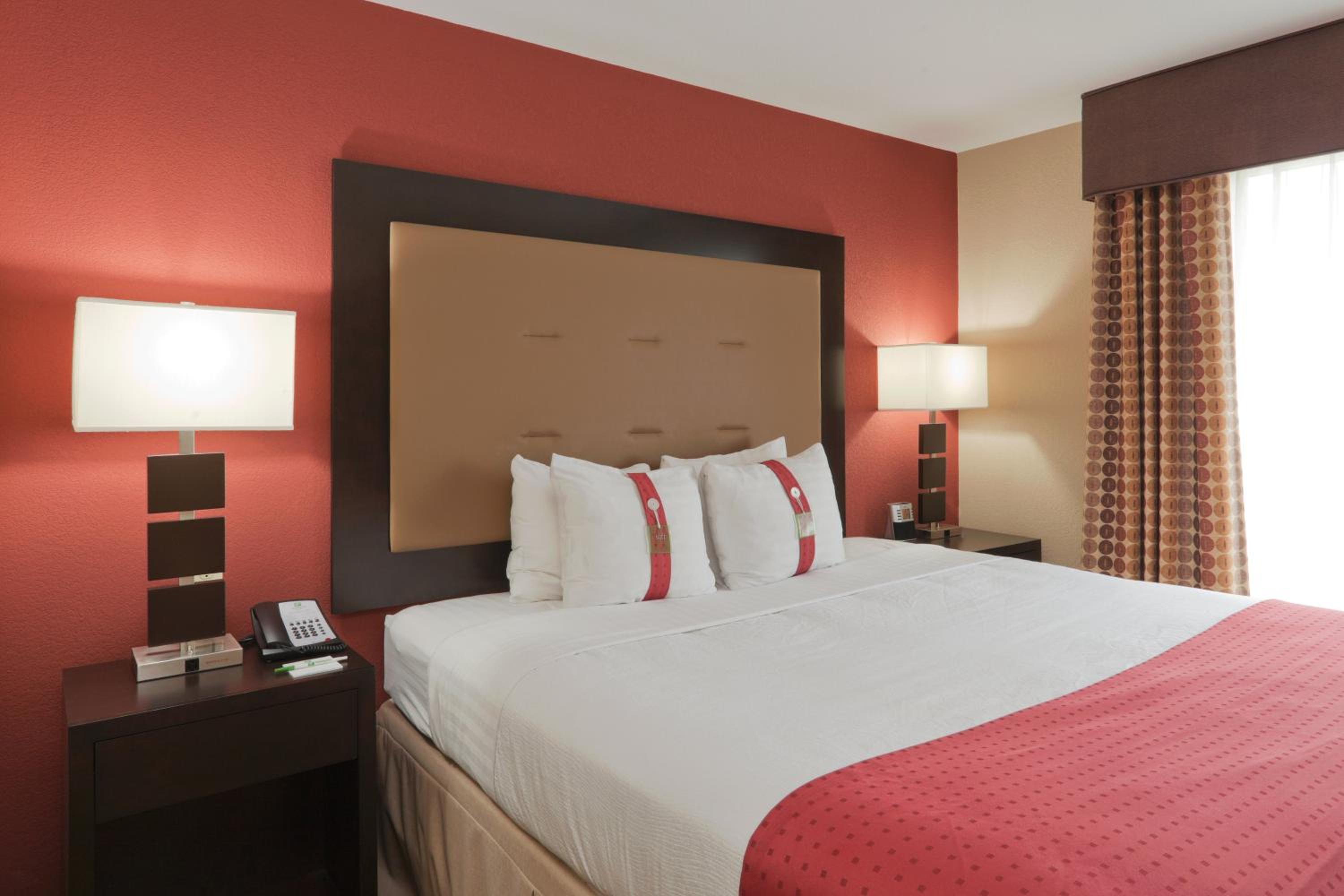 Holiday Inn Hotel and Suites Lima offers modern accommodations with free Wi-Fi, flat-screen TVs, and a work desk. Each room features warm colors and modern decor, along with convenient amenities like a microwave, mini-refrigerator, and in-room coffee maker.