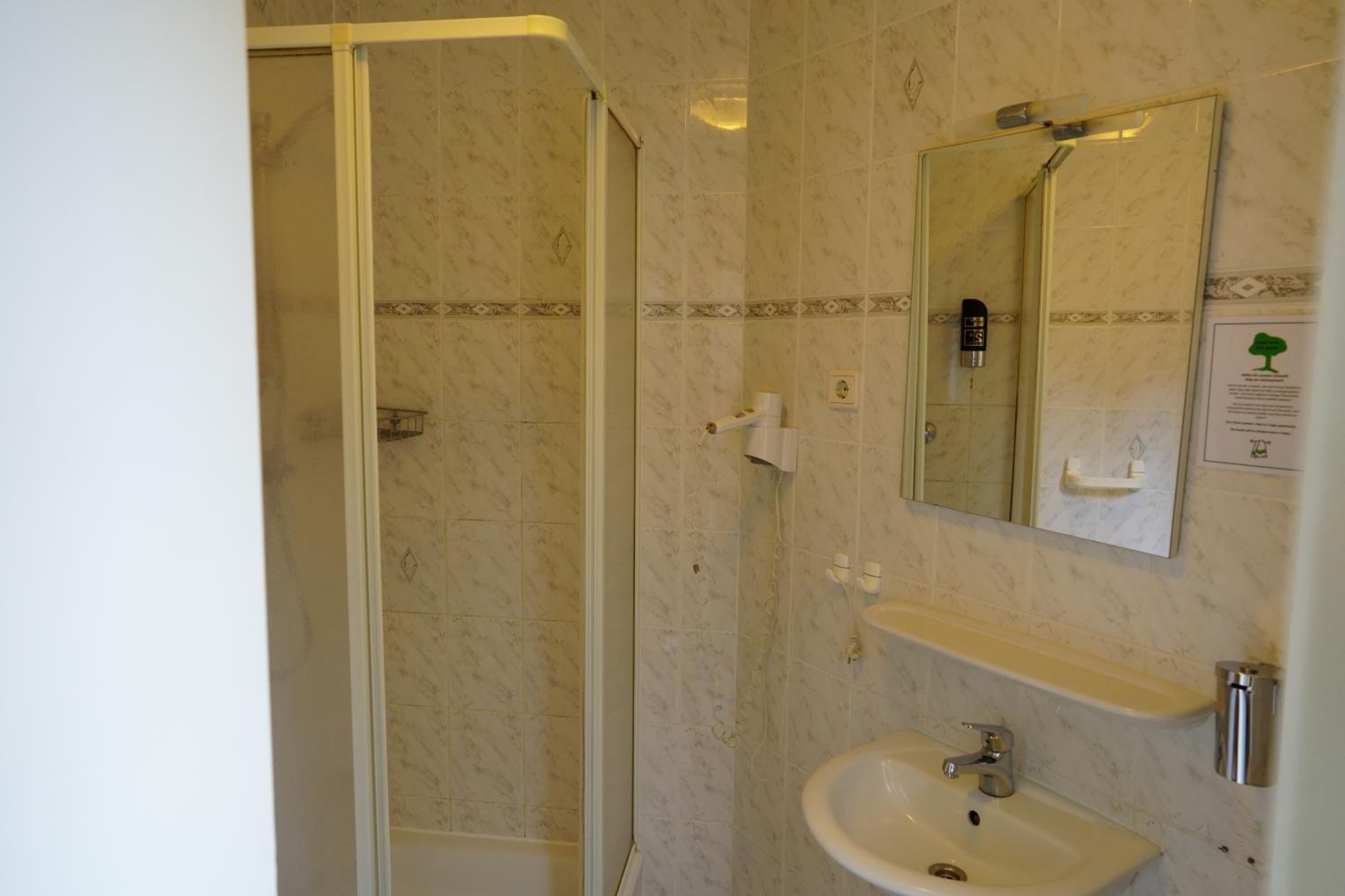 Fußbodenbelag sollte dringend ausgetauscht werden, Wände der Duschkabine defekt, warmes Wasser erst nach mehreren Minuten, kein Wasserdruck, Wasser riecht nach Chlor, TV nur bedingt verfügbar, Frühstück einfachster Standart, keine Früchte/Obst,