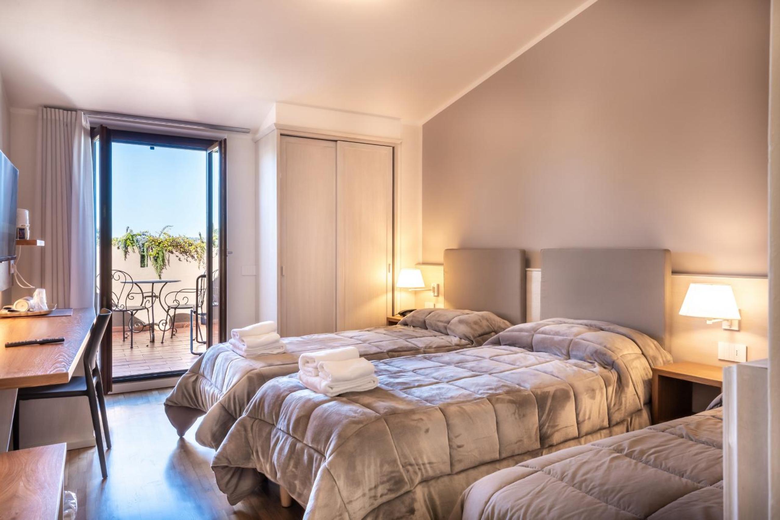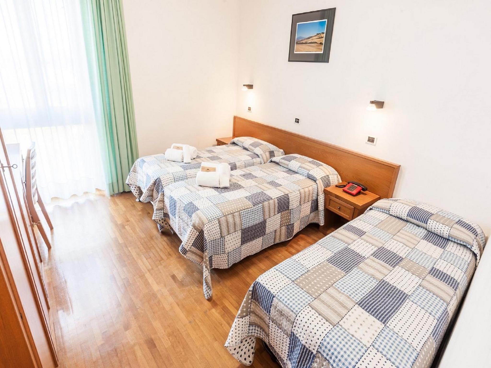 camera tripla con spazi stretti tra i letti e bagno piccolo