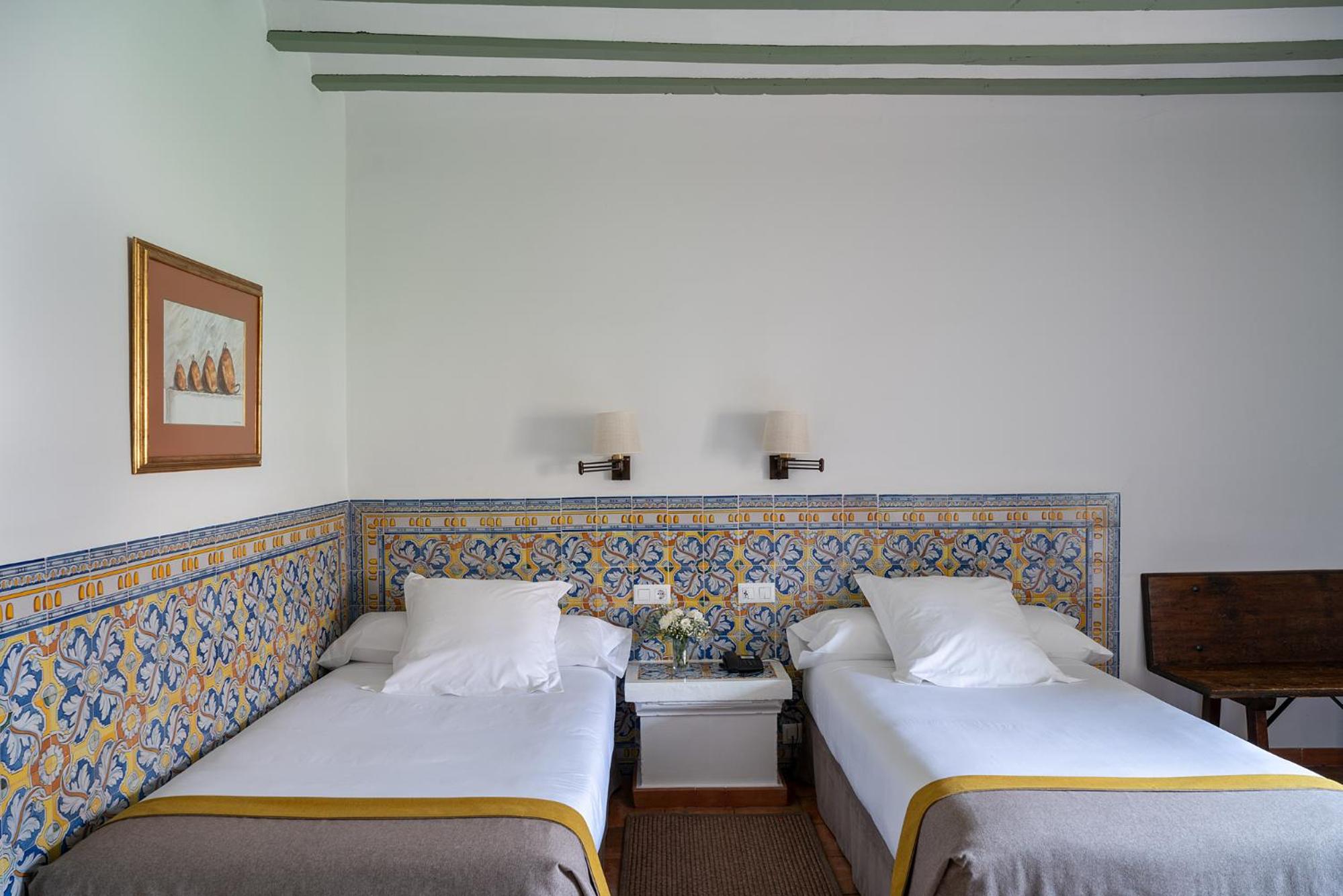 Experience the serenity of spacious, monk-inhabited bedrooms adorned with wooden beams and tiled floors. The charming details on the walls create a perfect blend of history and comfort, ensuring a unique stay.