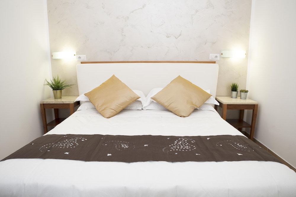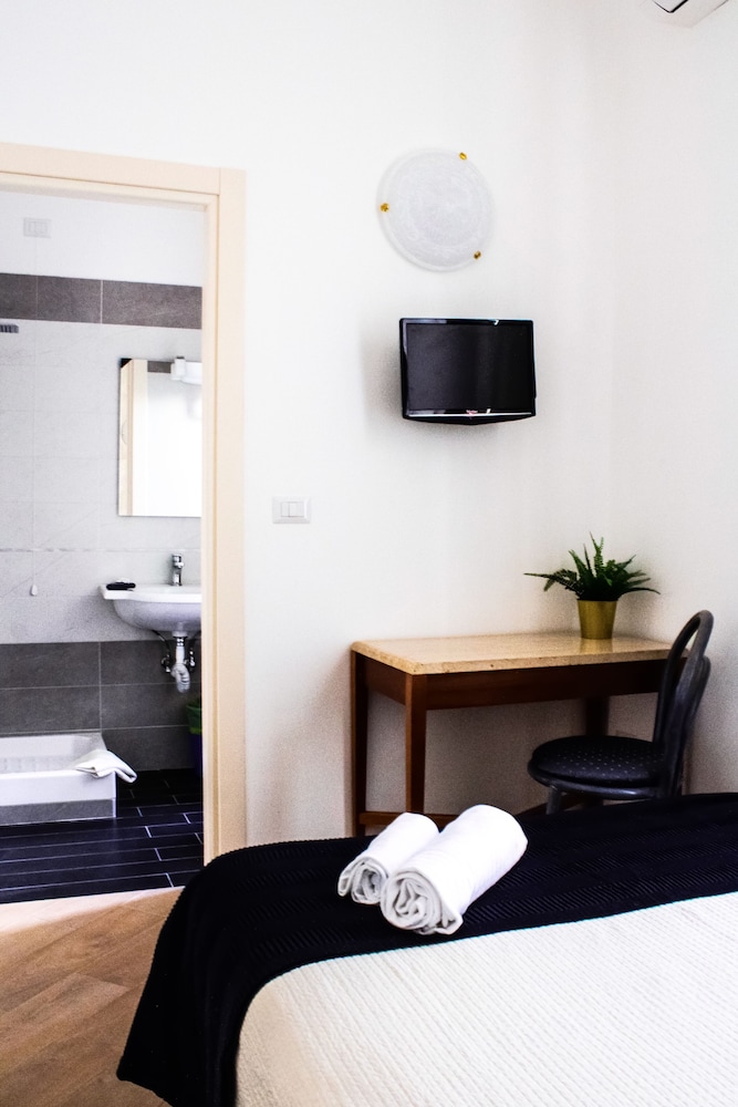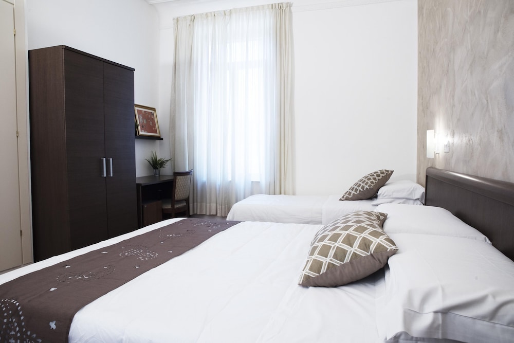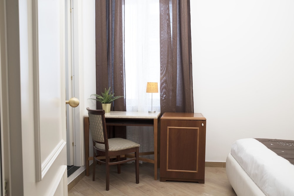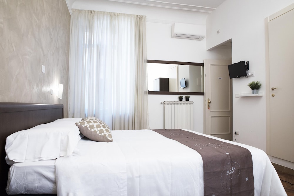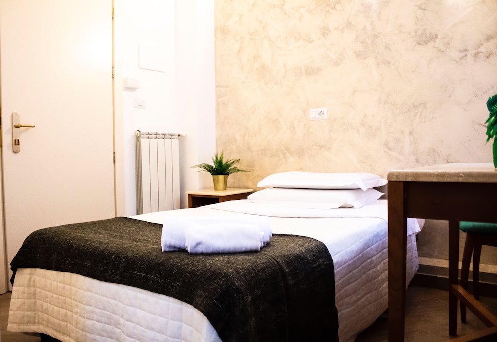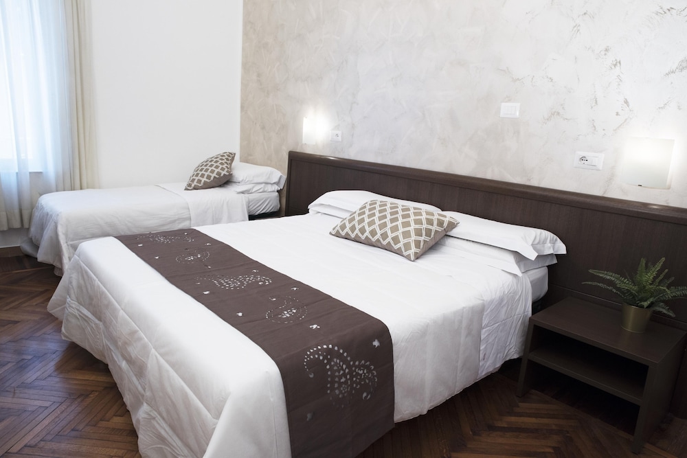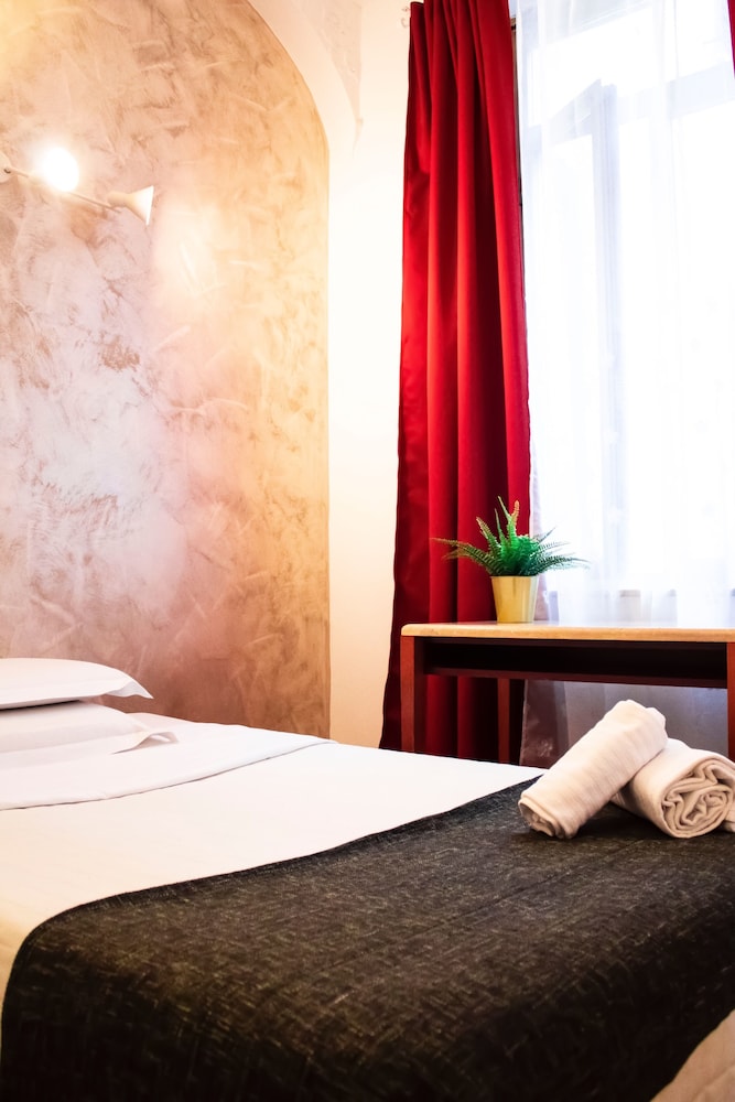 Отель бронировали зараннее, улучшенный двухместный номер с душем. Приехали в отель вечером. Администратор полузаспаный (сначала вообще думали что это какой то рабочий). Зарегистрировал, поселил, за электронный ключ взял залог 10 евро рублей. Номер относительно недавно отремонтированный, обстановка номера как в советские времена, аляповатая, душ нормальный, горячая вода присутствовала, хоть было объявление что в отеле бойлер всего на 500 литров и горячая вода может закончиться. Время полного нагрева - 45 мин. Кровать ужасная: две тахты с дермантиновой обивкой а сверху положены 2 матраса. Одна тахта была про...давлена и я спал как в гамаке. Завтрак: быстрорастворимый кофе заваренный в кофейнике и по 2 сухаря на человека. Вобщем замарить червячка хватит, а потом и полноценно можно покушать в кафешке. Зато удачное расположение в исторической части Рима, недалеко вокзал, соборы и прочие достопремичательности и главное - недорого.