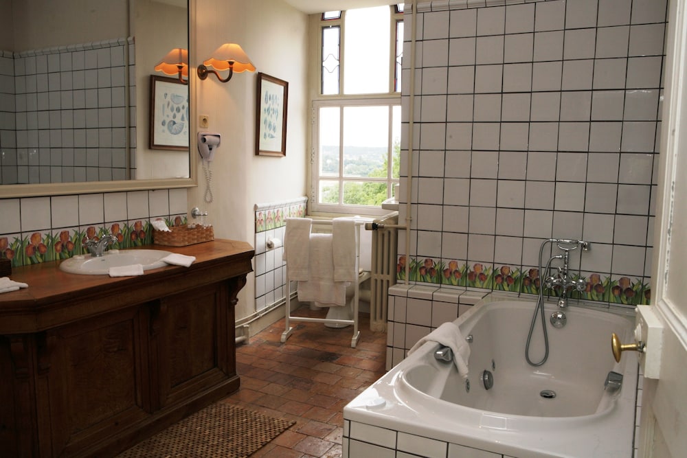 We expected to stay in the Chateau - it was not made clear when we booked that we were reserving the mill accommodation not the Chateau despite no difference in price. The room was VERY DARK although the decoration was high quality - fabric wall paper. Bathroom old fashioned but in keeping with the style BUT The shower was part of the bath and you could only have the shower head at chest height. Food in the dining room was of good quality but expensive and not as good value as another restaurant in a nearby town serving Michelin star quality food. Disappointed really as we were expecting this to be the best all round hotel of our trip = it was not.