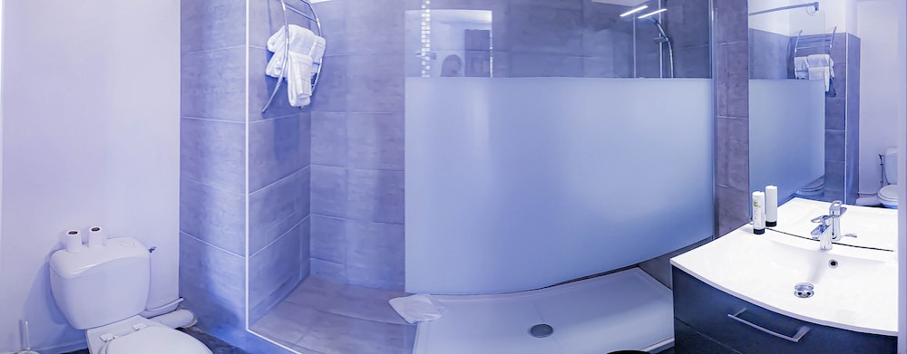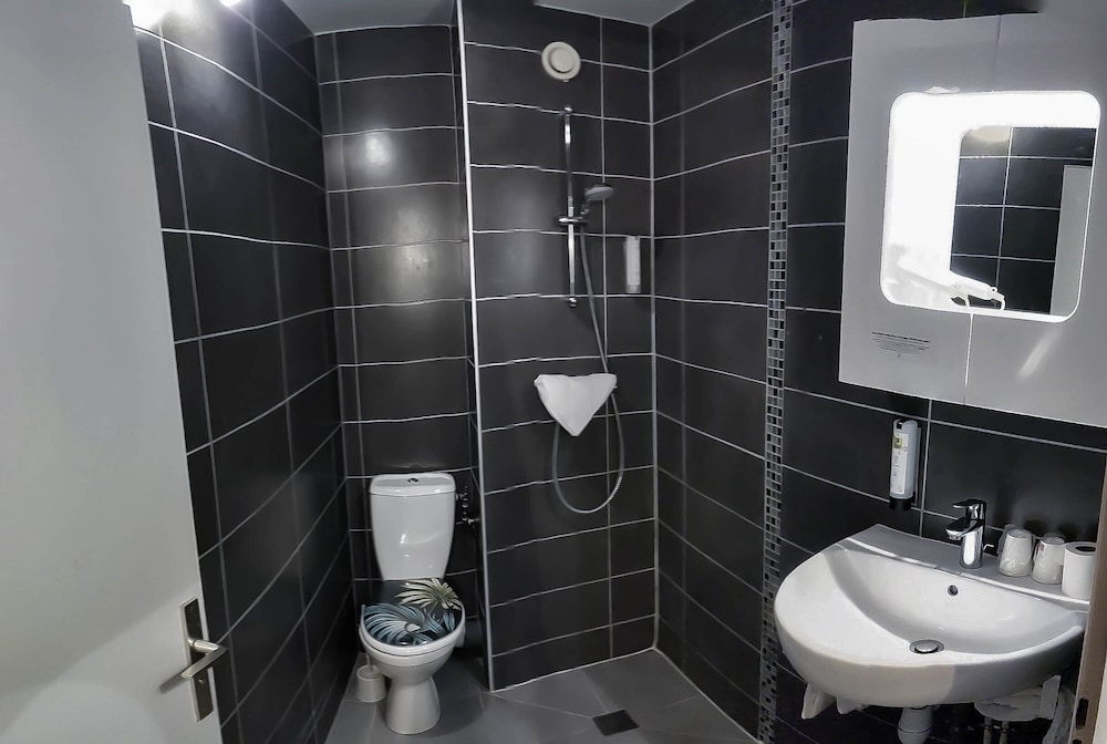 Salle de bain très petite sans rideau ni paroi de douche. Bref on met de l’eau partout et les toilettes deviennent inutilisables !!!