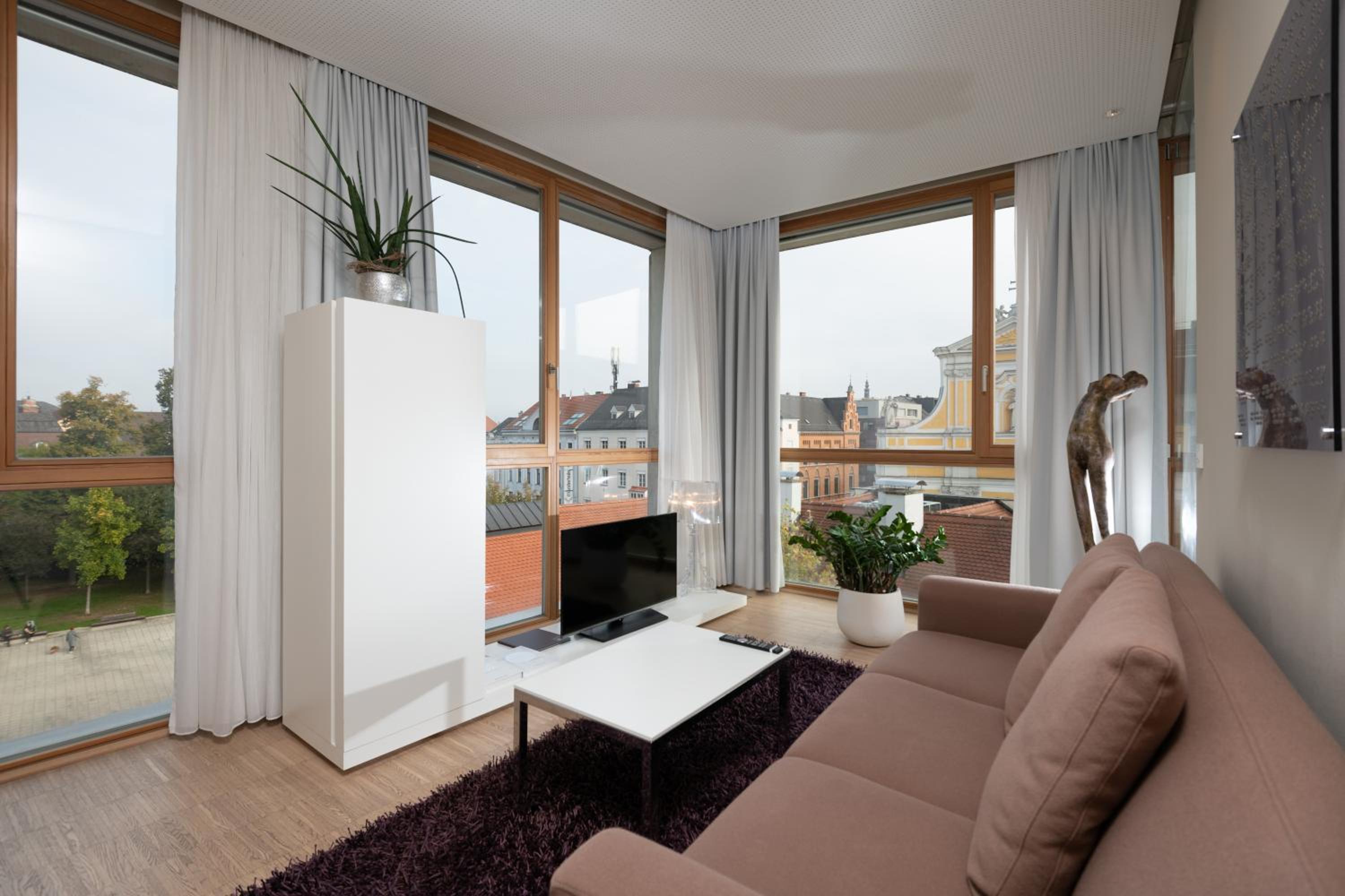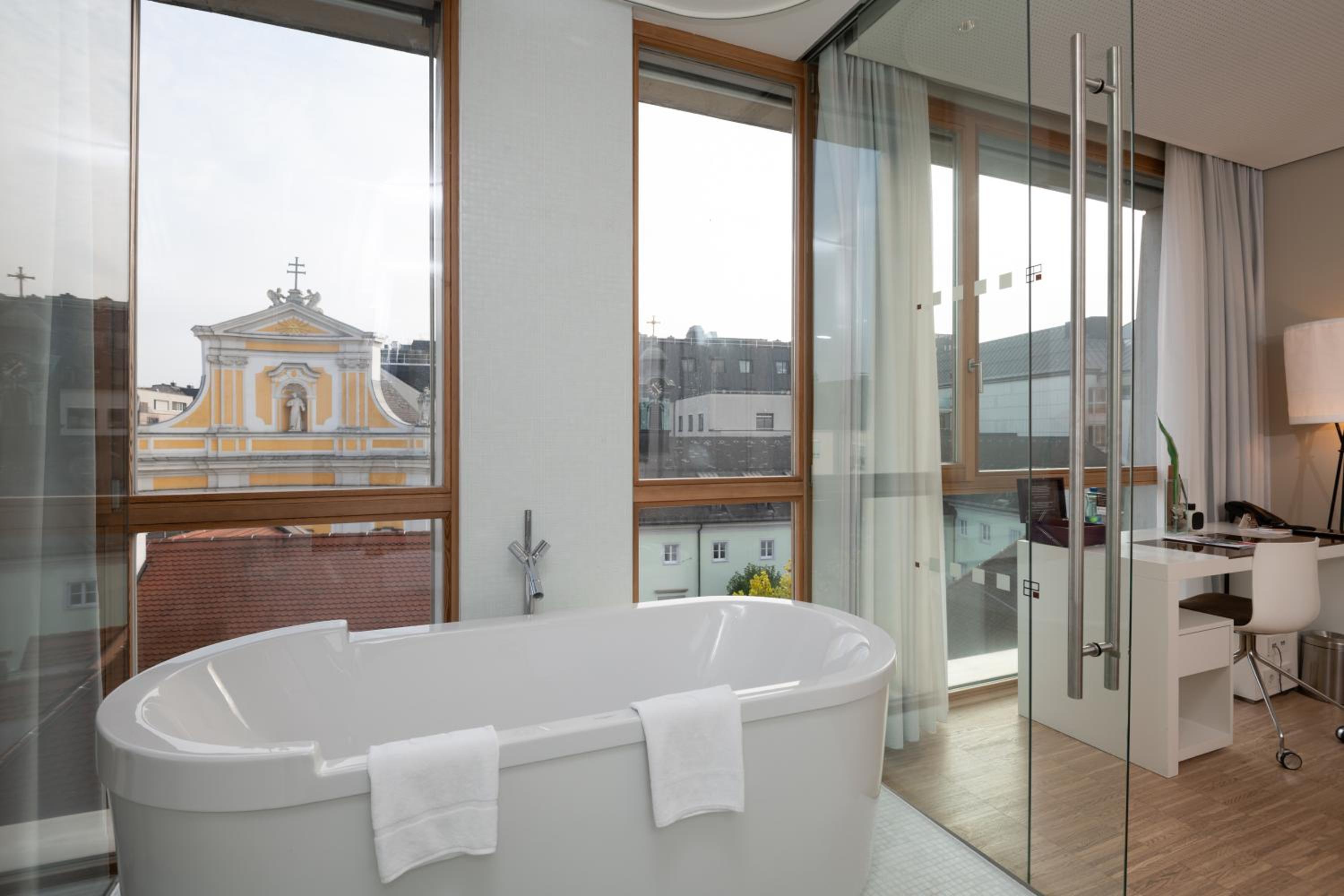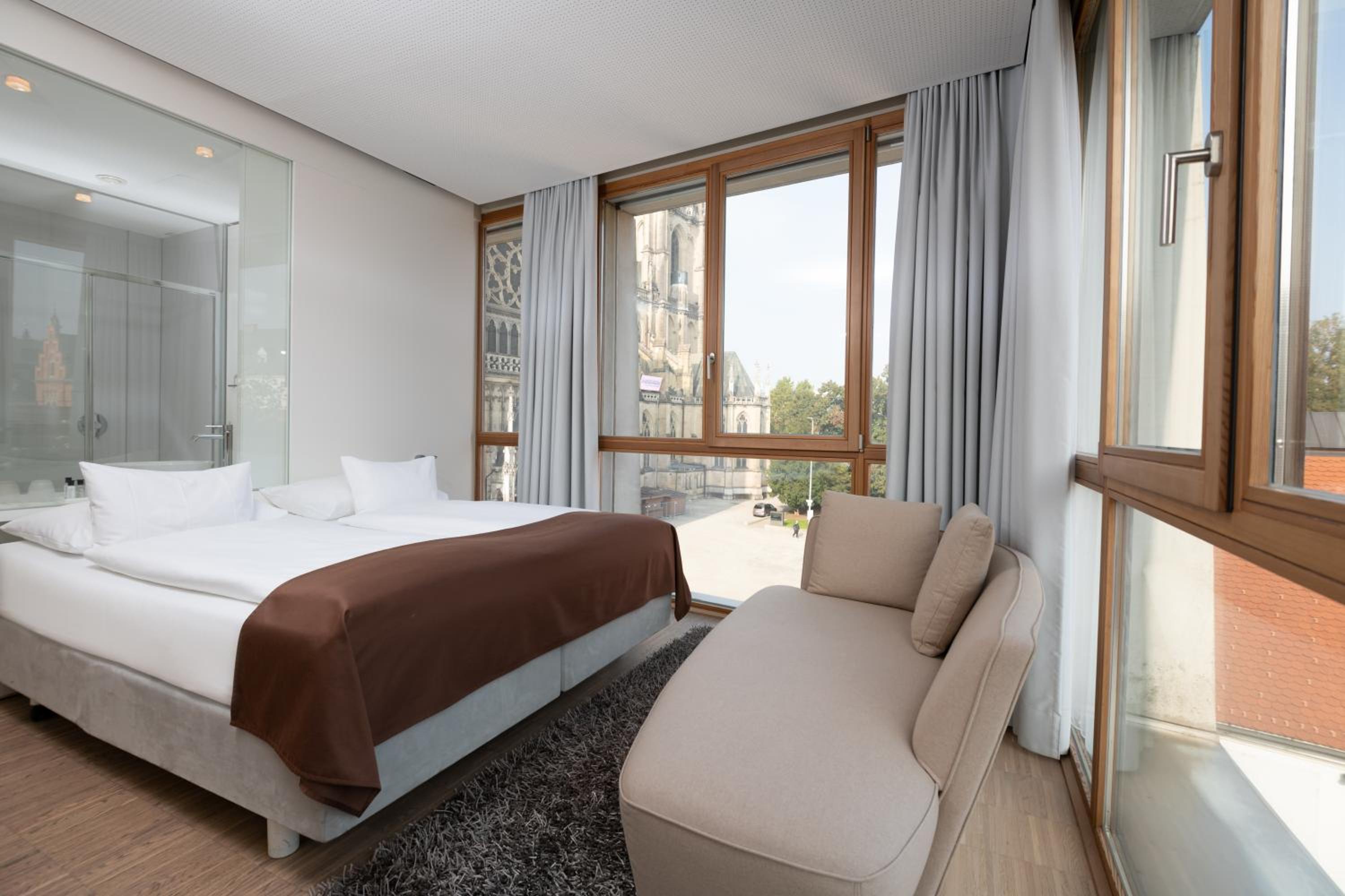 Luxurious Accommodations - Hotel Am Domplatz offers stylish rooms with modern amenities such as wooden floors, a ceiling cooling system, and underfloor heating. Enjoy stunning views of the city or the cathedral from the comfort of your room, all while staying connected with free WiFi.