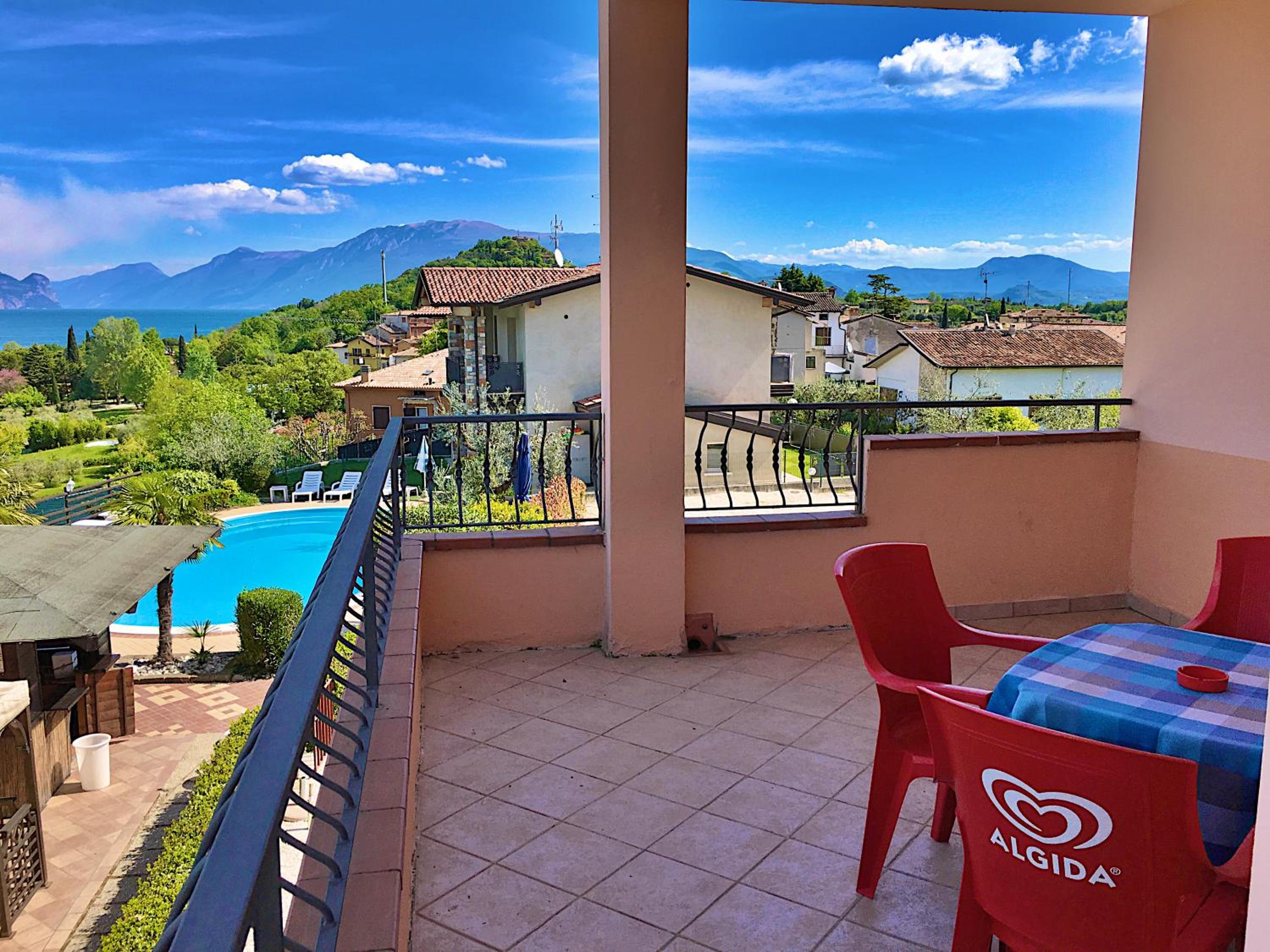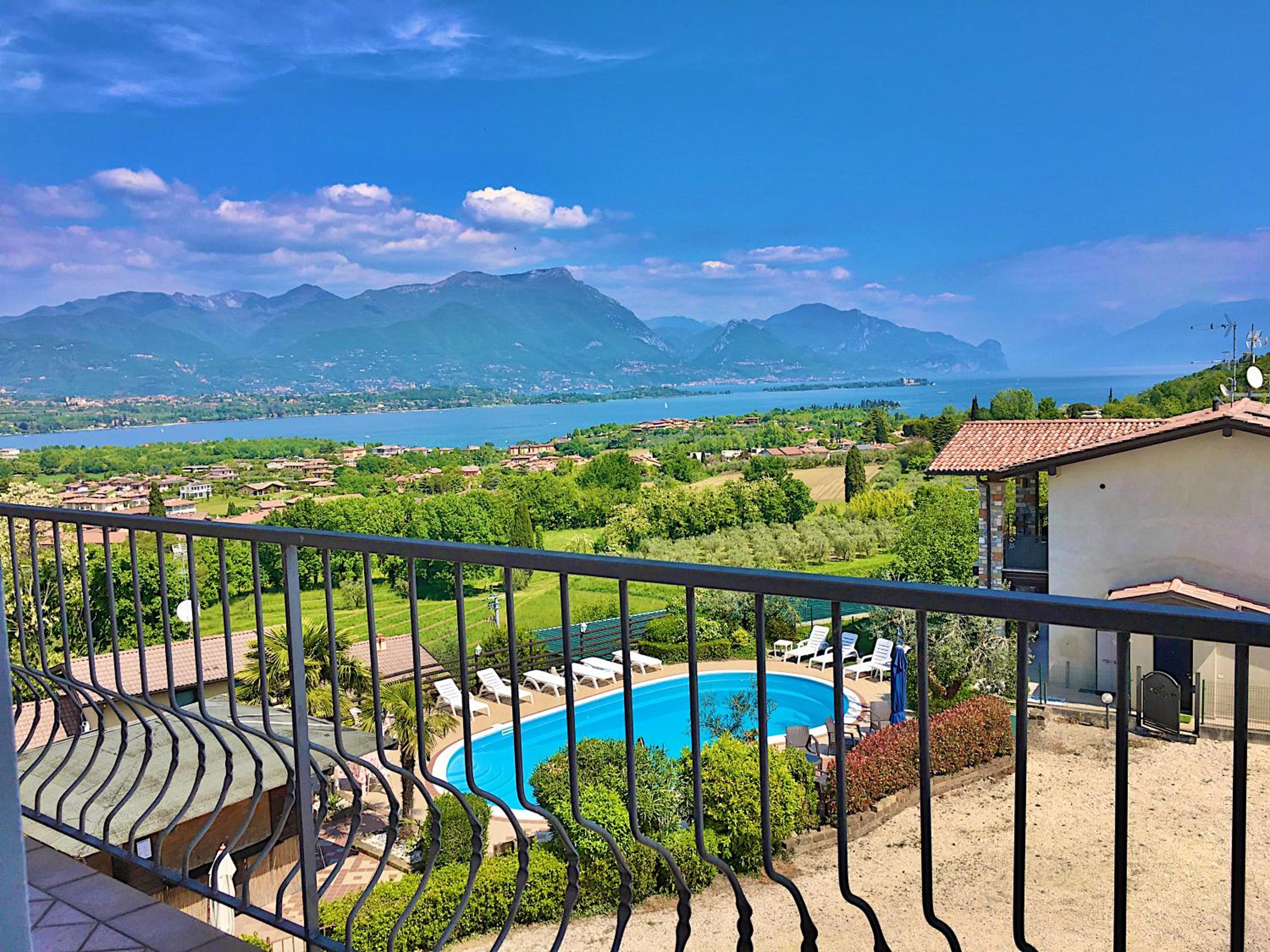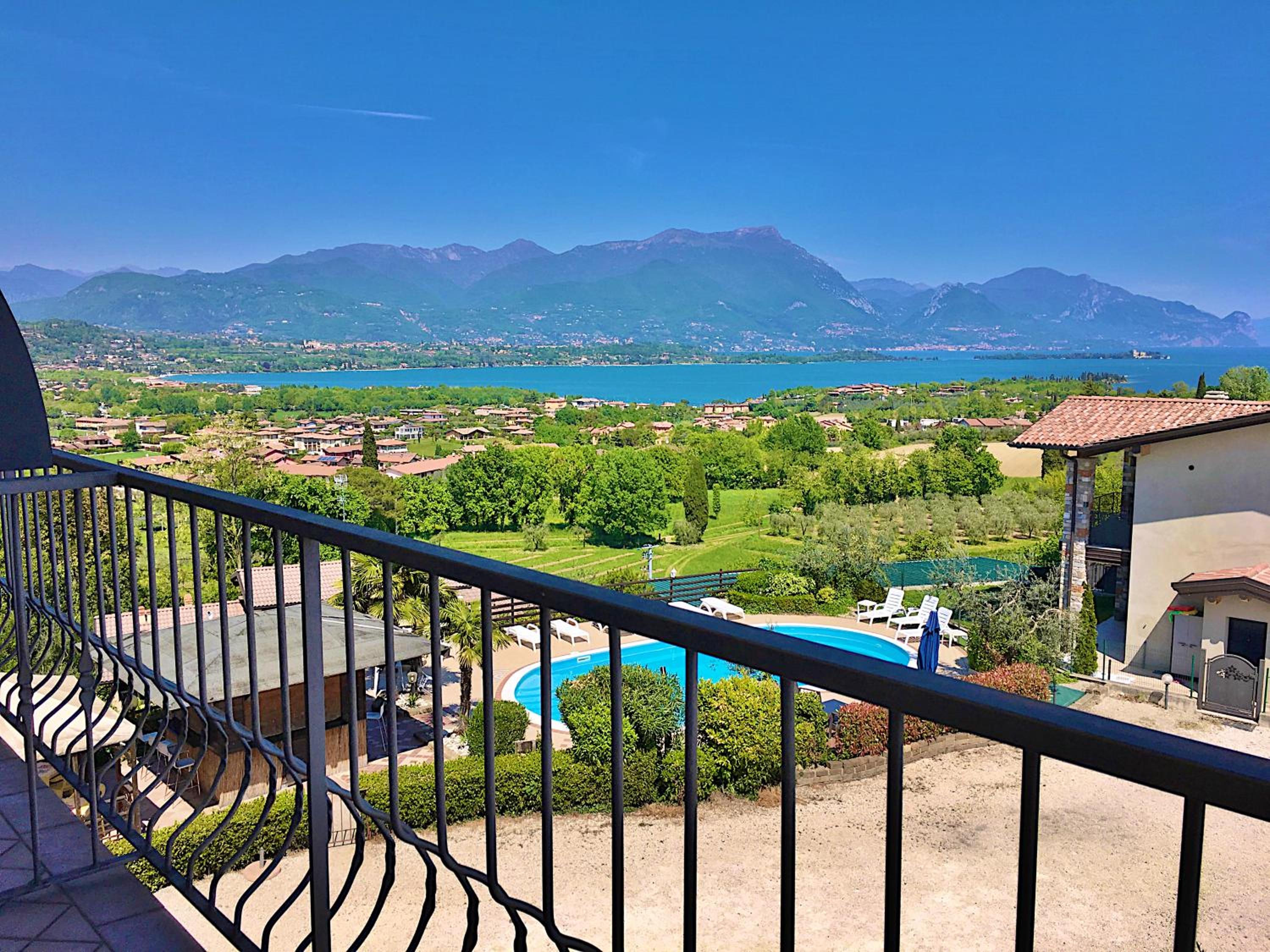 schöner Blick vom Poolbereich auf den Gardasee, sehr günstige Lage zu Gaststätten und Einkauf