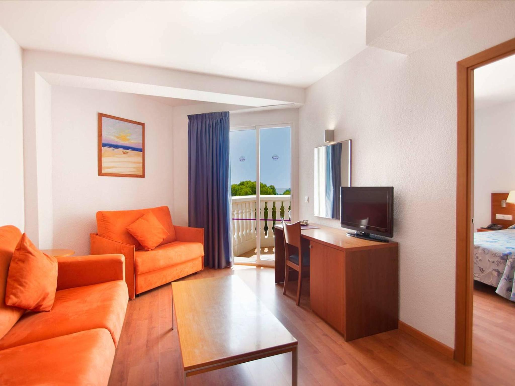 At Hotel Servigroup Romana, indulge in spacious rooms with large windows offering picturesque views of Romana Beach. Family rooms come with extra comfort including a seating area and kitchenette. Enjoy the summer breeze with available air conditioning.